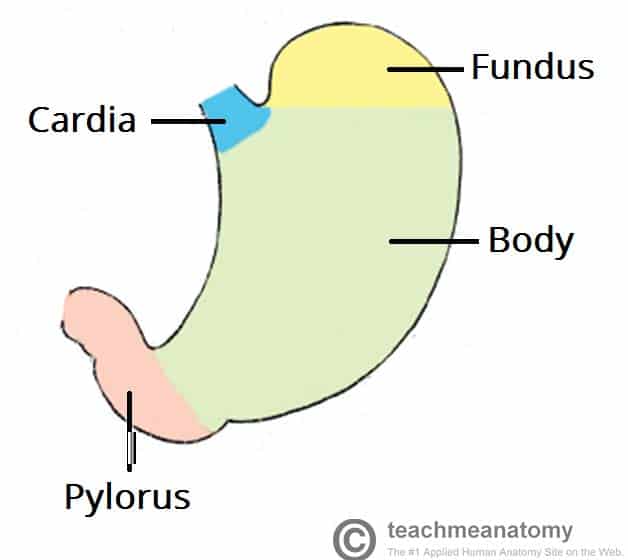 The stomach, is an intraperitoneal digestive organ located between the oesophagus and the duodenum. It has a ‘J’ shape, and features a lesser and greater curvature. The anterior and posterior surfaces are smoothly rounded with a peritoneal covering. In this article, we shall look at the anatomy of the stomach – its position, structure and neurovascular supply. Pro Feature - 3D Model You've Discovered a Pro Feature Access our 3D Model Library Explore, cut, dissect, annotate and manipulate our 3D models to visualise anatomy in a dynamic, interactive way. Learn More Anatomical Position The stomach lies within the superior aspect of the abdomen. It primarily lies in the epigastric and umbilical regions, however, the exact size, shape and position of the stomach can vary from person to person and with position and respiration. Pro Feature - Dissection Atlas Dissection of the thorax, demonstrating the passage of the oesophagus, inferior vena cava and descending aorta through the diaphragm. Note how the right crus of the diaphragm has a 'pinch-cock' effect on the oesophagus to form the lower oesophageal sphincter Dissection of the thorax, demonstrating the passage of the oesophagus, inferior vena cava and descending aorta through the diaphragm. Note how the right crus of the diaphragm has a 'pinch-cock' effect on the oesophagus to form the lower oesophageal sphincter You've Discovered a Pro Feature Access our Dissection Image Library Enhance your understanding with high-resolution dissection images showcasing real-life anatomy. Learn More Anatomical Structure Divisions of the Stomach The stomach has four main anatomical divisions; the cardia, fundus, body and pylorus: Cardia – surrounds the superior opening of the stomach at the T11 level. Fundus – the rounded, often gas filled portion superior to and left of the cardia. Body – the large central portion inferior to the fundus. Pylorus – This area connects the stomach to the duodenum. It is divided into the pyloric antrum, pyloric canal and pyloric sphincter. The pyloric sphincter demarcates the transpyloric plane at the level of L1. By TeachMeSeries Ltd (2025) Fig 1The parts of the stomach. Greater and Lesser Curvatures The medial and lateral borders of the stomach are curved, forming the lesser and greater curvatures: Greater curvature – forms the long, convex, lateral border of the stomach. Arising at the cardiac notch, it arches backwards and passes inferiorly to the left. It curves to the right as it continues medially to reach the pyloric antrum. The short gastric arteries and the right and left gastro-omental arteries supply branches to the greater curvature. Lesser curvature – forms the shorter, concave, medial surface of the stomach. The most inferior part of the lesser curvature, the angular notch, indicates the junction of the body and pyloric region. The lesser curvature gives attachment to the hepatogastric ligament and is supplied by the left gastric artery and right gastric branch of the hepatic artery. By TeachMeSeries Ltd (2025) Fig 2The greater and lesser curvatures of the stomach Anatomical Relations The anatomical relations of the stomach are given in the table below: Anatomical Relation Structures Superior Oesophagus and left dome of the diaphragm Anterior Diaphragm, greater omentum, anterior abdominal wall, left lobe of liver, gall bladder Posterior Lesser sac, pancreas, left kidney, left adrenal gland, spleen, splenic artery, transverse mesocolon Sphincters of the Stomach There are two sphincters of the stomach, located at each orifice. They control the passage of material entering and exiting the stomach. Inferior Oesophageal Sphincter The oesophagus passes through the diaphragm through the oesophageal hiatus at the level of T10. It descends a short distance to the inferior oesophageal sphincter at the T11 level which marks the transition point between the oesophagus and stomach (in contrast to the superior oesophageal sphincter, located in the pharynx). It allows food to pass through the cardiac orifice and into the stomach and is not under voluntary control. Pyloric Sphincter The pyloric sphincter lies between the pylorus and the first part of the duodenum. It controls of the exit of chyme (food and gastric acid mixture) from the stomach. In contrast to the inferior oesophageal sphincter, this is an anatomical sphincter. It contains smooth muscle, which constricts to limit the discharge of stomach contents through the orifice. Emptying of the stomach occurs intermittently when intragastric pressure overcomes the resistance of the pylorus. The pylorus is normally contracted so that the orifice is small and food can stay in the stomach for a suitable period. Gastric peristalsis pushes the chyme through the pyloric canal into the duodenum for further digestion. By TeachMeSeries Ltd (2025)Fig 3The peristaltic ejection waves of the stomach Greater and Lesser Omenta Within the abdominal cavity, a double layered membrane called the peritoneum. supports most of the abdominal viscera and assists with their attachment to the abdominal wall. The greater and lesser omenta are two structures that consist of peritoneum folded over itself (two layers of peritoneum – four membrane layers). Both omenta attach to the stomach, and are useful anatomical landmarks: Greater omentum – hangs down from the greater curvature of the stomach and folds back upon itself where it attaches to the transverse colon It contains many lymph nodes and may adhere to inflamed areas , therefore playing a key role in gastrointestinal immunity and minimising the spread of intraperitoneal infections. Lesser omentum– continuous with peritoneal layers of the stomach and duodenum, this smaller peritoneal fold arises at the lesser curvature and ascend to attach to the liver. The main function of the lesser omentum is to attach the stomach and duodenum to the liver. Together, the greater and lesser omenta divide the abdominal cavity into two; t
