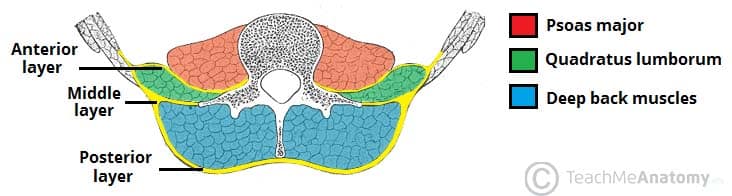 The Posterior Abdominal Wall - Podcast Version TeachMeAnatomy 0:00 / 0:00 1x 0.25x 0.5x 0.75x 1x 1.25x 1.5x 1.75x 2x The posterior abdominal wall is a complex region of anatomy. It is formed by the lumbar vertebrae, pelvic girdle, posterior abdominal muscles and their associated fascia. Major vessels, nerves and organs are located on the inner surface of the posterior abdominal wall. In this article, we shall look at the anatomy of the posterior abdominal wall – including muscles, fascial layers and clinical correlations. Pro Feature - 3D Model You've Discovered a Pro Feature Access our 3D Model Library Explore, cut, dissect, annotate and manipulate our 3D models to visualise anatomy in a dynamic, interactive way. Learn More Posterior Abdominal Muscles There are five muscles in the posterior abdominal wall: the iliacus, psoas major, psoas minor, quadratus lumborum and the diaphragm. We shall look at the attachments, actions and innervation of these muscles in more detail. Quadratus Lumborum The quadratus lumborum muscle is located laterally in the posterior abdominal wall. It is a thick muscular sheet which is quadrilateral in shape. The muscle is located posterior to the psoas major. Attachments: Originates from the iliac crest and iliolumbar ligament. The fibres travel superomedially, inserting onto the transverse processes of L1 – L4 and the inferior border of the 12th rib. Actions: Extension and lateral flexion of the vertebral column. It also fixes the 12th rib during inspiration, so that the contraction of diaphragm is more efficient. Innervation: Anterior rami of T12 – L4 nerves. By TeachMeSeries Ltd (2025) Fig 1The quadratus lumborum of the posterior abdominal wall. Psoas Major The psoas major is located near the midline of the posterior abdominal wall, immediately lateral to the lumbar vertebrae. Attachments: Originates from the transverse processes and vertebral bodies of T12 – L5. It then moves inferiorly and laterally, running deep to the inguinal ligament, and attaching to the lesser trochanter of the femur. Actions: Flexion of the thigh at the hip and lateral flexion of the vertebral column. Innervation: Anterior rami of L1 – L3 nerves. By TeachMeSeries Ltd (2025) Fig 2Muscles of the posterior abdominal wall. Psoas Minor The psoas minor muscle is only present in 60% of the population. It is located anterior to the psoas major. Attachments: Originates from the vertebral bodies of T12 and L1 and attaches to a ridge on the superior ramus of the pubic bone, known as the pectineal line. Actions: Flexion of the vertebral column. Innervation: Anterior rami of the L1 spinal nerve. Iliacus The iliacus muscle is a fan-shaped muscle that is situated inferiorly on the posterior abdominal wall. It combines with the psoas major to form the iliopsoas – the major flexor of the thigh. Attachments: Originates from the surface of the iliac fossa and anterior inferior iliac spine. Its fibres combine with the tendon of the psoas major, inserting into the lesser trochanter of the femur. Actions: Flexion and lateral rotation of the thigh at the hip joint. Innervation: Femoral nerve (L2 – L4). Diaphragm The posterior aspect of the diaphragm is considered to be part of the posterior abdominal wall. It is described in detail here. Clinical Relevance Psoas Sign The psoas sign is a medical sign that indicates irritation to the iliopsoas group of muscles. The sign is elicited by flexion of the thigh at the hip. The test is positive if the patient reports lower abdominal pain. A right sided psoas sign is an indication of appendicitis. As the iliopsoas contracts, it comes into contact with the inflamed appendix, producing pain. Pro Feature - Dissection Atlas The lumbar plexus, femoral nerve and muscles of the posterior abdominal wall. The lumbar plexus, femoral nerve and muscles of the posterior abdominal wall. You've Discovered a Pro Feature Access our Dissection Image Library Enhance your understanding with high-resolution dissection images showcasing real-life anatomy. Learn More Fascia of the Posterior Abdominal Wall A layer of fascia (sheet of connective tissue) lies between the parietal peritoneum and the muscles of the posterior abdominal wall. This fascia is continuous with the transversalis fascia of the anterolateral abdominal wall. Whilst the fascia is one continuous sheet, it is anatomically correct to name the fascia according to the structure it overlies. Psoas Fascia The psoas fascia covers the psoas major muscle. It is attached to the lumbar vertebrae medially, continuous with the thoracolumbar fascia laterally and continuous with the iliac fascia inferiorly Thoracolumbar fascia The thoracolumbar fascia consists of the three layers; posterior, middle and anterior. Muscles are enclosed between these layers: Quadratus lumborum – between the anterior and middle layers. Deep back muscles – between the middle and posterior layers. The posterior layer extends between the 12th rib and the iliac crest posteriorly. Laterally the fascia meets the internal oblique and transversus abdominis muscles, but not the external oblique. As it forms these attachments it covers the latissimus dorsi. The anterior layer attaches to the anterior aspect of the transverse processes of the lumbar vertebrae, the 12th rib and the iliac crest. Laterally the fascia is continuous with the aponeurotic origin of the transversus abdominis muscle. Superiorly the fascia thickens to become the lateral arcuate ligament, which joins the iliolumbar ligaments inferiorly. By TeachMeSeries Ltd (2025) Fig 3The layers of thoracolumbar fascia. Do you think you’re ready? Take the quiz below Pro Feature - Quiz The Posterior Abdominal Wall Question 1 of 3 Submitting... Skip Next Rate question: You scored 0% Skipped: 0/3 1800 More Questions Available Upgrade to TeachMeAnatomy Pro Challenge yourself with over 1800 multiple-choice questions to reinforce learning Learn More Rate This Article