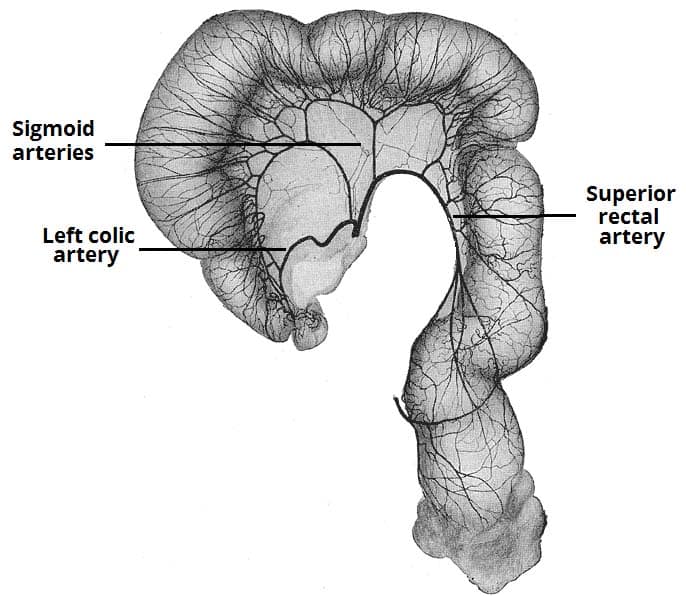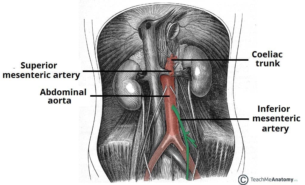 The Inferior Mesenteric Artery - Podcast Version TeachMeAnatomy 0:00 / 0:00 1x 0.25x 0.5x 0.75x 1x 1.25x 1.5x 1.75x 2x The inferior mesenteric artery (IMA) is a major branch of the abdominal aorta. It supplies arterial blood to the organs of the hindgut – the distal 1/3 of the transverse colon, splenic flexure, descending colon, sigmoid colon and rectum. In this article, we shall look at the anatomy of the inferior mesenteric artery – its anatomical position, major branches and clinical correlations. Pro Feature - 3D Model You've Discovered a Pro Feature Access our 3D Model Library Explore, cut, dissect, annotate and manipulate our 3D models to visualise anatomy in a dynamic, interactive way. Learn More Anatomical Position The inferior mesenteric artery is the last of the three major anterior branches of the abdominal aorta (the other two are the coeliac trunk and superior mesenteric artery). It arises at the L3 vertebral level, approximately 3–4 cm above the aortic bifurcation into the common iliac arteries After arising from the aorta, the inferior mesenteric artery descends anterior to its parent vessel before angling to the left. It is a retroperitoneal structure, lying behind the peritoneum By TeachMeSeries Ltd (2025) Fig 1The origin of the inferior mesenteric artery from the abdominal aorta. It is the third major branch. Pro Feature - Dissection Atlas Inferior mesenteric artery and major branches. Note the marginal artery, which forms an anastamostic network with the superior mesenteric artery. Inferior mesenteric artery and major branches. Note the marginal artery, which forms an anastamostic network with the superior mesenteric artery. You've Discovered a Pro Feature Access our Dissection Image Library Enhance your understanding with high-resolution dissection images showcasing real-life anatomy. Learn More Major Branches The branches of the inferior mesenteric artery supply the derivatives of the embryonic hindgut: the distal third of the transverse colon, splenic flexure, descending colon, sigmoid colon and upper rectum. There are three principal branches: Left colic artery Sigmoid arteries Superior rectal artery Left Colic Artery The left colic artery is the first branch of the IMA. It supplies the distal 1/3 of the transverse colon and the descending colon. After arising from its parent artery, it travels anteriorly to the psoas major muscle, left ureter and left internal spermatic vessels, before dividing into ascending and descending branches: Ascending branch – crosses the left kidney anteriorly, before entering the mesentery of the transverse colon, moving superiorly. It supplies the distal 1/3 of the transverse colon, and the upper aspect of the descending colon. Descending branch – moves inferiorly to supply the lower part of the descending colon. It anastomoses with the superior sigmoid artery. Sigmoid Arteries The sigmoid arteries supply the descending colon and the sigmoid colon. There are typically 2-4 branches, with the uppermost branch termed the superior sigmoid artery. They run inferiorly, obliquely and to the left, crossing over the psoas major, left ureter and left internal spermatic vessels. Superior Rectal Artery The superior rectal artery is a continuation of the inferior mesenteric artery, supplying the rectum. It descends into the pelvis, crossing the left common iliac artery and vein. At the S3 vertebral level, the artery divides into two terminal branches – one supplying each side of the rectum. Within the walls of the rectum, smaller divisions of these branches eventually communicate with the middle and inferior rectal arteries. By TeachMeSeries Ltd (2025) Fig 2The major branches of the IMA supplying the sigmoid colon and rectum. Clinical Relevance Left Hemicolectomy A left hemicolectomy is the surgical resection (removal) of the descending colon. It can be performed for a variety of reasons such as removal of colon cancer, treatment of diverticulitis, inflammatory bowel disease or trauma. During the procedure, the surgeon must dissect the branches of the inferior mesenteric artery. They do this by shining a light through the mesentery to identify the IMA and inferior mesenteric vein (note that the IMV follows a different course than the IMA). They then trace the artery back to the aorta and divide it proximally. Anastomoses There are two major anastomoses of the IMA, both involving a union with branches of the superior mesenteric artery: Marginal artery (of Drummond) – forms a continuous arterial circle along the inner border of the colon. Straight vessels (vasa recta) arise from the artery to supply the colon. It is formed by the union of several branches; the ileocolic, right colic and middle colic of the SMA and left colic and sigmoid branches of the IMA. Arc of Riolan – anastomosis between the middle colic branch of SMA and the left colic branch of IMA. It is less common than the marginal artery, and indeed its existence has been questioned by some surgeons. The splenic flexure is considered a watershed area – a transitional zone between the terminal branches of the superior mesenteric artery and inferior mesenteric artery. Because it receives relatively limited supply from each vessel, its perfusion is poorer than areas with a single dominant artery. This makes it particularly susceptible to ischaemia, especially if either artery becomes compromised. By TeachMeSeries Ltd (2025) Fig 3The marginal artery of Drummond. Clinical Relevance Horseshoe Kidney Horseshoe kidney is a congenital disorder where the kidneys fuse together, forming a horseshoe shape. It affects 1/400, and is more common in males. During embryonic development, the kidneys ascend from the pelvis to their position in the abdomen. In a patient with horseshoe kidney, the fused kidney becomes hooked underneath the inferior mesenteric artery, and is stuck in the lower abdomen. It does not require any treatment, and is often asymptomatic. However, complications can occu