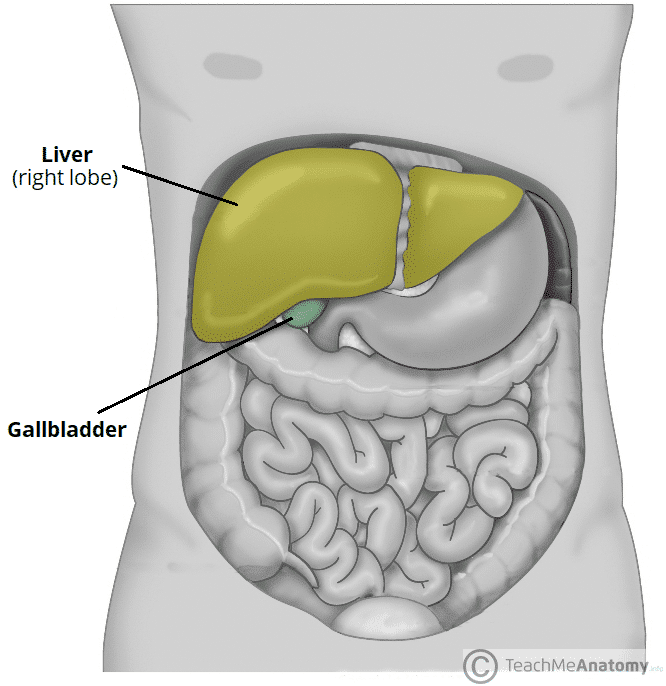 The Gallbladder - Podcast Version TeachMeAnatomy 0:00 / 0:00 1x 0.25x 0.5x 0.75x 1x 1.25x 1.5x 1.75x 2x The gallbladder is a gastrointestinal organ located within the right hypochondrial region of the abdomen. This intraperitoneal, pear-shaped sac lies within a fossa formed between the inferior aspects of the right and quadrate lobes of the liver. The primary function of the gallbladder is to concentrate and store bile which is produced by the liver. As part of the gustatory response, the stored bile is then released from the gallbladder in response to cholecystokinin. In this article, we shall look at the anatomy of the gallbladder – its structure, vasculature, innervation and lymphatic supply. Pro Feature - 3D Model You've Discovered a Pro Feature Access our 3D Model Library Explore, cut, dissect, annotate and manipulate our 3D models to visualise anatomy in a dynamic, interactive way. Learn More Anatomical Relations The gallbladder is entirely surrounded by peritoneum, and is in direct relation to the visceral surface of the liver. It lies in close proximity to the following structures: Anteriorly and superiorly – inferior border of the liver and the anterior abdominal wall. Posteriorly – transverse colon and the proximal duodenum. Inferiorly – biliary tree and remaining parts of the duodenum. By TeachMeSeries Ltd (2025) Fig 1The gallbladder is related to the inferior surface of the liver. Pro Feature - Dissection Atlas Prosection of the liver, stomach, transverse colon within the abdominal cavity. The small intestine and colon are covered by the greater omentum and are not visible in this specimen. Prosection of the liver, stomach, transverse colon within the abdominal cavity. The small intestine and colon are covered by the greater omentum and are not visible in this specimen. You've Discovered a Pro Feature Access our Dissection Image Library Enhance your understanding with high-resolution dissection images showcasing real-life anatomy. Learn More Anatomical Structure The gallbladder has a storage capacity of 30-50ml and, in life, lies anterior to the first part of the duodenum. It is typically divided into three parts: Fundus – the rounded, distal portion of the gallbladder. It projects into the inferior surface of the liver in the mid-clavicular line. Body – the largest part of the gallbladder. It lies adjacent to the posteroinferior aspect of the liver, transverse colon and superior part of the duodenum. Neck – the gallbladder tapers to become continuous with the cystic duct, leading into the biliary tree. The neck contains a mucosal fold, known as Hartmann’s Pouch. This is a common location for gallstones to become lodged, causing cholestasis. By TeachMeSeries Ltd (2025) Fig 2The parts of the gallbladder and proximal biliary tree. The Biliary Tree The biliary tree is a series of gastrointestinal ducts allowing newly synthesised bile from the liver to be concentrated and stored in the gallbladder (prior to release into the duodenum). Bile is initially secreted from hepatocytes and drains from both lobes of the liver via canaliculi, intralobular ducts and collecting ducts into the left and right hepatic ducts. These ducts amalgamate to form the common hepatic duct, which runs alongside the hepatic vein. As the common hepatic duct descends, it is joined by the cystic duct – which allows bile to flow in and out of the gallbladder for storage and release. At this point, the common hepatic duct and cystic duct combine to form the common bile duct. The common bile duct descends and passes posteriorly to the first part of the duodenum and head of the pancreas. Here, it is joined by the main pancreatic duct, forming the hepatopancreatic ampulla (commonly known as the ampulla of Vater) – which then empties into the duodenum via the major duodenal papilla. This papilla is regulated by a muscular valve, the sphincter of Oddi. By TeachMeSeries Ltd (2025) Fig 3Overview of the biliary tree. Vasculature The arterial supply to the gallbladder is via the cystic artery – a branch of the right hepatic artery (which itself is derived from the common hepatic artery, one of the three major branches of the coeliac trunk). Venous drainage of the neck of the gallbladder is via the cystic veins, which drain directly into the portal vein. Venous drainage of the fundus and body of the gallbladder flows into the hepatic sinusoids. By TeachMeSeries Ltd (2025) Fig 4Arterial supply to the gallbladder view the cystic artery. Innervation The gallbladder receives parasympathetic, sympathetic and sensory innervation. The coeliac plexus carries sympathetic and sensory fibres, while the vagus nerve delivers parasympathetic innervation. Parasympathetic stimulation produces contraction of the gallbladder, and the secretion of bile into the cystic duct due to relaxation of the sphincter of Oddi. The majority of this response however, is mediated by circulating cholecystokinin as part of the gustatory response. Lymph Drainage Lymph from the gallbladder drains into the cystic lymph nodes, situated at the gallbladder neck. The cystic nodes then empty into the hepatic lymph nodes, and ultimately, the coeliac lymph nodes. Clinical Relevance Gallstones Cholelithiasis, commonly known as gallstones, are small lumps of cholesterol, bile salts or a mixture of the two, which may form within the gallbladder. They are relatively common and often asymptomatic. However, they may be associated with pain, jaundice and systemic upset (depending on the location of the gallstone, and the presence or absence of associated infection or inflammation). Different terminologies are applied to distinguish between these pathologies: Cholelithiasis – uncomplicated gallstones Biliary colic – typically right upper quadrant pain following a fatty meal as gallstones obstruct the cystic duct during contraction of the gallbladder. Not associated with systemic upset Cholecystitis – inflammation of the gallbladder. Pain is ofte