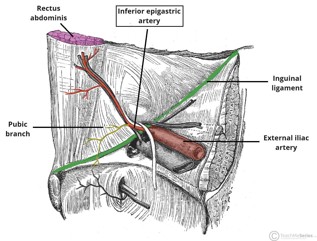 Inferior Epigastric Artery - Podcast Version TeachMeAnatomy 0:00 / 0:00 1x 0.25x 0.5x 0.75x 1x 1.25x 1.5x 1.75x 2x The inferior epigastric artery is an artery of the anterior abdominal wall. It arises from the external iliac artery. It contributes to the blood supply of the muscles, subcutaneous tissue and skin of the anterior abdominal wall. Pro Feature - 3D Model You've Discovered a Pro Feature Access our 3D Model Library Explore, cut, dissect, annotate and manipulate our 3D models to visualise anatomy in a dynamic, interactive way. Learn More Course The inferior epigastric artery arises from the external iliac artery, immediately superior to the inguinal ligament. After its origin, the inferior epigastric artery travels superiorly in an oblique path, passing the medial border of the deep inguinal ring. It then pierces the transversalis fascia to travel within the rectus sheath, posterior to the rectus abdominis muscle. It gives rise to several branches along its course, including the cremasteric artery, pubic branch and muscular branches. At the level of the umbilicus, the inferior epigastric artery terminates by dividing into numerous branches which anastomose with the superior epigastric artery. Note: As it passes the deep inguinal ring, the inferior epigastric artery forms the lateral border of Hesselbach’s triangle – the anatomical landmark for the site of direct inguinal hernia formation. By TeachMeSeries Ltd (2025) Fig 1The origin of the inferior epigastric artery from the external iliac artery, immediately superior to the inguinal ligament. By TeachMeSeries Ltd (2025) Fig 2Course of the inferior epigastric artery after its origin from the external iliac artery. Pro Feature - Dissection Atlas Dissection of the inferior epigastric artery arising from the external iliac artery. It then ascends on the posterior surface of the rectus abdominis. Dissection of the inferior epigastric artery arising from the external iliac artery. It then ascends on the posterior surface of the rectus abdominis. You've Discovered a Pro Feature Access our Dissection Image Library Enhance your understanding with high-resolution dissection images showcasing real-life anatomy. Learn More Supply The inferior epigastric artery gives rise to the following branches: Muscular branches – supply the parietal peritoneum, muscles of the anterior abdominal wall, subcutaneous tissue and skin. Cremasteric artery – supplies the cremaster muscle and spermatic cord. Public branch – supplies the pubic bones and pubic symphysis. By OpenStax [CC BY 4.0], via Wikimedia Commons Fig 3The muscles of the anterolateral abdominal wall. Note how the flat muscles form aponeuroses medially. Rate This Article