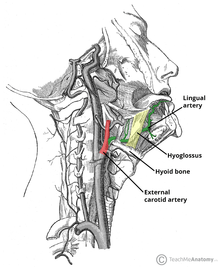 Lingual Artery - Podcast Version TeachMeAnatomy 0:00 / 0:00 1x 0.25x 0.5x 0.75x 1x 1.25x 1.5x 1.75x 2x The lingual artery is an artery of the head and neck region. It is the third major branch of the external carotid artery. It is responsible for the blood supply to the tongue and floor of the mouth. Pro Feature - 3D Model You've Discovered a Pro Feature Access our 3D Model Library Explore, cut, dissect, annotate and manipulate our 3D models to visualise anatomy in a dynamic, interactive way. Learn More Course The lingual artery originates from the anteromedial aspect of the external carotid artery at the level of the hyoid bone (C3). It ascends medially along the surface of the middle pharyngeal constrictor muscle. It then passes deep to the hypoglossal nerve, stylohyoid muscle and posterior belly of the digastric. The lingual artery enters the tongue by passing deep to the hyoglossus muscle. It terminates by dividing into deep lingual and sublingual branches within the substance of the tongue, By TeachMeSeries Ltd (2025) Fig 1The lingual artery is the third major branch of the external carotid artery. Supply The lingual artery supplies structures in the head and neck via four main branches: Suprahyoid branch – supplies the suprahyoid muscles of the neck. Dorsal lingual branches – supply the posterior tongue, soft palate, palatine tonsil and epiglottis. Sublingual branch – supplies the sublingual gland, mylohyoid muscle, and floor of the mouth. Deep lingual branch – supplies the tongue. By TeachMeSeries Ltd (2025) Fig 2Major branches of the lingual artery. Rate This Article