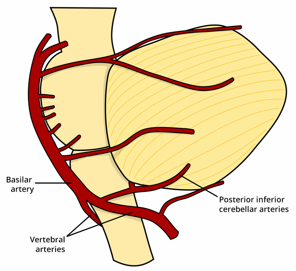 Posterior Inferior Cerebellar Artery - Podcast Version TeachMeAnatomy 0:00 / 0:00 1x 0.25x 0.5x 0.75x 1x 1.25x 1.5x 1.75x 2x The posterior inferior cerebellar artery (PICA) is an artery of the hindbrain. It is the largest branch of the vertebral artery. It supplies blood to the inferior cerebellum, medulla oblongata, and parts of the fourth ventricle. Pro Feature - 3D Model You've Discovered a Pro Feature Access our 3D Model Library Explore, cut, dissect, annotate and manipulate our 3D models to visualise anatomy in a dynamic, interactive way. Learn More Course The posterior inferior cerebellar artery arises from the vertebral artery at the level of the medulla oblongata. From here, it ascends posteriorly, passing behind the origin of the glossopharyngeal and vagus nerves to reach the inferior border of the pons. It then curves medially and descends along the margin of the fourth ventricle, before turning laterally into the cerebellomedullary fissure (the space between the cerebellum and medulla). Within the fissure, the PICA divides into two main terminal branches: Medial branch – courses along the inferior vermis (midline of the cerebellum), supplying the cerebellum and adjacent medullary structures. Lateral branch – extends over the inferior surface of the cerebellar hemisphere, supplying the cerebellar cortex and tonsils. Adapted from work by Petit B [CC BY-SA 4.0], via Wikimedia Commons Fig 1The origin of the posterior inferior cerebellar artery from the vertebral artery. Supply The posterior inferior cerebellar artery supplies the following structures: Dorsolateral medulla Inferior surface of the cerebellum, including the tonsils and vermis Choroid plexus of the fourth ventricle Rate This Article
