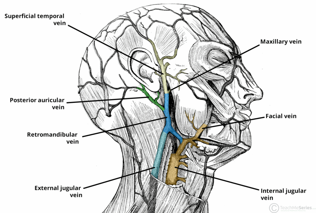 Retromandibular Vein - Podcast Version TeachMeAnatomy 0:00 / 0:00 1x 0.25x 0.5x 0.75x 1x 1.25x 1.5x 1.75x 2x The retromandibular vein is a venous structure of the head and neck. It is formed by the union of the maxillary and superficial temporal veins and serves as a key connection between the internal and external jugular veins. Pro Feature - 3D Model You've Discovered a Pro Feature Access our 3D Model Library Explore, cut, dissect, annotate and manipulate our 3D models to visualise anatomy in a dynamic, interactive way. Learn More Course The retromandibular vein is formed within or deep to the parotid gland by the confluence of the maxillary vein (drains the pterygoid venous plexus) and the superficial temporal vein (drains the temporal scalp). It descends within the substance of the parotid gland and then divides into two branches near the inferior border of the gland. Anterior division – joins the facial vein, forming the common facial vein, which drains into the internal jugular vein deep to the sternocleidomastoid muscle. Posterior division – joins the posterior auricular vein to form the external jugular vein, which runs superficial to sternocleidomastoid. Occasionally, the posterior division may drain directly into the external jugular vein. By TeachMeSeries Ltd (2025) Fig 1Course and tributaries of the retromandibular vein. Pro Feature - Dissection Atlas Anatomy of the parotid region with the parotid gland removed. Anatomy of the parotid region with the parotid gland removed. You've Discovered a Pro Feature Access our Dissection Image Library Enhance your understanding with high-resolution dissection images showcasing real-life anatomy. Learn More Drainage The retromandibular vein drains the deep face, infratemporal region, and temporal scalp via its two main tributaries: Maxillary vein – drains the pterygoid venous plexus, which receives blood from the deep face, orbit, and muscles of mastication. Superficial temporal vein – drains the temporal region of the scalp and lateral forehead. It ultimately empties into both the internal and external jugular veins through its anterior and posterior divisions. Rate This Article
