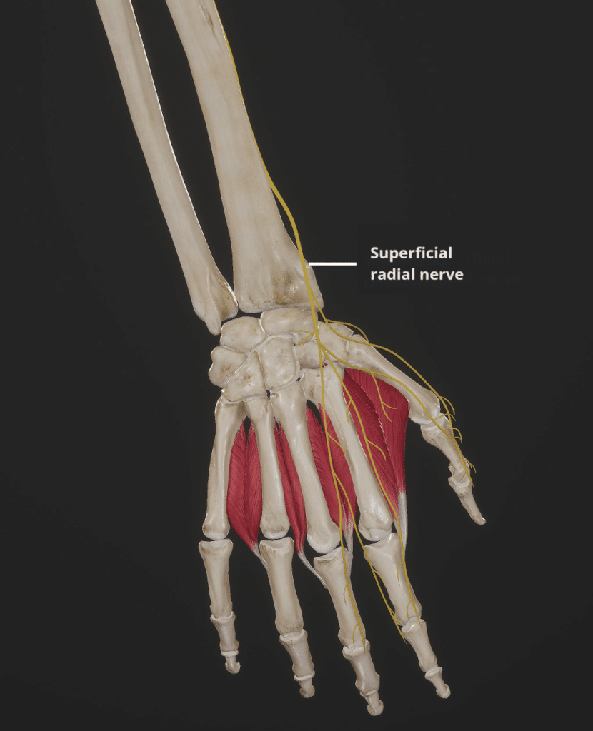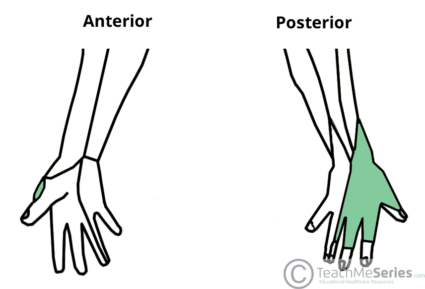 Superficial Radial Nerve - Podcast Version TeachMeAnatomy 0:00 / 0:00 1x 0.25x 0.5x 0.75x 1x 1.25x 1.5x 1.75x 2x The superficial radial nerve is a sensory nerve branch of the radial nerve that arises in the cubital fossa. It supplies sensory cutaneous innervation to the lateral portion of the dorsum of the hand. Pro Feature - 3D Model You've Discovered a Pro Feature Access our 3D Model Library Explore, cut, dissect, annotate and manipulate our 3D models to visualise anatomy in a dynamic, interactive way. Learn More Course The superficial radial nerve originates in the cubital fossa as the radial nerve divides into superfical and deep branches at the level of the lateral epicondyle. It continues down the anterior aspect of the forearm, lateral to the radial artery, and concealed in a plane between the brachioradialis and pronator teres muscles. About 7cm proximal to the wrist, it pierces the deep fascia of the forearm to wind around the radius, pass over the anatomical snuffbox, and branch off into the dorsum of the hand. By TeachMeSeries Ltd (2025) Fig 1The superficial branch of the radial nerve. Adobe Stock, Licensed to TeachMeSeries Ltd Fig 2Dorsal course of the supeficial radial nerve in the distal forearm and hand. Pro Feature - Dissection Atlas Prosection of the radial nerve in the forearm. It divides into superficial and deep branches within the proximal forearm. Prosection of the radial nerve in the forearm. It divides into superficial and deep branches within the proximal forearm. You've Discovered a Pro Feature Access our Dissection Image Library Enhance your understanding with high-resolution dissection images showcasing real-life anatomy. Learn More Sensory Functions The superficial radial nerve is a purely cutaneous sensory nerve. It has four dorsal digital branches which supply: Dorsal skin on lateral side of the hand Proximal dorsal surfaces of the thumb, index, and lateral half of the middle finger. By TeachMeSeries Ltd (2025) Fig 3Cutaneous innervation of the superficial branch of the radial nerve. Rate This Article