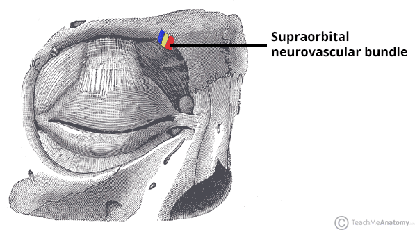 Supraorbital Nerve - Podcast Version TeachMeAnatomy 0:00 / 0:00 1x 0.25x 0.5x 0.75x 1x 1.25x 1.5x 1.75x 2x The supraorbital nerve is a nerve of the head and neck region. It is the largest branch of the frontal nerve and supplies the skin of the forehead and scalp. Pro Feature - 3D Model You've Discovered a Pro Feature Access our 3D Model Library Explore, cut, dissect, annotate and manipulate our 3D models to visualise anatomy in a dynamic, interactive way. Learn More Course The supraorbital nerve arises as a terminal branch of the frontal nerve (itself a branch of the ophthalmic division of the trigeminal nerve) within the roof of the bony orbit. It follows the levator palpebrae superioris muscle and then leaves the orbit via the supraorbital foramen, located at the superior aspect of the orbital rim. The supraorbital nerve emerges onto the forehead (accompanied by the supraorbital artery) and divides into sensory branches that supply the forehead and scalp. By TeachMeSeries Ltd (2025) Fig 1Course of the supraorbital nerve through the orbit. By TeachMeSeries Ltd (2025) Fig 2The supraorbital nerve leaving the orbit and emerging onto the forehead at the superior aspect of the orbital rim. Sensory Supply The supraorbital nerve supplies sensation to the following structures: Mucosal lining of the frontal sinus Skin and conjunctiva of the upper eyelid Skin and pericranium of the forehead and scalp (as far backwards as the vertex) Rate This Article