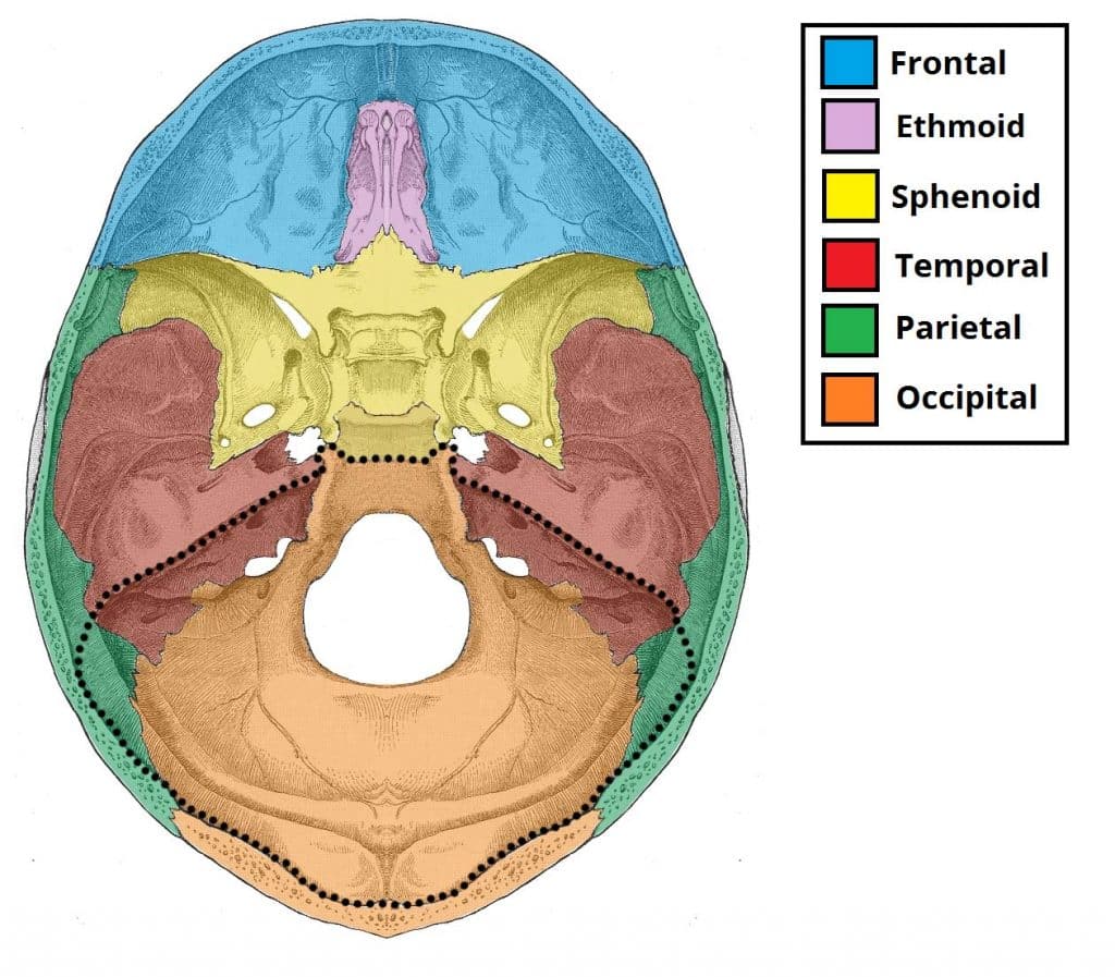 The Posterior Cranial Fossa - Podcast Version TeachMeAnatomy 0:00 / 0:00 1x 0.25x 0.5x 0.75x 1x 1.25x 1.5x 1.75x 2x The floor of the cranial cavity is divided into three distinct depressions. They are known as the anterior cranial fossa, middle cranial fossa and posterior cranial fossa. Each fossa accommodates a different part of the brain. The posterior cranial fossa is the most posterior and deep of the three cranial fossae. It accommodates the brainstem and cerebellum. In this article, we shall look at the borders, contents and clinical correlations of the posterior cranial fossa. Pro Feature - 3D Model You've Discovered a Pro Feature Access our 3D Model Library Explore, cut, dissect, annotate and manipulate our 3D models to visualise anatomy in a dynamic, interactive way. Learn More Borders The posterior cranial fossa is comprised of three bones: the occipital bone and the two temporal bones. It is bounded as follows: Anteromedial – dorsum sellae of the sphenoid bone (large projection of bone superiorly that arises from the body of the sphenoid). Anterolateral – superior border of the petrous part of the temporal bone. Posterior – internal surface of the squamous part of the occipital bone. Floor – mastoid part of the temporal bone and the squamous, condylar and basilar parts of the occipital bone. By TeachMeSeries Ltd (2025) Fig 1The bones of the cranial floor. The posterior cranial fossa has been outlined.Fig 1.0 – The bones of the cranial floor. The posterior cranial fossa has been outlined. Contents The posterior cranial fossa houses the brainstem and cerebellum. The brainstem is comprised of the medulla oblogata, pons and midbrain and continues down through the foramen magnum to become the spinal cord. The cerebellum has an important role in co-ordination and fine motor control – more information here. Alongside the gross anatomical structures of the brainstem and cerebellum, the posterior cranial fossa also accommodates associated arteries and nerves. Some key structures will be discussed with regards to their foramina below. Foramina There are several bony landmarks and foramina present in the posterior cranial fossa (a foramen is simply a hole that allows the passage of a structure – usually a blood vessel or nerve). Temporal Bone The internal acoustic meatus is an oval opening in the posterior aspect of the petrous part of the temporal bone. It transmits the facial nerve (CN VII), vestibulocochlear nerve (CN VIII) and labyrinthine artery. Occipital Bone A large opening, the foramen magnum, lies centrally in the floor of the posterior cranial fossa. It is the largest foramen in the skull. It transmits the medulla of the brain, meninges, vertebral arteries, spinal accessory nerve (ascending), dural veins and anterior and posterior spinal arteries. Anteriorly an incline, known as the clivus, connects the foramen magnum with the dorsum sellae. The jugular foramina are situated either side of the foramen magnum. Each transmits the glossopharyngeal nerve, vagus nerve, spinal accessory nerve (descending), internal jugular vein, inferior petrosal sinus, sigmoid sinus and meningeal branches of the ascending pharyngeal and occipital arteries. Immediately superior to the anterolateral margin of the foramen magnum is the hypoglossal canal. It transmits the hypoglossal nerve through the occipital bone. Posterolaterally to the foramen magnum lies the cerebellar fossae. These are bilateral depressions that house the cerebellum. They are divided medially by a ridge of bone, the internal occipital crest. By TeachMeSeries Ltd (2025) Fig 2The bony landmarks and foramina of the posterior cranial fossa. Clinical Relevance Cerebellar Tonsillar Herniation Cerebellar tonsillar herniation is the downward displacement of the cerebellar tonsils through the foramen magnum. It is also known as ‘coning’. It is produced by a raised intracranial pressure, which has a varied aetiology. Causes include hydrocephalus, space occupying lesions, and a malformed posterior cranial fossa. Cerebellar tonsillar herniation results in the compression of the pons and medulla, which contain the cardiac and respiratory centres. Thus, a herniation of this type ultimately results in death from cardiorespiratory arrest. By Basket of Puppies (Own work) [CC-BY-SA-3.0] via Wikimedia Commons Fig 3Sagittal MRI imaging of the head, demonstrating cerebellar tonsil herniation. Do you think you’re ready? Take the quiz below Pro Feature - Quiz The Posterior Cranial Fossa Question 1 of 3 Submitting... Skip Next Rate question: You scored 0% Skipped: 0/3 1800 More Questions Available Upgrade to TeachMeAnatomy Pro Challenge yourself with over 1800 multiple-choice questions to reinforce learning Learn More Rate This Article