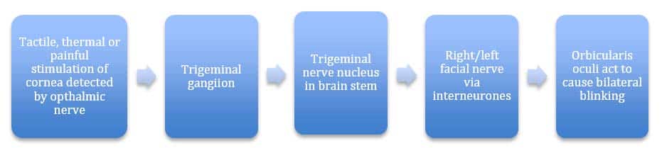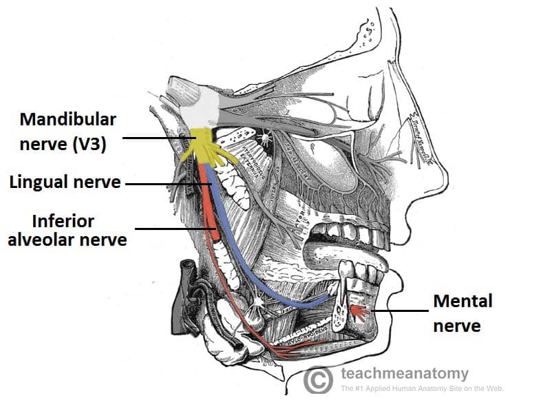 The Trigeminal Nerve (CN V) - Podcast Version TeachMeAnatomy 0:00 / 0:00 1x 0.25x 0.5x 0.75x 1x 1.25x 1.5x 1.75x 2x The trigeminal nerve (CN V) is the fifth paired cranial nerve. It is also the largest cranial nerve. In this article, we shall look at the anatomy of the trigeminal nerve – its course, functions and clinical correlations. Pro Feature - 3D Model You've Discovered a Pro Feature Access our 3D Model Library Explore, cut, dissect, annotate and manipulate our 3D models to visualise anatomy in a dynamic, interactive way. Learn More Summary The trigeminal nerve is associated with derivatives of the 1st pharyngeal arch. Sensory: Innervation to the skin, mucous membranes and sinuses of the face. Motor: Innervation to the muscles of mastication, anterior belly of digastric, mylohyoid, tensor veli palatini and tensor tympani. Parasympathetic Supply: Post-ganglionic neurones from parasympathetic ganglia travel with branches of the trigeminal nerve. Pro Feature - Dissection Atlas Cutaneous branches of the trigeminal nerve, supplying sensation to the face and scalp. Cutaneous branches of the trigeminal nerve, supplying sensation to the face and scalp. You've Discovered a Pro Feature Access our Dissection Image Library Enhance your understanding with high-resolution dissection images showcasing real-life anatomy. Learn More Anatomical Course The trigeminal nerve originates from three sensory nuclei (mesencephalic, principal sensory, spinal nuclei of trigeminal nerve) and one motor nucleus (motor nucleus of the trigeminal nerve) extending from the midbrain to the medulla. A nucleus (pl. nuclei) is a collection of neurone cell bodies within the central nervous system. At the level of the pons, the sensory nuclei merge to form a sensory root. The motor nucleus continues to form a motor root. These roots are analogous to the dorsal and ventral roots of the spinal cord. In the middle cranial fossa, the sensory root expands into the trigeminal ganglion. A ganglion (pl. ganglia) refers to a collection of the neurone cell bodies outside the central nervous system. The trigeminal ganglion is located lateral to the cavernous sinus, in a depression of the temporal bone. This depression is known as the trigeminal cave. The peripheral aspect of the trigeminal ganglion gives rise to 3 divisions: ophthalmic (V1), maxillary (V2) and mandibular (V3). The motor root passes inferiorly to the sensory root, along the floor of the trigeminal cave. Its fibres are only distributed to the mandibular division. The ophthalmic nerve and maxillary nerve travel lateral to the cavernous sinus exiting the cranium via the superior orbital fissure and foramen rotundum respectively. The mandibular nerve exits via the foramen ovale entering the infra-temporal fossa. (Note – be aware that while we talk about the nerves exiting the cranial cavity, the sensory components can also be said to be entering the cranial cavity, since they are afferent fibres). By TeachMeSeries Ltd (2025) Fig 1The origin of the sensory aspect of the trigeminal nerve. Note that the nuclei are situated within in the CNS, and the ganglia outside the CNS. By TeachMeSeries Ltd (2025) Fig 2Overview of the deep distribution of the trigeminal nerve and its terminal branches. Divisions Ophthalmic Nerve The ophthalmic nerve gives rise to three terminal branches: frontal, lacrimal and nasociliary. They innervate the skin and mucous membrane of derivatives of the frontonasal prominence derivatives: Forehead and scalp Frontal and ethmoidal sinus Upper eyelid and its conjunctiva Cornea (see clinical relevance) Dorsum of the nose Parasympathetic Supply: Lacrimal gland: Post ganglionic fibres from the pterygopalatine ganglion (derived from the facial nerve), travel with the zygomatic branch of V2 and then join the lacrimal branch of V1. The fibres supply parasympathetic innervation to the lacrimal gland. By TeachMeSeries Ltd (2025) Fig 3Nervous supply to the orbit from the ophthalmic and maxillary nerves. (other nerves e.g. orbital, not labelled). Note that the lacrimal nerve has been partly removed to expose the underlying structures. Clinical Relevance Corneal Reflex The corneal reflex is the involuntary blinking of the eyelids – stimulated by tactile, thermal or painful stimulation of the cornea. In the corneal reflex, the ophthalmic nerve acts as the afferent limb – detecting the stimuli. The facial nerve is the efferent limb, causing contraction of the orbicularis oculi muscle. If the corneal reflex is absent, it is a sign of damage to the trigeminal/ophthalmic nerve, or the facial nerve. By TeachMeSeries Ltd (2025) Fig 4The corneal reflex pathway. Maxillary Nerve The maxillary nerve gives rise to 14 terminal branches, which innervate the skin, mucous membranes and sinuses of derivatives of the maxillary prominence of the 1st pharyngeal arch: Lower eyelid and its conjunctiva Cheeks and maxillary sinus Nasal cavity and lateral nose Upper lip Upper molar, incisor and canine teeth and the associated gingiva Superior palate Parasympathetic Supply: Lacrimal gland: Post ganglionic fibres from the pterygopalatine ganglion (derived from the facial nerve), travel with the zygomatic branch of V2 and then join the lacrimal branch of V1. The fibres supply parasympathetic innervation to the lacrimal gland. Nasal glands: Parasympathetic fibres are also carried to the mucous glands of the nasal mucosa. Post-ganglionic fibres travel with the nasopalatine and greater palatine nerves (branches of V2) Mandibular Nerve The mandibular nerve gives rise to four terminal branches in the infra-temporal fossa: buccal nerve, inferior alveolar nerve, auriculotemporal nerve and lingual nerve. These branches innervate the skin, mucous membrane and striated muscle derivatives of the mandibular prominence of the 1st pharyngeal arch. Sensory Supply: Mucous membranes and floor of the oral cavity External ear Lower lip Chin Anterior 2/3 of the tongue (only general sensation; special taste