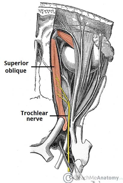The Trochlear Nerve (CN IV) - Podcast Version TeachMeAnatomy 0:00 / 0:00 1x 0.25x 0.5x 0.75x 1x 1.25x 1.5x 1.75x 2x The trochlear nerve is the fourth paired cranial nerve. It is the smallest cranial nerve (by number of axons), yet has the longest intracranial course. It has a purely somatic motor function. In this article, we shall look at the anatomy of the trochear nerve – its course, motor functions and clinical relevance. Pro Feature - 3D Model You've Discovered a Pro Feature Access our 3D Model Library Explore, cut, dissect, annotate and manipulate our 3D models to visualise anatomy in a dynamic, interactive way. Learn More Anatomical Course The trochlear nerve arises from the trochlear nucleus of the brain, emerging from the posterior aspect of the midbrain (it is the only cranial nerve to exit from the posterior midbrain). It runs anteriorly and inferiorly within the subarachnoid space before piercing the dura mater adjacent to the posterior clinoid process of the sphenoid bone. The nerve then moves along the lateral wall of the cavernous sinus (along with the oculomotor nerve, the abducens nerve, the ophthalmic and maxillary branches of the trigeminal nerve and the internal carotid artery) before entering the orbit of the eye via the superior orbital fissure. By TeachMeSeries Ltd (2025) Fig 1The trochlear nerve and superior oblique muscle Motor Function The trochlear nerve innervates a single muscle – the superior oblique, which is a muscle of oculomotion. As the fibres from the trochlear nucleus cross in the midbrain before they exit, the trochlear neurones innervate the contralateral superior oblique. The tendon of the superior oblique is tethered by a fibrous structure known as the trochlea, giving the nerve its name. Although the mechanism of action of the superior oblique is complex, in clinical practice it is sufficient to understand that the overall action of the superior oblique is to depress and intort the eyeball. By TeachMeSeries Ltd (2025) Fig 2Lateral view of the extraocular muscles. Clinical Relevance Examination of the Trochlear Nerve The trochlear nerve is examined in conjunction with the oculomotor and abducens nerves by testing the movements of the eye. The patient is asked to follow a point (commonly the tip of a pen) with their eyes without moving their head. The target is moved in an ‘H-shape’ and the patient is asked to report any blurring of vision or diplopia (double vision). Palsy of the Trochlear Nerve Trochlear nerve palsy commonly presents with vertical diplopia, exacerbated when looking downwards and inwards (such as when reading or walking down the stairs). Patients can also develop a head tilt away from the affected side. They are commonly caused by microvascular damage from diabetes mellitus or hypertensive disease. Other causes include congenital malformation, thrombophlebitis of the cavernous sinus, and raised intracranial pressure. By TeachMeSeries Ltd (2025) Fig 3Left trochlear nerve palsy, characterised by vertical diplopia and head tilt away from the affected side. Do you think you’re ready? Take the quiz below Pro Feature - Quiz The Trochlear Nerve (CN IV) Question 1 of 3 Submitting... Skip Next Rate question: You scored 0% Skipped: 0/3 1800 More Questions Available Upgrade to TeachMeAnatomy Pro Challenge yourself with over 1800 multiple-choice questions to reinforce learning Learn More Rate This Article