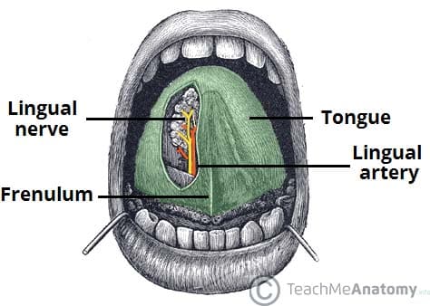 The Tongue - Podcast Version TeachMeAnatomy 0:00 / 0:00 1x 0.25x 0.5x 0.75x 1x 1.25x 1.5x 1.75x 2x The tongue is a muscular structure located on the floor of the oral cavity. It is the primary taste organ and plays a key role in the initial phases of swallowing. In this article, we shall look at the anatomy of the tongue – its structure, innervation and clinical correlations. Pro Feature - 3D Model You've Discovered a Pro Feature Access our 3D Model Library Explore, cut, dissect, annotate and manipulate our 3D models to visualise anatomy in a dynamic, interactive way. Learn More Intrinsic Muscles The intrinsic muscles originate and attach to other structures within the tongue. There are four paired intrinsic muscles of the tongue and they are named by the direction in which they travel – the superior longitudinal, inferior longitudinal, transverse and vertical muscles of the tongue. These muscles affect the shape and size of the tongue – for example, in tongue rolling – and have a role in facilitating speech, eating and swallowing. The motor innervation to the intrinsic muscles of the tongue is via the hypoglossal nerve (CN XII). Extrinsic Muscles The extrinsic muscles of the tongue originate from structures outside the tongue and insert onto it. They are innervated by the hypoglossal nerve – with the exception of the palatoglossus, which is innervated by the vagus nerve. Genioglossus The genioglossus muscle is a large, thick muscle, which contributes significantly to the shape of the tongue. Attachments: Arises from the mandibular symphysis. It inserts onto the body of the hyoid bone and the entire length of the tongue. Function: Protrusion (‘sticking the tongue out’) and depression of the tongue. Innervation: Hypoglossal nerve. Hyoglossus The hyoglossus muscle is located in the floor of the oral cavity, immediately lateral to the geniohyoid. Attachments: Arises from the hyoid bone and inserts onto the lateral aspect of the tongue. Function: Depression and retraction of the tongue. Innervation: Hypoglossal nerve. Styloglossus The styloglossus is a thin, paired muscle, located on either side of the oropharynx. Attachments: Originates from the styloid process of the temporal bone and inserts onto the lateral aspect of the tongue. Function: Retraction and elevation of the tongue. Innervation: Hypoglossal nerve. Palatoglossus The palatoglossus muscle is also associated with the soft palate – and is therefore innervated by the vagus nerve. Attachments: Arises from the palatine aponeurosis and inserts broadly along the tongue. Function: Elevation of the posterior tongue Innervation: Vagus nerve. By TeachMeSeries Ltd (2025) Fig 1The extrinsic muscles of the tongue. Note the palatoglossus muscle is not included in this illustration. Innervation Once we start examining the sensory supply of the tongue, we need to start looking at its division into an anterior 2/3, and a posterior 1/3. Later in this article, when we discuss the development of the tongue, the reason for this boundary becomes clear. In the anterior 2/3, general sensation is supplied by the trigeminal nerve (CNV). Specifically the lingual nerve, a branch of the mandibular nerve (CN V3). On the other hand, taste in the anterior 2/3 is supplied from the facial nerve (CNVII). In the petrous part of the temporal bone, the facial nerve gives off three branches, one of which is chorda tympani. This travels through the middle ear, and continues on to the tongue. The posterior 1/3 of the tongue is slightly easier. Both touch and taste are supplied by the glossopharyngeal nerve (CNIX). By TeachMeSeries Ltd (2025) Fig 2The lingual nerve provides sensory innervation to the to the 2/3 of the tongue. Vasculature The arterial supply to the tongue is mainly from the lingual artery (a branch of the external carotid artery). There are also contributions from the tonsillar branch of the facial artery. Venous drainage is by the lingual vein – which empties into the internal jugular vein. Lymphatic Drainage The lymphatic drainage of the tongue is as follows: Anterior two thirds – initially into the submental and submandibular nodes, which empty into the deep cervical lymph nodes Posterior third – directly into the deep cervical lymph nodes Embryological Development A good understanding of the tongue’s embryological development greatly simplifies the complex innervation to the structure. One of the central points is that the first branchial arch is supplied by the trigeminal nerve, the second by the facial, the third by the glossopharyngeal, and the fourth and sixth by the vagus. When the tongue is developing, it starts as a two longitudinal bulbous ridges, with contribution from the first four branchial arches. These ridges join, giving rise to the longitudinal line (median sulcus) down the centre of your tongue. The contribution from the second branchial arch is grown over by that of the third arch, but the nerve supply remains. Using this information, we can understand why the majority of the tongue’s innervation is by the trigeminal nerve (CN V) and the glossopharyngeal nerve CN IX. Look further towards the back of your tongue – there is a transverse line near the root of the tongue. This is called sulcus terminalis, and in the centre, where it meets the median sulcus, there is a pit. This is the now-closed top of a deep pit, the foramen cecum (blind window), at the end of which lies the thyroid gland. During development, this descends from the tongue down into the neck, If, on the way down, the pit (thyroglossal duct) doesn’t close behind the gland, midline thyroglossal cysts or fistulae may remain. Clinical Relevance Tongue-Tie The tongue is attached anteroinferiorly by a piece of connective tissue called the frenulum, which lies in the midline. The process by which the frenulum is formed is the same by which your fingers are made, and is known as sculpting apoptosis. Just as some people may have webbed fingers if thi