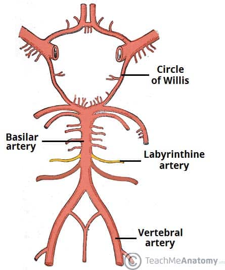 The ear can be divided into three parts: the outer ear, middle ear and inner ear. The inner ear is the innermost part of the ear, and houses the vestibulocochlear organs. It has two main functions: To convert mechanical signals from the middle ear into electrical signals, which can transfer information to the auditory pathway in the brain. To maintain balance by detecting position and motion. In this article, we shall look at the anatomy of the inner ear – its position, structure, and neurovascular supply. By TeachMeSeries Ltd (2025) Fig 1Overview of the ear Pro Feature - 3D Model You've Discovered a Pro Feature Access our 3D Model Library Explore, cut, dissect, annotate and manipulate our 3D models to visualise anatomy in a dynamic, interactive way. Learn More Anatomical Position and Structure The inner ear is located within the petrous part of the temporal bone. It lies between the middle ear and the internal acoustic meatus, which lie laterally and medially respectively. The inner ear has two main components – the bony labyrinth and membranous labyrinth. Bony labyrinth – consists of a series of bony cavities within the petrous part of the temporal bone. It is composed of the cochlea, vestibule and three semi-circular canals. All these structures are lined internally with periosteum and contain a fluid called perilymph. Membranous labyrinth – lies within the bony labyrinth. It consists of the cochlear duct, semi-circular ducts, utricle and the saccule. The membranous labyrinth is filled with fluid called endolymph. The inner ear has two openings into the middle ear, both covered by membranes. The oval window lies between the middle ear and the vestibule, whilst the round window separates the middle ear from the scala tympani (part of the cochlear duct). Bony Labyrinth The bony labyrinth is a series of bony cavities within the petrous part of the temporal bone. It consists of three parts – the cochlea, vestibule and the three semi-circular canals. Vestibule The vestibule is the central part of the bony labyrinth. It is separated from the middle ear by the oval window, and communicates anteriorly with the cochlea and posteriorly with the semi-circular canals. Two parts of the membranous labyrinth; the saccule and utricle, are located within the vestibule. Cochlea The cochlea houses the cochlea duct of the membranous labyrinth – the auditory part of the inner ear. It twists upon itself around a central portion of bone called the modiolus, producing a cone shape which points in an anterolateral direction. Branches from the cochlear portion of the vestibulocochlear (VIII) nerve are found at the base of the modiolus. Extending outwards from the modiolus is a ledge of bone known as spiral lamina, which attaches to the cochlear duct, holding it in position. The presence of the cochlear duct creates two perilymph-filled chambers above and below: Scala vestibuli: Located superiorly to the cochlear duct. As its name suggests, it is continuous with the vestibule. Scala tympani: Located inferiorly to the cochlear duct. It terminates at the round window. Semi-circular Canals There are three semi-circular canals: anterior, lateral and posterior. They contain the semi-circular ducts, which are responsible for balance (along with the utricle and saccule). The canals are situated superoposterior to the vestibule, at right angles to each other. They have a swelling at one end, known as the ampulla. By TeachMeSeries Ltd (2025) Fig 2The three parts of the bony labyrinth. Membranous Labyrinth The membranous labyrinth is a continuous system of ducts filled with endolymph. It lies within the bony labyrinth, surrounded by perilymph. It is composed of the cochlear duct, three semi-circular ducts, saccule and the utricle. The cochlear duct is situated within the cochlea and is the organ of hearing. The semi-circular ducts, saccule and utricle are the organs of balance (also known as the vestibular apparatus). Cochlear Duct The cochlear duct is located within the bony scaffolding of the cochlea. It is held in place by the spiral lamina. The presence of the duct creates two canals above and below it – the scala vestibuli and scala tympani respectively. The cochlear duct can be described as having a triangular shape: Lateral wall – Formed by thickened periosteum, known as the spiral ligament. Roof – Formed by a membrane which separates the cochlear duct from the scala vestibuli, known as the Reissner’s membrane. Floor – Formed by a membrane which separates the cochlear duct from the scala tympani, known as the basilar membrane. The basilar membrane houses the epithelial cells of hearing – the Organ of Corti. A more detailed description of the Organ of Corti is beyond the scope of this article. By TeachMeSeries Ltd (2025) Fig 3Structure of the cochlea, and borders of the cochlear duct. Saccule and Utricle The saccule and utricle are two membranous sacs located in the vestibule. They are organs of balance which detect movement or acceleration of the head in the vertical and horizontal planes, respectively. The utricle is the larger of the two, receiving the three semi-circular ducts. The saccule is globular in shape and receives the cochlear duct. Endolymph drains from the saccule and utricle into the endolymphatic duct. The duct travels through the vestibular aqueduct to the posterior aspect of the petrous part of the temporal bone. Here, the duct expands to a sac where endolymph can be secreted and absorbed. Semi-circular Ducts The semi-circular ducts are located within the semi-circular canals, and share their orientation. Upon movement of the head, the flow of endolymph within the ducts changes speed and/or direction. Sensory receptors in the ampullae of the semi-circular canals detect this change, and send signals to the brain, allowing for the processing of balance. By TeachMeSeries Ltd (2025) Fig 4The components of the membranous labyrinth. Vasculature The bony labyrinth and membranous 