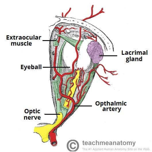 The Bony Orbit - Podcast Version TeachMeAnatomy 0:00 / 0:00 1x 0.25x 0.5x 0.75x 1x 1.25x 1.5x 1.75x 2x The bony orbits (or eye sockets) are bilateral and symmetrical cavities in the head. They enclose the eyeball and its associated structures. In this article, we shall look at the borders, contents and clinical correlations of the bony orbit. Pro Feature - 3D Model You've Discovered a Pro Feature Access our 3D Model Library Explore, cut, dissect, annotate and manipulate our 3D models to visualise anatomy in a dynamic, interactive way. Learn More Borders and Anatomical Relations The orbit can be thought of as a pyramidal structure, with the apex pointing posteriorly and the base situated anteriorly. The boundaries of the orbit are formed by seven bones. It is also important to consider the anatomical relations of the orbital cavity – this is clinically relevant in the spread of infection, and in cases of trauma. The borders and anatomical relations of the bony orbit are as follows: Roof (superior wall) – Formed by the frontal bone and the lesser wing of the sphenoid. The frontal bone separates the orbit from the anterior cranial fossa. Floor (inferior wall) – Formed by the maxilla, palatine and zygomatic bones. The maxilla separates the orbit from the underlying maxillary sinus. Medial wall – Formed by the ethmoid, maxilla, lacrimal and sphenoid bones. The ethmoid bone separates the orbit from the ethmoid sinus. Lateral wall – Formed by the zygomatic bone and greater wing of the sphenoid. Apex – Located at the opening to the optic canal, the optic foramen. Base – Opens out into the face, and is bounded by the eyelids. It is also known as the orbital rim. By TeachMeSeries Ltd (2025) Fig 1The anterior and lateral views of the bony orbit. Contents The bony orbit contains the eyeballs and their associated structures: Extra-ocular muscles – These muscles are separate from the eye. They are responsible for the movement of the eyeball and superior eyelid. Eyelids – These cover the orbits anteriorly. Nerves: Several cranial nerves supply the eye and its structures; optic, oculomotor, trochlear, trigeminal and abducens nerves. Blood vessels: The eye receives blood primarily from the ophthalmic artery. Venous drainage is via the superior and inferior ophthalmic veins. Any space within the orbit that is not occupied is filled with orbital fat. This tissue cushions the eye, and stabilises the extraocular muscles. By TeachMeSeries Ltd (2025) Fig 2Diagram of the arterial supply to the eye. Pathways into the Orbit There are three main pathways by which structures can enter and leave the orbit: Optic canal – transmits the optic nerve and ophthalmic artery. Superior orbital fissure – transmits the lacrimal, frontal, trochlear (CN IV), oculomotor (CN III), nasociliary and abducens (CN VI) nerves. It also carries the superior ophthalmic vein. Inferior orbital fissure – transmits the zygomatic branch of the maxillary nerve, the inferior ophthalmic vein, and sympathetic nerves. There are other minor openings into the orbital cavity. The nasolacrimal canal, which drains tears from the eye to the nasal cavity, is located on the medial wall of the orbit. Other small openings include the supraorbital foramen and infraorbital canal – they carry small neurovascular structures. By TeachMeSeries Ltd (2025) Fig 3The major openings into the orbit. Clinical Relevance Fractures of the Bony Orbit There are two major types of orbital fractures: By James Heilman, MD [CC-BY-SA-3.0] via Wikimedia Commons Fig 1.3CT scan of a blowout fracture of the eye, through the inferior wall. The contents of the orbit have herniated into the maxillary sinus. Orbital rim fracture – This is a fracture of the bones forming the outer rim of the bony orbit. It usually occurs at the sutures joining the three bones of the orbital rim – the maxilla, zygomatic and frontal. ‘Blowout’ fracture – This refers to partial herniation of the orbital contents through one of its walls. This usually occurs via blunt force trauma to the eye. The medial and inferior walls are the weakest, with the contents herniating into the ethmoid and maxillary sinuses respectively. Any fracture of the orbit will result in intraorbital pressure, raising the pressure in the orbit, causing exophthalmos (protrusion of the eye). There may also be involvement of surrounding structures, – e.g haemorrhage into one of the neighbouring sinuses. Do you think you’re ready? Take the quiz below Pro Feature - Quiz The Bony Orbit Question 1 of 3 Submitting... Skip Next Rate question: You scored 0% Skipped: 0/3 1800 More Questions Available Upgrade to TeachMeAnatomy Pro Challenge yourself with over 1800 multiple-choice questions to reinforce learning Learn More Rate This Article