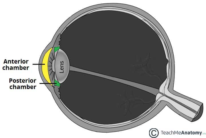 There are two fluid filled areas in the eye – known as the anterior and posterior chambers. The anterior chamber is located between the cornea and the iris, and the posterior chamber between the iris and ciliary processes.