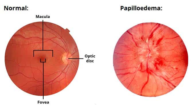 Papilloedema refers to swelling of the optic disc that occurs secondary to raised intracranial pressure. The optic disc is the area of the retina where the optic nerve enters and can be visualised using an ophthalmoscope.