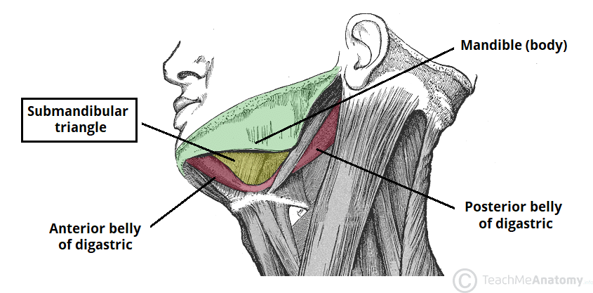 The Submandibular Gland - Podcast Version TeachMeAnatomy 0:00 / 0:00 1x 0.25x 0.5x 0.75x 1x 1.25x 1.5x 1.75x 2x The submandibular glands are bilateral salivary glands located in the face. Their mixed serous and mucous salivary secretions are important for the lubrication of food during mastication to enable effective swallowing and aid digestion. In this article, we shall look at the anatomy of the submandibular gland – its location, blood supply and clinical correlations. Pro Feature - 3D Model You've Discovered a Pro Feature Access our 3D Model Library Explore, cut, dissect, annotate and manipulate our 3D models to visualise anatomy in a dynamic, interactive way. Learn More Anatomical Position The submandibular gland is located within the anterior part of the submandibular triangle. The boundaries of this triangle are: Superiorly: Inferior body of the mandible. Anteriorly: Anterior belly of the digastric muscle. Posteriorly: Posterior belly of the digastric muscle. Anatomical Structure Structurally, the submandibular glands are a pair of elongate, flattened hooks which have two sets of arms; superficial and deep. The positioning of these arms is in relation to the mylohyoid muscle, which the gland hooks around. Superficial arm – comprises the greater portion of the gland and lies partially inferior to the posterior half of the mandible, within an impression on its medial aspect (the submandibular fossa). It is situated outside the boundaries of the oral cavity. Deep arm – hooks around the posterior margin of mylohyoid through a triangular aperture to enter the oral cavity proper. It lies on the lateral surface of the hyoglossus, lateral to the root of the tongue. Secretions from the submandibular glands travel into the oral cavity via the submandibular duct (Wharton’s duct). This is approximately 5cm in length and emerges anteromedially from the deep arm of the gland between the mylohyoid, hypoglossus and genioglossus muscles. The duct ascends on its course to open as 1-3 orifices on a small sublingual papilla (caruncle) at the base of the lingual frenulum bilaterally. By TeachMeSeries Ltd (2025) Fig 1Submandibular triangle of the neck By TeachMeSeries Ltd (2025) Fig 2The superficial arm of the submandibular gland. Relationship with Nerves Both the submandibular gland and duct share an intimate anatomical relationship with three principal nerves; the lingual nerve, hypoglossal nerve and facial nerve (marginal mandibular branch). The courses of these nerves are briefly outlined: Lingual nerve: Beginning lateral to the submandibular duct, this nerve courses anteromedially by looping beneath the duct and then terminating as several medial branches. The terminal branches ascend on the external and superior surface of hypoglossus to provide general somatic afferent innervation to the mucus membrane of the anterior two-thirds of the tongue. Hypoglossal nerve: Lies deep to the submandibular gland and runs superficial to hyoglossus and deep to digastric muscle. Facial nerve (marginal mandibular branch): Exits the anterior-inferior portion of the parotid gland at the angle of the jaw and traverses the margin of the mandible in the plane between platysma and the investing layer of deep cervical fascia curving down inferior to the submandibular gland. Clinical Relevance Submandibular Gland Excision Submandibular gland excision is a common surgical procedure indicated for conditions such as submandibular gland neoplasia or recurrent calculi. By TeachMeSeries Ltd (2025) Fig 3The anatomical course of the hypoglossal nerve. As discussed previously, the gland and its duct lie in close proximity to three principal nerves, so the surgeon must be acutely aware of this regional anatomy. Consequences of the three nerve injuries are: Lingual nerve: Immediate post-operative ipsilateral parathesia and loss of taste from the anterior two-thirds of the tongue, which is rarely permanent. Hypoglossal nerve: Ipsilateral paresis or paralysis of the intrinsic muscles of the tongue leading to dysarthria and deviation of tongue to side of the lesion. This nerve is rarely injured in this procedure to an extent to produce noticeable disability. Facial nerve (marginal mandibular branch): Ipsilateral paresis or paralysis of the muscles supplying the lower lip and chin, including depressor labii inferioris, which characteristically presents as drooping of the lower lip. This is usually temporary, lasting for 6-12 weeks. Pro Feature - Dissection Atlas The submandibular gland and the overlying facial vessels. The submandibular gland and the overlying facial vessels. You've Discovered a Pro Feature Access our Dissection Image Library Enhance your understanding with high-resolution dissection images showcasing real-life anatomy. Learn More Vasculature The submandibular gland is supplied by the submental artery (branch of facial artery) and sublingual artery (branch of lingual artery). Its venous drainage is by two vessels: Facial vein – empties directly into the internal jugular vein. Sublingual vein – drains into the lingual vein and then internal jugular vein. Innervation The submandibular glands receive autonomic innervation through parasympathetic and sympathetic fibres, which directly and indirectly regulate salivary secretions respectively. Parasympathetic Parasympathetic innervation originates from the superior salivatory nucleus through pre-synaptic fibres, which travel via the chorda tympani branch of the facial nerve (CNVII). The chorda tympani then unifies with the lingual branch of the mandibular nerve (CNViii) before synapsing at the submandibular ganglion and suspending it by two nerve filaments. Post-ganglionic innervation consists of secretomotor fibres which directly induce the gland to produce secretions, and vasodilator fibres which accompany arteries to increase blood supply to the gland. Increased parasympathetic drive promotes saliva secretion. Sympathetic Sympathetic innervation originates fr
