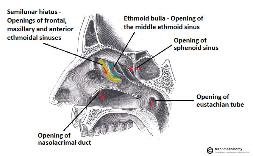 The Paranasal Sinuses - Podcast Version TeachMeAnatomy 0:00 / 0:00 1x 0.25x 0.5x 0.75x 1x 1.25x 1.5x 1.75x 2x The paranasal sinuses are air-filled extensions of the nasal cavity. There are four paired sinuses – named according to the bone in which they are located – maxillary, frontal, sphenoid and ethmoid. Each sinus is lined by a ciliated pseudostratified epithelium, interspersed with mucus-secreting goblet cells. The function of the paranasal sinuses is a topic of much debate. Various roles have been suggested: Lightening the weight of the head Supporting immune defence of the nasal cavity Humidifying inspired air Increasing resonance of the voice The paranasal sinuses are formed during development by the nasal cavity eroding into the surrounding bones. All the sinuses therefore drain back into the nasal cavity – openings to the paranasal sinuses can be found on the roof and lateral nasal walls. In this article, we shall look at the anatomy of the paranasal sinuses – their structure, anatomical relations and innervation. Adobe Stock, Licensed to TeachMeSeries Ltd Fig 1Location of the paranasal sinuses. Pro Feature - 3D Model You've Discovered a Pro Feature Access our 3D Model Library Explore, cut, dissect, annotate and manipulate our 3D models to visualise anatomy in a dynamic, interactive way. Learn More Frontal Sinuses There are two frontal sinuses located within the frontal bone of the skull. They are the most superior of the paranasal sinuses, and are triangular in shape. Drainage is via the frontonasal duct. It opens out at the hiatus semilunaris, within the middle meatus of the nasal cavity. Sensation is supplied by the supraorbital nerve (a branch of the ophthalmic nerve), and arterial supply is via the anterior ethmoidal artery (a branch of the internal carotid). Sphenoid Sinuses The sphenoid sinuses are situated within the body of the sphenoid bone. They open out into the nasal cavity in an area supero-posterior to the superior cocha – known as the spheno-ethmoidal recess. They are innervated by the posterior ethmoidal nerve (a branch of the ophthalmic nerve), and branches of the maxillary nerve. They recieve blood supply from pharyngeal branches of the maxillary arteries. Clinical Relevance Transsphenoidal Surgery The sphenoid bone shares a close anatomical relationship with the pituitary gland. Indeed, the pituitary can be accessed surgically by passing instruments through the sphenoid bone and sinus. This type of surgery is known as endoscopic trans-sphenoidal surgery (ETSS), and is the usual treatment of choice for pituitary adenomas. It allows for the surgical management of pituitary pathology without the need for a more extensive craniotomy. By TeachMeSeries Ltd (2025) Fig 2The transsphenoidal approach to pituitary surgery. Ethmoidal Sinuses There are three ethmoidal sinuses located within the ethmoid bone: Anterior – Opens onto the hiatus semilunaris (middle meatus) Middle – Opens onto the lateral wall of the middle meatus Posterior – Opens onto the lateral wall of the superior meatus They are innervated by the anterior and posterior ethmoidal branches of the nasociliary nerve and the maxillary nerve. The anterior and posterior ethmoidal arteries are responsible for arterial supply. Maxillary Sinuses The maxillary sinuses are the largest of the sinuses. They are located laterally and slightly inferiorly to the nasal cavities. They drain into the nasal cavity at the hiatus semilunaris, underneath the frontal sinus opening. This is a potential pathway for spread of infection – fluid draining from the frontal sinus can enter the maxillary sinus. By TeachMeSeries Ltd (2025) Fig 3The conchae have been removed, showing the various openings on the lateral wall of the nasal cavity. Clinical Relevance Sinusitis As the paranasal sinuses are continuous with the nasal cavity, an upper respiratory tract infection can spread to the sinuses. Infection of the sinuses causes inflammation (particularly pain and swelling) of the mucosa, and is known as sinusitis. If more than one sinus is affected, it is called pansinusitis. The maxillary nerve supplies both the maxillary sinus and maxillary teeth, and so inflammation of that sinus can present with toothache. Do you think you’re ready? Take the quiz below Pro Feature - Quiz The Paranasal Sinuses Question 1 of 2 Submitting... Skip Next Rate question: You scored 0% Skipped: 0/2 1800 More Questions Available Upgrade to TeachMeAnatomy Pro Challenge yourself with over 1800 multiple-choice questions to reinforce learning Learn More Rate This Article