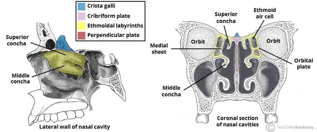 The Ethmoid Bone - Podcast Version TeachMeAnatomy 0:00 / 0:00 1x 0.25x 0.5x 0.75x 1x 1.25x 1.5x 1.75x 2x The ethmoid bone is a small unpaired bone, located in the midline of the anterior cranium – the superior aspect of the skull that encloses and protects the brain. The term ‘ethmoid’ originates from the Greek ‘ethmos’, meaning sieve. This is reflected in its lightweight, spongy structure. In this article, we shall look at the anatomy of the ethmoid bone – its location, relations, and structure. Pro Feature - 3D Model You've Discovered a Pro Feature Access our 3D Model Library Explore, cut, dissect, annotate and manipulate our 3D models to visualise anatomy in a dynamic, interactive way. Learn More Anatomical Structure The ethmoid bone is one of the 8 bones of the cranium. It is situated at the roof of the nasal cavity, and between the two orbital cavities. It contributes to the medial wall of the orbit and forms part of the anterior cranial fossa, where it separates the nasal cavity (inferiorly) from the cranial cavity (superiorly). It also forms a significant portion of the nasal septum and lateral nasal wall. The olfactory nerve (CN I) has a close anatomical relationship with the ethmoid bone. Its numerous nerve fibres pass through the cribriform plate of the ethmoid bone to innervate the nasal cavity with the sense of smell. By TeachMeSeries Ltd (2025) Fig 1The anatomical position and relations of the ethmoid bone. The ethmoid bone is made up of three parts – the cribriform plate, the perpendicular plate, and the ethmoidal labyrinth. The cribriform plate forms the roof of the nasal cavity. It is pierced by numerous olfactory nerve fibres, which gives it a sieve-like structure. Projecting superiorly from the cribriform plate is the crista galli, which provides an attachment point for the falx cerebri (sheet of dura mater that separates the two cerebral hemispheres). Another projection of bone descends from the cribriform plate – the perpendicular plate. It forms the superior two-thirds of the nasal septum. Lastly, the ethmoid bone contains two ethmoidal labyrinths. These are large masses located at either side of the perpendicular plate, which contain the ethmoidal air cells (sinuses). Two sheets of bone form each labyrinth: Orbital plate – the lateral sheet of bone, which also forms the medial wall of the orbit Medial sheet – forms the upper lateral wall of the nasal cavity, from which the superior and middle conchae extend into the nasal cavity. By TeachMeSeries Ltd (2025) Fig 2The ethmoid bone within the nasal cavity. Articulations The ethmoid bone articulates with 13 others: Paired – nasal bones, maxillae, lacrimal bones, palatine bones, inferior conchae. Unpaired – frontal, vomer and sphenoid bones. Clinical Relevance Ethmoid Fracture The ethmoid bone can be fractured in cases of facial trauma – most commonly hitting the dashboard in a collision, or a fall from height. Some signs and symptoms of fracture are related to the anatomy of the ethmoid bone: Fracture of cribriform plate – branches of the olfactory bulb may be sheared. This may cause anosmia (loss of sense of smell). Fracture of the labyrinth – may allow communication between the nasal cavity and the orbit. It is then possible for air to enter the orbit and cause orbital emphysema. Clinical Relevance CSF Rhinorrhoea A fracture to the cribriform plate may allow communication between the nasal cavity and the central nervous system. Consequently, cerebrospinal fluid (CSF) can enter the nasal cavity and drain out from the nose. This manifests clinically as a clear watery discharge from one side of the nose – and is known as CSF rhinorrhoea. The leaks normally stop spontaneously and can be managed conservatively, however surgery is sometimes required. Spontaneous CSF rhinorrhoea can also occur due to congenital or acquired defects in the ethmoid bone. Do you think you’re ready? Take the quiz below Pro Feature - Quiz The Ethmoid Bone Question 1 of 3 Submitting... Skip Next Rate question: You scored 0% Skipped: 0/3 1800 More Questions Available Upgrade to TeachMeAnatomy Pro Challenge yourself with over 1800 multiple-choice questions to reinforce learning Learn More Rate This Article