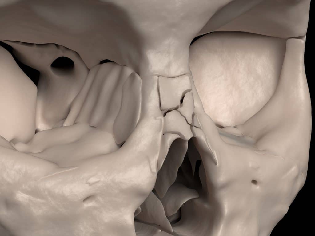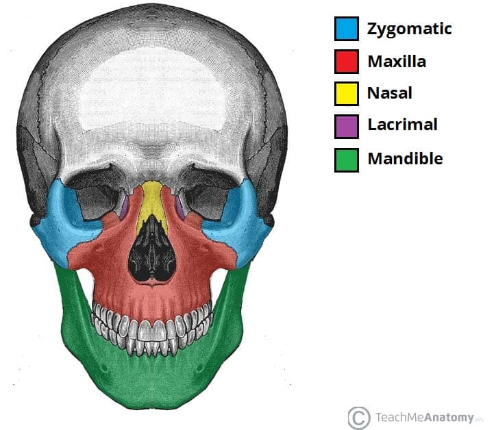 Bones of the Skull - Podcast Version TeachMeAnatomy 0:00 / 0:00 1x 0.25x 0.5x 0.75x 1x 1.25x 1.5x 1.75x 2x The skull is a bony structure that supports the face and forms a protective cavity for the brain. It is comprised of many bones, which are formed by intramembranous ossification, and joined by sutures (fibrous joints). The bones of the skull can be considered as two groups: those of the cranium (which consist of the cranial roof and cranial base) and those of the face. In this article, we shall look at the anatomy of the bones of the skull – their orientation, articulations, and clinical relevance. Pro Feature - 3D Model You've Discovered a Pro Feature Access our 3D Model Library Explore, cut, dissect, annotate and manipulate our 3D models to visualise anatomy in a dynamic, interactive way. Learn More Cranium The cranium (also known as the neurocranium) is formed by the superior aspect of the skull. It encloses and protects the brain, meninges, and cerebral vasculature. Anatomically, the cranium can be subdivided into a roof and a base: Cranial roof – comprised of the frontal, occipital and two parietal bones. It is also known as the calvaria. Cranial base – comprised of the frontal, sphenoid, ethmoid, occipital, parietal, and temporal bones. These bones articulate with the 1st cervical vertebra (atlas), the facial bones, and the mandible (jaw). Fig 1 – Bones of the calvaria and cranial base. Clinical Relevance Cranial Fractures Fractures of the cranium typically arise from blunt force or penetrating trauma. When considering cranial fractures, one area of clinical importance is the pterion – a H-shaped junction between the temporal, parietal, frontal, and sphenoid bones. The pterion overlies the middle meningeal artery, and fractures in this area may injury the vessel. Blood can accumulate between the skull and the dura mater, forming an extradural haematoma. By TeachMeSeries Ltd (2025) Fig 2Lateral view of the skull, showing the path of the meningeal arteries. Note the pterion, a weak point of the skull, where the anterior middle meningeal artery is at risk of damage. Face The facial skeleton (also known as the viscerocranium) supports the soft tissues of the face. It consists of 14 bones, which fuse to house the orbits of the eyes, the nasal and oral cavities, and the sinuses. The frontal bone, typically a bone of the calvaria, is sometimes included as part of the facial skeleton. The facial bones are: Zygomatic (2) – forms the cheek bones of the face and articulates with the frontal, sphenoid, temporal and maxilla bones. Lacrimal (2) – the smallest bones of the face. They form part of the medial wall of the orbit. Nasal (2) – two slender bones that are located at the bridge of the nose. Inferior nasal conchae (2) – located within the nasal cavity, these bones increase the surface area of the nasal cavity, thus increasing the amount of inspired air that can come into contact with the cavity walls. Palatine (2) – situated at the rear of oral cavity and forms part of the hard palate. Maxilla (2) – comprises part of the upper jaw and hard palate. Vomer – forms the posterior aspect of the nasal septum. Mandible (jaw) – articulates with the base of the cranium at the temporomandibular joint (TMJ). By TeachMeSeries Ltd (2025) Fig 3Anterior view of the face, showing some of the bones of the nasal skeleton. The vomer, palatine and inferior conchae bones lie deep within the face. Clinical Relevance Facial Fractures Fractures of the facial skeleton are relatively common and most frequently result from road traffic collisions, fist fights, and falls. The four most common facial fracture types are: Nasal fracture – the most common facial fracture, due to the prominent position of the nasal bones at the bridge of the nose. There is often significant soft tissue swelling and associated epistaxis. Maxillary fracture – associated with high-energy trauma. Fractures affecting of maxillary bones are classified using the Le Fort classification, ranging from 1 to 3. Mandibular fracture – often bilateral occurring directly at the side of trauma, and indirectly at the contralateral side due to transmitted forces. Clinical features include pain at fracture site and misalignment of the teeth (malocclusion) Zygomatic arch fracture – associated with trauma to the side of the face. Displaced fractures can damage the nearby infraorbital nerve, leading to ipsilateral paraesthesia of the check, nose, and lip. Adobe Stock, Licensed to TeachMeSeries Ltd Fig 43D reconstruction of a comminuted nasal bone fracture. Sutures of the Skull Sutures are a type of fibrous joint that are unique to the skull. They are immovable and fuse completely around the age of 20. These joints are important in the context of trauma, as they represent points of potential weakness in the skull. The main sutures in the adult skull are: Coronal suture – fuses the frontal bone with the two parietal bones. Sagittal suture – fuses both parietal bones to each other. Lambdoid suture – fuses the occipital bone to the two parietal bones. In neonates, the incompletely fused suture joints give rise to membranous gaps between the bones, known as fontanelles. The two major fontanelles are: Frontal fontanelle – located at the junction of the coronal and sagittal sutures Occipital fontanelle – located at the junction of the sagittal and lambdoid sutures By TeachMeSeries Ltd (2025) Fig 5The major fontanelles and sutures of the skull Do you think you’re ready? Take the quiz below Pro Feature - Quiz Bones of the Skull Question 1 of 3 Submitting... Skip Next Rate question: You scored 0% Skipped: 0/3 1800 More Questions Available Upgrade to TeachMeAnatomy Pro Challenge yourself with over 1800 multiple-choice questions to reinforce learning Learn More Rate This Article