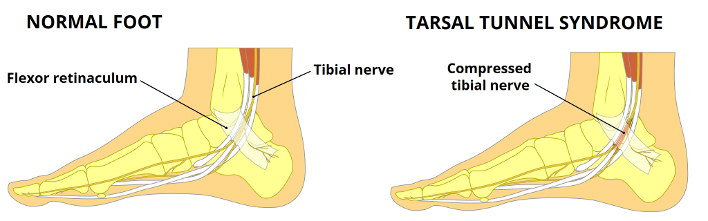The Tarsal Tunnel - Podcast Version TeachMeAnatomy 0:00 / 0:00 1x 0.25x 0.5x 0.75x 1x 1.25x 1.5x 1.75x 2x The tarsal tunnel is a fibro-osseous space located on the posteromedial aspect of the ankle. It acts as a passageway for tendons, nerves and vessels to travel between the posterior leg and the foot. In this article, we shall look at the anatomy of the tarsal tunnel – its borders, contents, and clinical relevance. Pro Feature - 3D Model You've Discovered a Pro Feature Access our 3D Model Library Explore, cut, dissect, annotate and manipulate our 3D models to visualise anatomy in a dynamic, interactive way. Learn More Borders The tarsal tunnel is formed by a bony floor and connective tissue roof. The floor is a concave surface formed by the medial aspect of the tibia, talus and calcaneus. It is converted into a tunnel by the flexor retinaculum, which spans obliquely between the medial malleolus and the medial tubercle of the calcaneus to form the roof. The flexor retinaculum is continuous with the deep fascia of the leg and foot. By Y. Yang, M. L. Du, Y. S. Fu, W. Liu, Q. Xu, X. Chen, Y. J. Hao, Z. Liu & M. J. Gao, [CC BY 4.0], via Wikimedia Commons Fig 1The roof of the tarsal tunnel is formed by a flexor retinaculum extending from the medial malleolus to the medial tubercle of the calcaneus. Contents The tarsal tunnel acts as a passageway for tendons, nerves and vessels to travel between the posterior leg and the foot. Its contents (anterior to posterior) are: Tibialis posterior tendon Flexor digitorum longus tendon Posterior tibial artery and vein Tibial nerve Flexor hallucis longus tendon The mnemonic Tom, Dick and a Very Nervous Harry can be used to aid recall of these structures. The tunnel is divided into four fibrous compartments – one containing the neurovascular structures and the other three containing the muscle tendons. Clinical Relevance Tarsal Tunnel Syndrome Tarsal tunnel syndrome refers to entrapment and compression of the tibial nerve as it passes through the tarsal tunnel. Patients may experience altered sensation in the sensory distribution of the tibial nerve – the sole of the foot. The motor function of the nerve can also be affected in severe disease, causing weakness and wasting of the intrinsic foot muscles. Management can be conservative or surgical: Conservative: Physiotherapy, NSAIDs, corticosteroid injections Surgical: Tarsal tunnel release (cutting through the flexor retinaculum to decompress the tunnel) Adobe Stock, Licensed to TeachMeSeries Ltd Fig 2Tarsal tunnel syndrome is caused by compression of the tibial nerve as it passes through the tarsal tunnel Do you think you’re ready? Take the quiz below Pro Feature - Quiz The Tarsal Tunnel Question 1 of 3 Submitting... Skip Next Rate question: You scored 0% Skipped: 0/3 1800 More Questions Available Upgrade to TeachMeAnatomy Pro Challenge yourself with over 1800 multiple-choice questions to reinforce learning Learn More Rate This Article