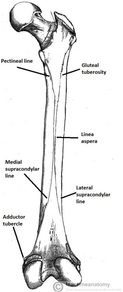 Distally, the linea aspera widens and forms the floor of the popliteal fossa, the medial and lateral borders form the medial and lateral supracondylar lines. The medial supracondylar line ends at the adductor tubercle, where the adductor magnus attaches.