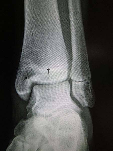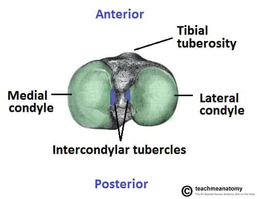 The Tibia - Podcast Version TeachMeAnatomy 0:00 / 0:00 1x 0.25x 0.5x 0.75x 1x 1.25x 1.5x 1.75x 2x The tibia is the main bone of the lower leg, forming what is more commonly known as the shin. It expands at its proximal and distal ends; articulating at the knee and ankle joints respectively. The tibia is the second largest bone in the body and it is a key weight-bearing structure. In this article, we shall look at anatomy of the tibia – its bony landmarks, articulations and clinical correlations. By Anatomography [CC-BY-SA-2.1-jp], via Wikimedia Commons Fig 1Overview of the tibia in the human skeleton Pro Feature - 3D Model You've Discovered a Pro Feature Access our 3D Model Library Explore, cut, dissect, annotate and manipulate our 3D models to visualise anatomy in a dynamic, interactive way. Learn More Proximal The proximal tibia is widened by the medial and lateral condyles, which aid in weight-bearing. The condyles form a flat surface, known as the tibial plateau. This structure articulates with the femoral condyles to form the key articulation of the knee joint. Located between the condyles is a region called the intercondylar eminence – this projects upwards on either side as the medial and lateral intercondylar tubercles. This area is the main site of attachment for the ligaments and the menisci of the knee joint. The intercondylar tubercles of the tibia articulate with the intercondylar fossa of the femur. By TeachMeSeries Ltd (2025) Fig 2The tibial plateau. The tibial condyles articulate with the femoral condyles to form the knee joint. Shaft The shaft of the tibia is prism-shaped, with three borders and three surfaces; anterior, posterior and lateral. For brevity, only the anatomically and clinically important borders/surfaces are mentioned here. Anterior border – palpable subcutaneously down the anterior surface of the leg as the shin. The proximal aspect of the anterior border is marked by the tibial tuberosity; the attachment site for the patella ligament. Posterior surface – marked by a ridge of bone known as soleal line. This line is the site of origin for part of the soleus muscle, and extends inferomedially, eventually blending with the medial border of the tibia. There is usually a nutrient artery proximal to the soleal line. Lateral border – also known as the interosseous border. It gives attachment to the interosseous membrane that binds the tibia and the fibula together. By TeachMeSeries Ltd (2025) Fig 3Bony landmarks of the tibial shaft. Clinical Relevance Intraosseous Access Intraosseous access is a form of vascular access used in the emergency setting. It allows the administration of fluids, blood products and medications directly into the bone marrow. IO access is typically used in an emergency when intravenous access is not obtainable. There are two main sites in the tibia that are suitable for IO access: Anteromedial surface, 2-3cm below the tibial tuberosity Proximal to the medial malleolus Complications of IO access include osteomyelitis, iatrogenic fracture and compartment syndrome. IO infusions should be discontinued when IV access has been achieved. Distal The distal end of the tibia widens to assist with weight-bearing. The medial malleolus is a bony projection continuing inferiorly on the medial aspect of the tibia. It articulates with the tarsal bones to form part of the ankle joint. On the posterior surface of the tibia, there is a groove through which the tendon of tibialis posterior passes. Laterally is the fibular notch, where the fibula is bound to the tibia – forming the distal tibiofibular joint. Clinical Relevance Fractures of the Tibia Fractures of the tibia are relatively common. There are two main types: High energy trauma – occurs predominantly in the younger population. Low energy trauma or insufficiency fractures – occurs predominantly in the elderly. Fractures most commonly occur at the shaft of the tibia, and are typically associated with fibula fractures. Fractures of the proximal tibia are known as tibial plateau fractures; the condyles may be broken and injury to the menisci and ligaments of the knee is not uncommon. These fractures are classified using the Schatzker classification, and if very displaced will likely required operative management. It is important to monitor patients for signs of compartment syndrome in the pre-and post-operative phases. At the ankle, the medial malleolus can be fractured. This is caused by the ankle being twisted inwards (over-inversion) – the talus of the foot is forced against the medial malleolus, causing a spiral fracture. This rarely happens in isolation and typically the lateral malleolus is also fractured; potentially producing an unstable fracture that requires operative management. By James Heilman, MD [CC-BY-SA-3.0], via Wikimedia Commons Fig 4Fracture of the medial malleolus (black arrow) in a child, with the whiting arrow marking a normal growth plate. This is a Salter Harris type III fracture. Do you think you’re ready? Take the quiz below Pro Feature - Quiz The Tibia Question 1 of 3 Submitting... Skip Next Rate question: You scored 0% Skipped: 0/3 1800 More Questions Available Upgrade to TeachMeAnatomy Pro Challenge yourself with over 1800 multiple-choice questions to reinforce learning Learn More Rate This Article