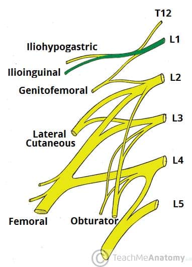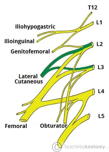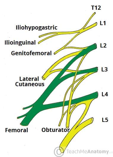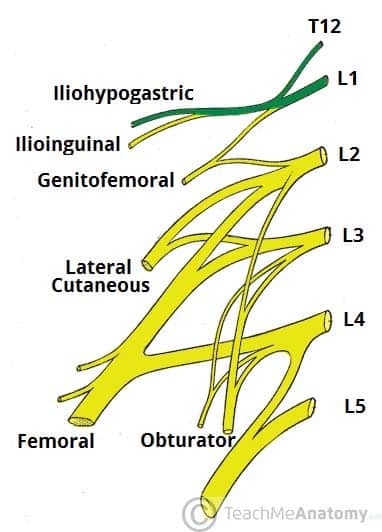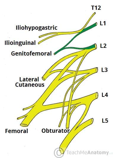 The Lumbar Plexus - Podcast Version TeachMeAnatomy 0:00 / 0:00 1x 0.25x 0.5x 0.75x 1x 1.25x 1.5x 1.75x 2x The lumbar plexus is a network of nerve fibres that supplies the skin and musculature of the lower limb. It is located in the lumbar region, within the substance of the psoas major muscle and anterior to the transverse processes of the lumbar vertebrae. The plexus is formed by the anterior rami (divisions) of the lumbar spinal nerves L1, L2, L3 and L4. It also receives contributions from thoracic spinal nerve 12. In this article, we shall look at the anatomy of the lumbar plexus – its formation and major branches. Pro Feature - 3D Model You've Discovered a Pro Feature Access our 3D Model Library Explore, cut, dissect, annotate and manipulate our 3D models to visualise anatomy in a dynamic, interactive way. Learn More Spinal Nerves The spinal nerves L1 – L4 form the basis of the lumbar plexus. At each vertebral level, paired spinal nerves leave the spinal cord via the intervertebral foramina of the vertebral column. Each nerve then divides into anterior and posterior nerve fibres. The lumbar plexus begins as the anterior fibres of the spinal nerves L1, L2, L3, and L4. By TeachMeSeries Ltd (2025) Fig 1The spinal cord outflow at each vertebral level. The anterior rami of vertebral levels L1-L4 make up the roots of the lumbar plexus Pro Feature - Dissection Atlas The lumbar plexus, femoral nerve and muscles of the posterior abdominal wall. The lumbar plexus, femoral nerve and muscles of the posterior abdominal wall. You've Discovered a Pro Feature Access our Dissection Image Library Enhance your understanding with high-resolution dissection images showcasing real-life anatomy. Learn More The Branches The anterior rami of the L1-L4 spinal roots divide into several cords. These cords then combine together to form the six major peripheral nerves of the lumbar plexus. These nerves then descend down the posterior abdominal wall to reach the lower limb, where they innervate their target structures. We shall now consider the branches of the lumbar plexus. (Note: In this article we shall include only brief notes on the function of these nerves – for more detailed information click on the title to visit their respective pages) By TeachMeSeries Ltd (2025) Fig 2The right lumbar plexus and the left sacral plexus. Iliohypogastric Nerve The iliohypogastric nerve is the first major branch of the lumbar plexus. It runs to the iliac crest, across the quadratus lumborum muscle of the posterior abdominal wall. It then perforates the transversus abdominis, and divides into its terminal branches. Roots: L1 (with contributions from T12). Motor Functions: Innervates the internal oblique and transversus abdominis. Sensory Functions: Innervates the skin of the posterolateral gluteal and pubic regions. (Tip: an easy way to remember that the IlioHypogastric comes before the IlioInguinal is that H comes before I in the alphabet!) By TeachMeSeries Ltd (2025) Fig 3Derivation of the iliohypogastric nerve. Ilioinguinal Nerve The ilioinguinal nerve follows the same anatomical course as the larger iliohypogastric nerve. After innervating the muscles of the anterior abdominal wall, it passes through the superficial inguinal ring to innervate the skin of the genitalia and middle thigh. Roots: L1. Motor Functions: Innervates the internal oblique and transversus abdominis. Sensory Functions: Innervates the skin of the superior anteromedial thigh. In males, it also supplies the skin over the root of the penis and anterior scrotum. In females, it supplies the skin over mons pubis and labia majora. By TeachMeSeries Ltd (2025) Fig 4Derivation of the ilioinguinal nerve. Genitofemoral Nerve After leaving the psoas major muscle, the genitofemoral nerve quickly divides into a genital branch, and a femoral branch. Roots: L1, L2. Motor Functions: The genital branch innervates the cremasteric muscle. Sensory Functions: The genital branch innervates the skin of the anterior scrotum (in males) or the skin over mons pubis and labia majora (in females). The femoral branch innervates the skin on the upper anterior thigh. By TeachMeSeries Ltd (2025) Fig 5Derivation of the genitofemoral nerve. Lateral Cutaneous Nerve of the Thigh This nerve has a purely sensory function. It enters the thigh at the lateral aspect of the inguinal ligament, where it provides cutaneous innervation to the skin there. Roots: L2, L3 Motor Functions: None. Sensory Functions: Innervates the anterior and lateral thigh down to the level of the knee. By TeachMeSeries Ltd (2025) Fig 6Derivation of the lateral cutaneous nerve of thigh. Obturator Nerve See more detailed information here Roots: L2, L3, L4. Motor Functions: Innervates the muscles of the medial thigh – the obturator externus, adductor longus, adductor brevis, adductor magnus and gracilis. Sensory Functions: Innervates the skin over the medial thigh. By TeachMeSeries Ltd (2025) Fig 7Derivation of the obturator nerve. Femoral Nerve See more detailed information here. Roots: L2, L3, L4. Motor Functions: Innervates the muscles of the anterior thigh – the illiacus, pectineus, sartorius and quadriceps femoris. Sensory Functions: Innervates the skin on the anterior thigh and the medial leg. By TeachMeSeries Ltd (2025) Fig 8Derivation of the femoral nerve Note: A useful memory aid for the branches of the lumbar plexus is: I, I Get Leftovers On Fridays. This stands for the Iliohypogastric, Ilioinguinal, Genitofemoral, Lateral cutaneous nerve of the thigh, Obturator and Femoral. Clinical Relevance Lumbosacral Plexopathy Lumbar plexopathy refers to injury or dysfunction of the lumbar plexus. The plexus lies within the psoas major muscle, making it susceptible to compression or infiltration by retroperitoneal tumours, psoas abscesses or haematomas The clinical features reflect involvement of nerves that arise from the lumbar plexus: Femoral nerve – weakness of hip flexion, impaired knee extension and reduced p