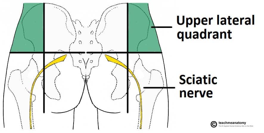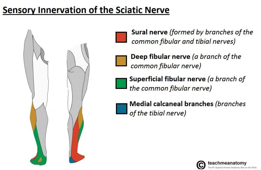 The Sciatic Nerve - Podcast Version TeachMeAnatomy 0:00 / 0:00 1x 0.25x 0.5x 0.75x 1x 1.25x 1.5x 1.75x 2x The sciatic nerve is a major nerve of the lower limb. It is a thick flat band, approximately 2cm wide – the largest nerve in the body. In this article, we shall look at the anatomy of the sciatic nerve – its anatomical course, motor and sensory functions, and its clinical correlations. Pro Feature - 3D Model You've Discovered a Pro Feature Access our 3D Model Library Explore, cut, dissect, annotate and manipulate our 3D models to visualise anatomy in a dynamic, interactive way. Learn More Overview Nerve roots: L4-S3. Motor functions: Innervates the muscles of the posterior thigh (biceps femoris, semimembranosus and semitendinosus) and the hamstring portion of the adductor magnus (remaining portion of which is supplied by the obturator nerve). Indirectly innervates (via its terminal branches) all the muscles of the leg and foot. Sensory functions: No direct sensory functions. Indirectly innervates (via its terminal branches) the skin of the lateral leg, heel, and both the dorsal and plantar surfaces of the foot. By TeachMeSeries Ltd (2025) Fig 1Derivation of the sciatic nerve from the sacral plexus. Pro Feature - Dissection Atlas The sacrotuberous ligament and surrounding structures The sacrotuberous ligament and surrounding structures You've Discovered a Pro Feature Access our Dissection Image Library Enhance your understanding with high-resolution dissection images showcasing real-life anatomy. Learn More Anatomical Course The sciatic nerve is derived from the lumbosacral plexus. After its formation, it leaves the pelvis and enters the gluteal region via greater sciatic foramen. It emerges inferiorly to the piriformis muscle and descends in an inferolateral direction. As the nerve moves through the gluteal region, it crosses the posterior surface of the superior gemellus, obturator internus, inferior gemellus and quadratus femoris muscles. It then enters the posterior thigh by passing deep to the long head of the biceps femoris. Within the posterior thigh, the nerve gives rise to branches to the hamstring muscles and adductor magnus. When the sciatic nerve reaches the apex of the popliteal fossa, it terminates by bifurcating into the tibial and common fibular nerves. Note: the sciatic nerve can be described as two individual nerves bundled together in the same connective tissue sheath – the tibial and common fibular nerves. These usually separate at the apex of the popliteal fossa, however in approximately 12% of people they separate as they leave the pelvis. By TeachMeSeries Ltd (2025) Fig 2View of the posterior thigh. The gluteus maximus and minimus have been removed to expose the sciatic nerve and underlying anatomical structures. Clinical Relevance Intramuscular Injections The anatomical course of the sciatic nerve must be considered when administering intramuscular injections into the gluteal region. The region can be divided into quadrants using 2 lines, marked by bony landmarks: One line descends vertically from the highest point on the iliac crest. The other horizontal line passes through the vertical line half way between the highest point on the iliac crest and ischial tuberosity. The sciatic nerve passes through the lower medial quadrant. To avoid damaging the sciatic nerve therefore, intramuscular injections are given only in the upper lateral quadrant of the gluteal region. By TeachMeSeries Ltd (2025) Fig 3Safe intramuscular injections into the gluteal region. Motor Functions Although the sciatic nerve passes through the gluteal region, it does not innervate any muscles there. However, the sciatic nerve does directly innervate the muscles in the posterior compartment of the thigh, and the hamstring portion of the adductor magnus. The sciatic nerve also indirectly innervates several other muscles, via its two terminal branches: Tibial nerve – the muscles of the posterior leg (calf muscles), and some of the intrinsic muscles of the foot. Common fibular nerve – the muscles of the anterior leg, lateral leg, and the remaining intrinsic foot muscles. In total, the sciatic nerve innervates the muscles of the posterior thigh, entire leg and entire foot. Sensory Functions The sciatic nerve does not have any direct cutaneous functions. It does provide indirect sensory innervation via its terminal branches: Tibial nerve – supplies the skin of the posterolateral leg, lateral foot and the sole of the foot. Common fibular nerve – supplies the skin of the lateral leg and the dorsum of the foot. By TeachMeSeries Ltd (2025) Fig 4The cutaneous innervation of the terminal branches of the sciatic nerve. Clinical Relevance Piriformis Syndrome Piriformis syndrome refers to compression of the sciatic nerve by the piriformis muscle. It is also known as deep gluteal syndrome. Clinical features include radicular pain, numbness, muscle weakness and buttock tenderness. The pain can occasionally be exacerbated by internal rotation of the lower limb at the hip. X-ray and MRI imaging is usually unremarkable but can exclude other pathology such as spinal compression of the sciatic nerve. The treatment of piriformis syndrome can be divided into non-operative and operative: Non-operative – analgesia, physiotherapy and corticosteroid injections Operative – piriformis muscle release Do you think you’re ready? Take the quiz below Pro Feature - Quiz The Sciatic Nerve Question 1 of 3 Submitting... Skip Next Rate question: You scored 0% Skipped: 0/3 1800 More Questions Available Upgrade to TeachMeAnatomy Pro Challenge yourself with over 1800 multiple-choice questions to reinforce learning Learn More Rate This Article