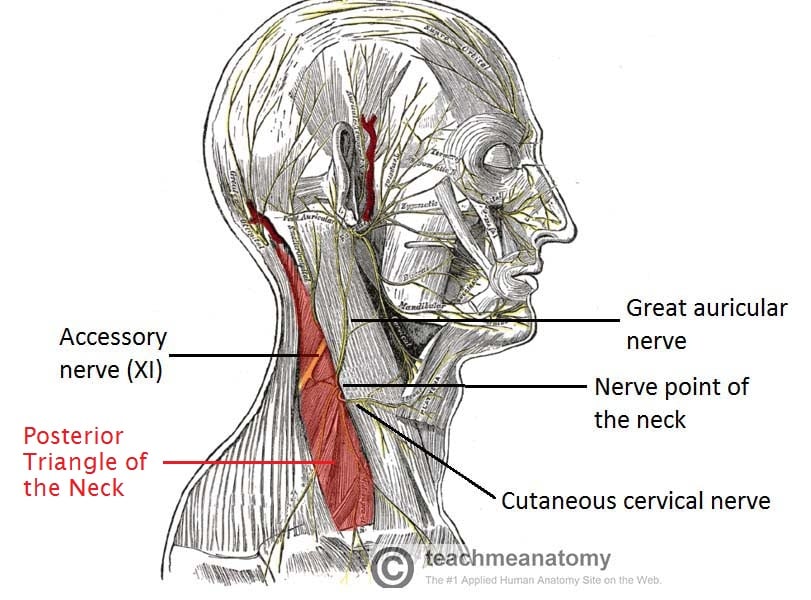 The Posterior Triangle of the Neck - Podcast Version TeachMeAnatomy 0:00 / 0:00 1x 0.25x 0.5x 0.75x 1x 1.25x 1.5x 1.75x 2x The posterior triangle of the neck is an anatomical area located at the posterolateral aspect of the neck. In this article, we shall look at the anatomy of the posterior triangle of the neck – its borders, contents and clinical correlations. Pro Feature - 3D Model You've Discovered a Pro Feature Access our 3D Model Library Explore, cut, dissect, annotate and manipulate our 3D models to visualise anatomy in a dynamic, interactive way. Learn More Borders The posterior triangle of the neck has three borders: Anterior – posterior border of the sternocleidomastoid. Posterior – anterior border of the trapezius muscle. Inferior – middle 1/3 of the clavicle. The roof is formed by the investing layer of fascia, and the floor is formed by the prevertebral fascia (see fascial layers of the neck). By TeachMeSeries Ltd (2025) Fig 1The borders and floor of the posterior triangle of the neck. Pro Feature - Dissection Atlas Prosection of the posterior triangle of the neck and its contents. Prosection of the posterior triangle of the neck and its contents. You've Discovered a Pro Feature Access our Dissection Image Library Enhance your understanding with high-resolution dissection images showcasing real-life anatomy. Learn More Contents Muscles The posterior triangle of the neck contains many muscles, which make up the borders and the floor of the area. A significant muscle in the posterior triangle region is the omohyoid muscle. It is split into two bellies by a tendon. The inferior belly crosses the posterior triangle, travelling in an supero-medial direction, and splitting the triangle into two. The muscle then crosses underneath the SCM to enter the anterior triangle of the neck. A number of vertebral muscles (covered by prevertebral fascia) form the floor of the posterior triangle: Splenius capitis Levator scapulae Anterior, middle and posterior scalenes Vasculature The external jugular vein is one of the major veins of the neck region. Formed by the retromandibular and posterior auricular veins, it lies superficially, entering the posterior triangle after crossing the sternocleidomastoid muscle. Within the posterior triangle, the external jugular vein pierces the investing layer of fascia and empties into the subclavian vein. The subclavian vein is often used as a point of access to the venous system, via a central catheter. The transverse cervical and suprascapular veins also lie in the posterior triangle The subclavian, transverse cervical and suprascapular veins are accompanied by their respective arteries in the posterior triangle. The distal part of the subclavian artery can be located as it emerges between the anterior and middle scalene muscles. As it crosses the first rib, it becomes the axillary artery, which goes onto supply the upper limb. Clinical Relevance The External Jugular Vein The external jugular vein has a relatively superficial course down the neck, leaving it vulnerable to damage. If it is severed, in an injury such as a knife slash, its lumen is held open – this is due to the thick layer of investing fascia (for more information see Fascial Layers of the Neck). Air will be drawn into the vein, producing cyanosis, and can stop blood flow through the right atrium. This is a medical emergency, managed by the application of pressure to the wound – stopping the bleeding, and the entry of air. Nerves The accessory nerve (CN XI) exits the cranial cavity, descends down the neck, innervates sternocleidomastoid and enters the posterior triangle. It crosses the posterior triangle in an oblique, inferoposterior direction, within the investing layer of fascia. It lies relatively superficial in the posterior triangle, leaving it vulnerable to injury. The cervical plexus forms within the muscles of the floor of the posterior triangle. A major branch of this plexus is the phrenic nerve, which arises from the anterior divisions of spinal nerves C3-C5. It descends down the neck, within the prevertebral fascia, to innervate the diaphragm. Other branches of the cervical plexus innervate the vertebral muscles, and provide cutaneous innervation to parts of the neck and scalp. The trunks of the brachial plexus also cross the floor of the posterior triangle. By TeachMeSeries Ltd (2025) Figure 2Nerves within the posterior triangle of the neck. Clinical Relevance Cervical Plexus Nerve Block For anaesthesia of the neck area, a cervical plexus block can be used. Local anaesthetic is injected along the posterior border of sternocleidomastoid at the junction of its superior and middle thirds. This junction is where the cutaneous branches of the cervical plexus emerge, known as the nerve point of the neck. Subdivisions The omohyoid muscle divides the posterior triangle of the neck into two areas: Occipital triangle – located superior to the omohyoid. Subclavian triangle – located inferior to the omohyoid. It contains the distal portion of the subclavian artery Do you think you’re ready? Take the quiz below Pro Feature - Quiz The Posterior Triangle of the Neck Question 1 of 3 Submitting... Skip Next Rate question: You scored 0% Skipped: 0/3 1800 More Questions Available Upgrade to TeachMeAnatomy Pro Challenge yourself with over 1800 multiple-choice questions to reinforce learning Learn More Rate This Article