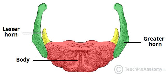 The hyoid bone is a U-shaped bone found anteriorly in the neck around the level of C3. It is unique in not articulating with any other bones. Instead, it provides a point for attachment for an array of muscles and ligaments. Most of these attach to the bone’s two greater horns with the exception of the stylohyoid ligament which attaches to the lesser horns. The horns of the hyoid bone converge centrally to form the body of the hyoid.