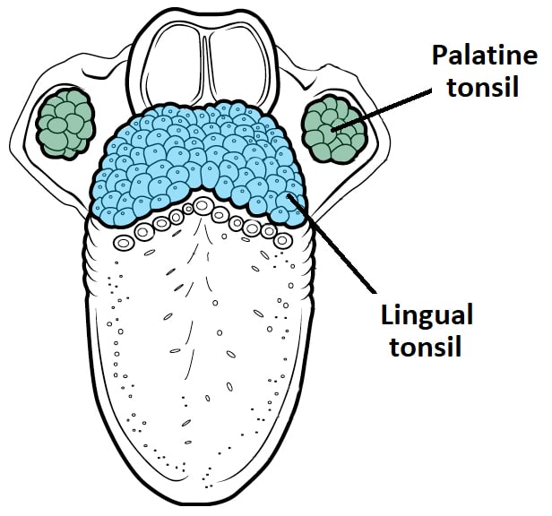 The Tonsils (Waldeyer’s Ring) - Podcast Version TeachMeAnatomy 0:00 / 0:00 1x 0.25x 0.5x 0.75x 1x 1.25x 1.5x 1.75x 2x The tonsils are collections of lymphatic tissue located within the pharynx. They collectively form a ringed arrangement, known as Waldeyer’s ring: Pharyngeal tonsil Tubal tonsils (x2) Palatine tonsils (x2) Lingual tonsil The tonsils are classified as mucosa-associated lymphoid tissue (MALT), and therefore contain T cells, B cells and macrophages. They have an important role in fighting infection – the first line of defence against pathogens entering through the nasopharynx or oropharynx. In this article, we shall look at the anatomy of the tonsils – their location, blood supply and any clinical correlations. Adobe Stock, Licensed to TeachMeSeries Ltd Fig 1The four tonsils that comprise Waldeyer’s ring. Pro Feature - 3D Model You've Discovered a Pro Feature Access our 3D Model Library Explore, cut, dissect, annotate and manipulate our 3D models to visualise anatomy in a dynamic, interactive way. Learn More Lingual Tonsil The lingual tonsil refers to numerous lymphoid nodules located within the submucosa of the posterior third of the tongue. This tonsil is responsible for the irregular appearance of the posterior tongue surface. and forms the inferior part of Waldeyer’s ring. Like the rest of the tongue, the lingual tonsil is covered by a stratified non-keratinised squamous epithelium. Blood Supply and Innervation The arterial supply to the lingual tonsil is largely via the lingual artery, with contributions from the tonsillar branch of the facial artery and the ascending pharyngeal artery. The dorsal lingual branch of the lingual vein performs the venous drainage. Innervation is from the glossopharyngeal nerve. Lymphatic Drainage Lymphatic fluid from the lingual tonsil drains into the jugulodigastric and deep cervical lymph nodes. Adapted from work by OpenStax College [CC BY 3.0] Fig 2The lingual and palatine tonsils. Pharyngeal Tonsil The pharyngeal tonsil refers to a collection of lymphoid tissue within the mucosa of the roof of the nasopharynx. When enlarged, the pharyngeal tonsil is also known as the adenoids. It is located in the midline of the nasopharynx, and forms the superior aspect of Waldeyer’s ring. The epithelial covering of the pharyngeal tonsil is ciliated pseudostratified epithelium. Blood Supply and Innervation The pharyngeal tonsil receives arterial supply from several vessels: Ascending palatine artery Ascending pharyngeal artery (external carotid) Pharyngeal branch of the maxillary artery Artery of the pterygoid canal Basisphenoid artery Tonsillar branch of the facial artery Venous drainage is via numerous small veins which pierce the superior constrictor muscle to empty into the pharyngeal plexus. The pharyngeal tonsil receives nerve fibres from the vagus and glossopharyngeal cranial nerves. Lymphatic Drainage Lymphatic fluid from the pharyngeal tonsil drains into the retropharyngeal nodes (which empty into the deep cervical chain), and directly into deep cervical nodes within the parapharyngeal space. Tubal Tonsils The tubal tonsils refer to lymphoid tissue around the opening of the Eustachian tube in the lateral wall of the nasopharynx. They form the lateral aspect of the Waldeyer’s ring. The epithelial covering of the tubal tonsils is ciliated pseudostratified epithelium. Blood Supply and Innervation The neurovascular supply is similar to other structures in the nasopharynx. Arterial supply is chiefly via the ascending pharyngeal artery and venous drainage is to the pharyngeal plexus. Innervation is via the maxillary and glossopharyngeal nerves. Lymphatic Drainage The retropharyngeal and the deep cervical lymph nodes drain the tubal tonsils. Palatine Tonsils The palatine tonsils are commonly referred to as ‘the tonsils‘. They are located within the tonsillar bed of the lateral oropharynx wall – between the palatoglossal arch (anteriorly) and palatopharyngeal arch (posteriorly). They form the lateral part of the Waldeyer’s ring. Each tonsil has free medial surface which projects into the pharynx. The lateral surface is covered by a fibrous capsule, and is separated from the superior constrictor of the tonsillar bed by loose areolar connective tissue. They are covered by a stratified non-keratinised squamous epithelium. By TeachMeSeries Ltd (2025) Fig 3Location of the palatine tonsil in the oropharynx Blood Supply and Innervation The arterial supply to the tonsil is via the tonsillar branch of the facial artery. It pierces the superior constrictor muscle to reach the palatine tonsil. The venous drainage is via the external palatine vein (drains into the facial vein), and numerous smaller vessels which drain into the pharyngeal plexus. The palatine tonsils receive innervation from the maxillary nerve and glossopharyngeal nerve. Lymphatic Drainage The palatine tonsils drain into the jugulodigastric and upper deep cervical lymph nodes. Clinical Relevance Tonsillitis Tonsillitis refers to inflammation of the palatine tonsils. It is usually caused by viral infection, with bacterial causes accounting for approximately 1/3 of cases. Tonsillitis presents with difficult or painful swallowing – often with pyrexia and/or halitosis. On examination, the tonsils appear erythematous and swollen with evidence of purulent exudate and lymphadenopathy. A complication of bacterial tonsillitis is a peritonsillar abscess (quinsy); a collection pus in the peritonsillar space. All quinsies will require drainage. There are two techniques adopted for this: Needle aspiration following topical local anaesthetic. Incision and drainage, with further opening via use of Magill forceps. Adapted from work by Adobe Stock (Licensed to TeachMeSeries Ltd) and James Heilman MD [CC BY-SA 3.0] Fig 4Peritonsillar abscess, a collection of pus in the peritonsillar space as a complication of tonsillitis. Do you think you’re ready? Take the quiz below Pro Feature - Qui