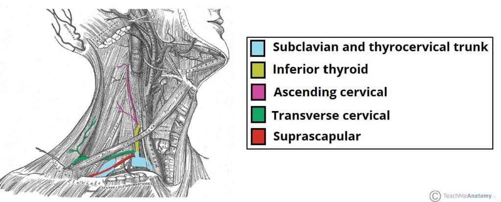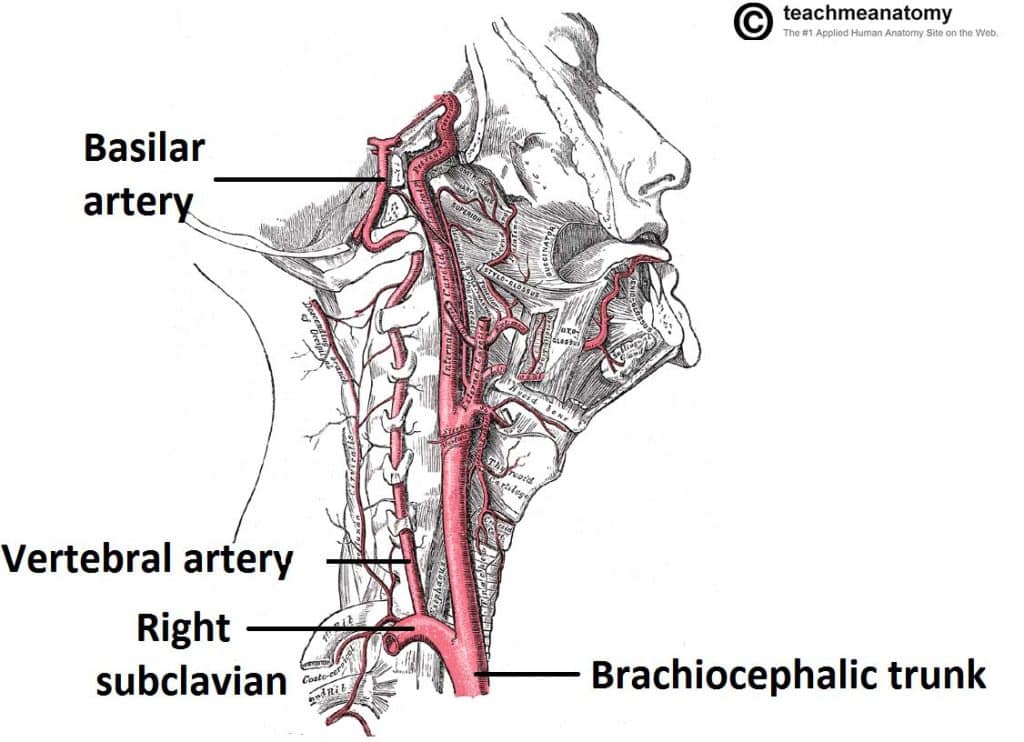 The head and neck receives the majority of its blood supply through the carotid and vertebral arteries. In this article, we shall look at the anatomy of the arterial supply to the head and neck – its anatomical course, branches, and clinical correlations. Pro Feature - 3D Model You've Discovered a Pro Feature Access our 3D Model Library Explore, cut, dissect, annotate and manipulate our 3D models to visualise anatomy in a dynamic, interactive way. Learn More Carotid Arteries We shall start at the origin of the carotid arteries. The right common carotid artery arises from a bifurcation of the brachiocephalic trunk (the right subclavian artery is the other branch). This bifurcation occurs roughly at the level of the right sternoclavicular joint. The left common carotid artery branches directly from the arch of aorta. The left and right common carotid arteries ascend up the neck, lateral to the trachea and the oesophagus. They do not give off any branches in the neck. At the level of the superior margin of the thyroid cartilage (C4), the carotid arteries split into the external and internal carotid arteries. This bifurcation occurs in an anatomical area known as the carotid triangle. The common carotid and internal carotid are slightly dilated here, this area is known as the carotid sinus, and is important in detecting and regulating blood pressure. By TeachMeSeries Ltd (2025) Fig 1Origin of the blood vessels of the upper limb. Note how the left common carotid and subclavian arteries arise directly from the arch of aorta. By TeachMeSeries Ltd (2025) Fig 2Lateral vein of the neck, showing the origin and bifurcation of the common carotid artery. Clinical Relevance Carotid Sinus Hypersensitivity The carotid sinus is a dilated portion of the common carotid artery and proximal internal carotid artery. It contains specialised sensory cells known as baroreceptors. These cells detect stretch as a measure of blood pressure. The glossopharyngeal nerve feeds this information to the brain, and this is used to regulate blood pressure. In some individuals, the baroreceptors are hypersensitive to stretch. External pressure on the carotid sinus can cause slowing of the heart rate and a decrease in blood pressure. The brain becomes under-perfused and syncope results. In such patients, checking the pulse at the carotid triangle is not advised. External to the carotid sinus, there is a cluster of nervous cells known as the carotid body. These cells act as peripheral chemoreceptors; detecting the O2 content of the blood and relaying this information to the brain to regulate breathing rate. External Carotid Artery The external carotid artery supplies the areas of the head and neck external to the cranium. After arising from the common carotid artery, it travels up the neck, passing posteriorly to the mandibular neck and anteriorly to the lobule of the ear. The artery ends within the parotid gland by dividing into the superficial temporal artery and the maxillary artery. It gives rise to six branches in total: Superior thyroid artery Lingual artery Facial artery Ascending pharyngeal artery Occipital artery Posterior auricular artery The facial, maxillary and superficial temporal arteries are the major branches of note. The maxillary artery supplies the deep structures of the face, while the facial and superficial temporal arteries generally supply superficial areas of the face. Clinical Relevance Blood Supply to the Scalp The posterior auricular, occipital and superficial temporal arteries (along with two branches of the internal carotid artery; supra-orbital and supratrochlear) combine to provide a dense blood supply to the scalp. Injuries to the scalp can cause excessive bleeding for various reasons: The walls of the arteries are tightly and closely bound to the underlying connective tissue of the scalp. This prevents them from constricting to limit blood loss following injury or laceration. The numerous anastomoses formed by the arteries produce a very densely vascularised area. Deep lacerations can involve the epicranial aponeurosis, which is worsened by the opposing pulls of the occipital and frontalis muscles. Despite the possible heavy bleeding, it is important to note that the bony skull gets its blood from an alternative source (middle meningeal artery), and so will not undergo avascular necrosis. By TeachMeSeries Ltd (2025) Fig 3Blood supply to the superficial structures of the face. Note the maxillary artery before it disappears into the pterygopalatine fossa, to supply the deep structures of the face. Clinical Relevance Extradural Haematoma The middle meningeal artery is a branch of the maxillary artery. It is unique as it supplies some intracranial structures (remember, the external carotid artery and its branches usually supply extra-cranial structures). The middle meningeal artery supplies the skull and the dura mater (the outer membranous layer covering the brain). A fracture of the skull at its weakest point, the pterion, can injure or completely lacerate the MMA. Blood will then collect in between the dura mater and the skull, causing a dangerous increase in intra-cranial pressure. This is known as an extradural haematoma. The increase in intra-cranial pressure causes a variety of symptoms: nausea, vomiting, seizures, bradycardia and limb weakness. It is treated by diuretics in minor cases, and drilling burr holes into the skull the more extreme haemorrhages. By TeachMeSeries Ltd (2025) Fig 4Lateral view of the skull, showing the path of the meningeal arteries. Note the pterion, a weak point of the skull, where the anterior middle meningeal artery is at risk of damage. Internal Carotid Artery The internal carotid arteries do not supply any structures in the neck, entering the cranial cavity via the carotid canal in the petrous part of the temporal bone. Within the cranial cavity, the internal carotid artery supplies: Brain and brainstem Eyes Forehead Clinical Relevance Atherosclerosis of the 
