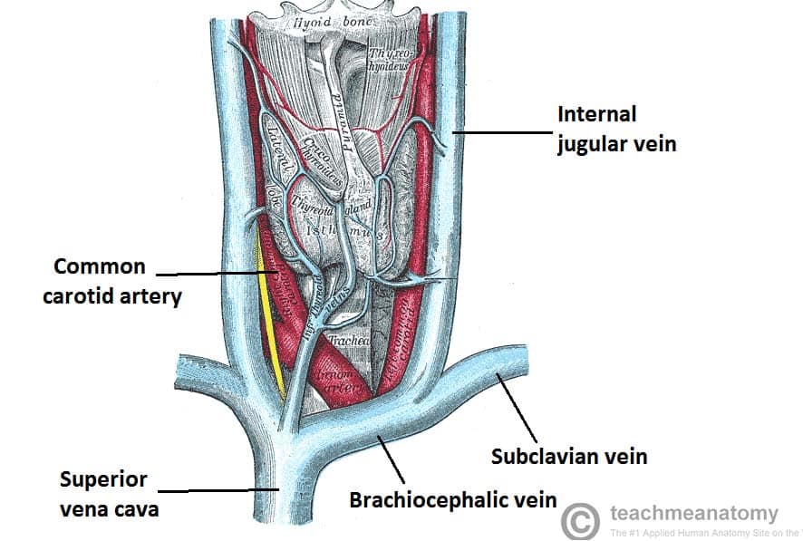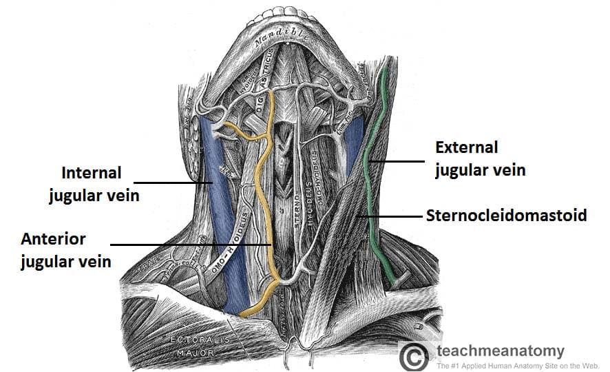 Venous Drainage of the Head and Neck - Podcast Version TeachMeAnatomy 0:00 / 0:00 1x 0.25x 0.5x 0.75x 1x 1.25x 1.5x 1.75x 2x The venous system of the head and neck collect deoxygenated blood and return it to the heart. The venous drainage can be divided into three parts: Venous drainage of the brain and meninges – drained by the dural venous sinuses. Venous drainage of the scalp and face – drained by veins synonymous with the arteries of the face and scalp. These empty into the internal and external jugular veins. Venous drainage of the neck – drained by the jugular veins. In this article, we shall look at the anatomy of the venous drainage of the head and neck – its anatomical course, tributaries, and any clinical correlations. Pro Feature - 3D Model You've Discovered a Pro Feature Access our 3D Model Library Explore, cut, dissect, annotate and manipulate our 3D models to visualise anatomy in a dynamic, interactive way. Learn More Jugular Veins There are three main jugular veins – external, internal and anterior. They are ultimately responsible for the venous drainage of the whole head and neck. External Jugular Vein The external jugular vein and its tributaries supply the majority of the external face. It is formed by the union of two veins: Posterior auricular vein – drains the area of scalp superior and posterior to the outer ear. Retromandibular vein (posterior branch) – itself formed by the maxillary and superficial temporal veins, which drain the face. These two veins combine immediately posterior to the angle of mandible, and inferior to the outer ear, forming the external jugular vein. After formation, the external jugular vein descends down the neck within the superficial fascia. It runs anteriorly to the sternocleidomastoid muscle, crossing it in an oblique, posterior and inferior direction. In the root of the neck, the vein passes underneath the clavicle, and terminates by draining into the subclavian vein. Along its route down the neck, the external jugular vein receives tributaries – posterior external jugular, transverse cervical and suprascapular veins. By TeachMeSeries Ltd (2025) Fig 1Major tributaries of the external jugular vein, draining the external face and scalp. The facial and internal jugular veins are labelled for completeness Clinical Relevance Severance of the External Jugular Vein The external jugular vein has a relatively superficial course down the neck, leaving it vulnerable to damage. If it is severed, in an injury such as a knife slash, its lumen is held open – this is due to the thick layer of investing fascia (for more information see Fascial Layers of the Neck). Air will be drawn into the vein, producing cyanosis, and can stop blood flow through the right atrium. This is a medical emergency, managed by the application of pressure to the wound – stopping the bleeding, and the entry of air. Anterior Jugular Veins The anterior jugular veins vary from person to person. They are paired veins, which drain the anterior aspect of the neck. Often they will communicate via a jugular venous arch. The anterior jugular veins descend down the midline of the neck, emptying into the subclavian vein. By TeachMeSeries Ltd (2025) Fig 2Anterior view of the neck, showing the jugular veins Internal Jugular Vein The internal jugular vein (IJV) begins in the cranial cavity as a continuation of the sigmoid sinus. The initial part of the internal jugular vein is dilated and is known as the superior bulb. It exits the skull via the jugular foramen. In the neck, the internal jugular vein descends within the carotid sheath, deep to the sternocleidomastoid muscle and lateral to the common carotid artery. At the base of the neck, posteriorly to the sternal end of the clavicle, the IJV combines with the subclavian vein to form the brachiocephalic vein. Immediately prior to this, the inferior end of internal jugular vein dilates to form the inferior bulb. It has a valve that stops back-flow of blood. During its descent down the neck, the internal jugular vein receives blood from the facial, lingual, occipital, superior and middle thyroid veins. These veins drain blood from the anterior face, trachea, thyroid, oesophagus, larynx, and muscles of the neck. By TeachMeSeries Ltd (2025) Fig 3The internal jugular vein and the formation of the brachiocephalic vein Clinical Relevance Jugular Venous Pressure In clinical practice, the internal jugular vein can be observed for pulsations – the nature of which provide an estimation of right atrial pressure. When the heart contracts, a pressure wave passes upwards, which can be observed. There are no valves in the brachiocephalic or subclavian veins – so the pulsations are a fairly accurate indication of right atrial pressure Pro Feature - Dissection Atlas Prosection of the venous drainage of the face. Prosection of the venous drainage of the face. You've Discovered a Pro Feature Access our Dissection Image Library Enhance your understanding with high-resolution dissection images showcasing real-life anatomy. Learn More Dural Venous Sinuses The dural venous sinuses are spaces between the periosteal and meningeal layers of dura mater, which are lined by endothelial cells. They collect venous blood from the veins that drain the brain and bony skull, and ultimately drain into the internal jugular vein. Clinical Relevance Cavernous Sinus The cavernous sinuses are a clinically important pair of dural sinuses. They are located next to the lateral aspect of the body of the sphenoid bone. This sinus receives blood from the superior and inferior ophthalmic veins, the middle superficial cerebral veins, and from another dural venous sinus; the sphenoparietal sinus. Located within the cavernous sinus is the internal carotid artery, which crosses the sinus. This allows for cooling of the arterial blood before it reaches the brain. Along with the internal carotid artery, the abducens (VI) nerve crosses the sinus. Several nerves are locat