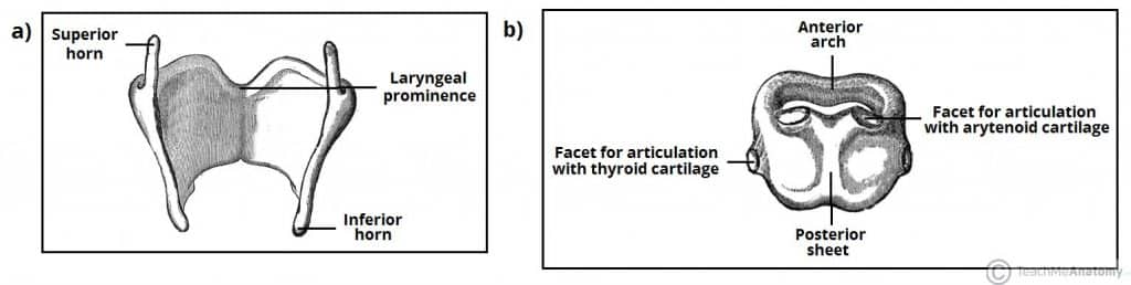 Laryngeal Cartilages - Podcast Version TeachMeAnatomy 0:00 / 0:00 1x 0.25x 0.5x 0.75x 1x 1.25x 1.5x 1.75x 2x The larynx (voice box) is an organ located in the anterior neck. It is a component of the respiratory tract, and has several important functions, including phonation, the cough reflex, and protection of the lower respiratory tract. There are nine cartilages located within the larynx; three unpaired, and six paired. They form the laryngeal skeleton, which provides rigidity and stability. In this article, we shall examine the anatomy of the laryngeal cartilages. Pro Feature - 3D Model You've Discovered a Pro Feature Access our 3D Model Library Explore, cut, dissect, annotate and manipulate our 3D models to visualise anatomy in a dynamic, interactive way. Learn More Unpaired Cartilages The three unpaired cartilages are the epiglottis, thyroid and cricoid cartilages. Thyroid Cartilage The thyroid cartilage is a large, prominent structure which is easily visible in adult males. It is composed of two sheets (laminae), which join anteriorly to form the laryngeal prominence (Adam’s apple). The posterior border of each sheet project superiorly and inferiorly to form the superior and inferior horns (also known as cornu). The superior horns are connected to the hyoid bone via the lateral thyrohyoid ligament, while the inferior horns articulate with the cricoid cartilage. Cricoid Cartilage The cricoid cartilage is a complete ring of hyaline cartilage, consisting of a broad sheet posteriorly and a much narrower arch anteriorly (said to resemble a signet ring in shape). The cartilage completely encircles the airway, marking the inferior border of the larynx at the level of C6. It articulates with the paired arytenoid cartilages posteriorly, as well as providing an attachment for the inferior horns of the thyroid cartilage. The cricoid is the only complete circle of cartilage in the larynx or trachea. This is of clinical relevance during emergency intubation – as pressure can be applied to the cricoid to occlude the oesophagus, and thus prevent regurgitation of gastric contents (known as cricoid pressure or Sellick’s manoeuvre). Epiglottis The epiglottis is a leaf shaped plate of elastic cartilage which marks the entrance to the larynx. Its ‘stalk’ is attached to the back of the anterior aspect of the thyroid cartilage. During swallowing, the epiglottis flattens and moves posteriorly to close off the larynx and prevent aspiration. By TeachMeSeries Ltd (2025) Fig 1Structure of the (a) thyroid cartilage and (b) cricoid cartilage. Pro Feature - Dissection Atlas The thyroid gland and surrounding structures. The thyroid gland and surrounding structures. You've Discovered a Pro Feature Access our Dissection Image Library Enhance your understanding with high-resolution dissection images showcasing real-life anatomy. Learn More Paired Cartilages There are three paired cartilages – the arytenoid, corniculate and cuneiform. They are situated bilaterally in the larynx. Arytenoid Cartilages The arytenoid cartilages are pyramidal shaped structures that sit on the cricoid cartilage. They consist of an apex, base, three sides and two processes, and provides an attachment point for various key structures in the larynx: Apex – articulates with the corniculate cartilage. Base – articulates with the superior border of the cricoid cartilage. Vocal process – provides attachment for the vocal ligament. Muscular process – provides attachment for the posterior and lateral cricoarytenoid muscles. Corniculate Cartilages The corniculate cartilages are minor cartilaginous structures. They articulate with the apices of the arytenoid cartilages. Cuneiform Cartilages The cuneiform cartilages are located within the aryepiglottic folds. They have no direct attachment, but act to strengthen the folds. By TeachMeSeries Ltd (2025) Fig 2The major cartilages in the laryngeal skeleton. Do you think you’re ready? Take the quiz below Pro Feature - Quiz Laryngeal Cartilages Question 1 of 3 Submitting... Skip Next Rate question: You scored 0% Skipped: 0/3 1800 More Questions Available Upgrade to TeachMeAnatomy Pro Challenge yourself with over 1800 multiple-choice questions to reinforce learning Learn More Rate This Article