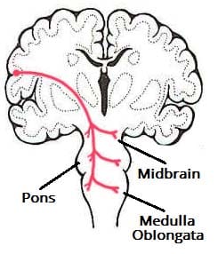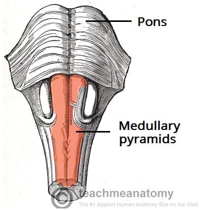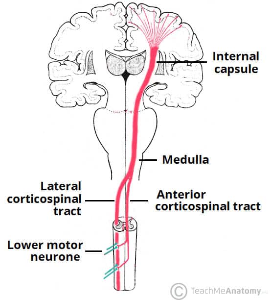 The Descending Tracts - Podcast Version TeachMeAnatomy 0:00 / 0:00 1x 0.25x 0.5x 0.75x 1x 1.25x 1.5x 1.75x 2x This article is about the descending tracts of the central nervous system. The descending tracts are the pathways by which motor signals are sent from the brain to lower motor neurones. The lower motor neurones then directly innervate muscles to produce movement. The motor tracts can be functionally divided into two major groups: Pyramidal tracts – These tracts originate in the cerebral cortex, carrying motor fibres to the spinal cord and brain stem. They are responsible for the voluntary control of the musculature of the body and face. Extrapyramidal tracts – These tracts originate in the brain stem, carrying motor fibres to the spinal cord. They are responsible for the involuntary and automatic control of all musculature, such as muscle tone, balance, posture and locomotion There are no synapses within the descending pathways. At the termination of the descending tracts, the neurones synapse with a lower motor neurone. Thus, all the neurones within the descending motor system are classed as upper motor neurones. Their cell bodies are found in the cerebral cortex or the brain stem, with their axons remaining within the CNS. By TeachMeSeries Ltd (2025) Fig 1Schematic of the motor nervous system. The descending tracts are represented by upper motor neurones. Pro Feature - 3D Model You've Discovered a Pro Feature Access our 3D Model Library Explore, cut, dissect, annotate and manipulate our 3D models to visualise anatomy in a dynamic, interactive way. Learn More Pyramidal Tracts The pyramidal tracts derive their name from the medullary pyramids of the medulla oblongata, which they pass through. These pathways are responsible for the voluntary control of the musculature of the body and face. Functionally, these tracts can be subdivided into two: Corticospinal tracts – supplies the musculature of the body. Corticobulbar tracts – supplies the musculature of the head and neck. We shall now discuss both pathways in further detail. By TeachMeSeries Ltd (2025) Fig 2The medullary pyramids Corticospinal Tracts The corticospinal tracts begin in the cerebral cortex, from which they receive a range of inputs: Primary motor cortex Premotor cortex Supplementary motor area They also receive nerve fibres from the somatosensory area, which play a role in regulating the activity of the ascending tracts. After originating from the cortex, the neurones converge, and descend through the internal capsule (a white matter pathway, located between the thalamus and the basal ganglia). This is clinically important, as the internal capsule is particularly susceptible to compression from haemorrhagic bleeds, known as a ‘capsular stroke‘. Such an event could cause a lesion of the descending tracts. After the internal capsule, the neurones pass through the crus cerebri of the midbrain, the pons and into the medulla. In the most inferior (caudal) part of the medulla, the tract divides into two: The fibres within the lateral corticospinal tract decussate (cross over to the other side of the CNS). They then descend into the spinal cord, terminating in the ventral horn (at all segmental levels). From the ventral horn, the lower motor neurones go on to supply the muscles of the body. The anterior corticospinal tract remains ipsilateral, descending into the spinal cord. They then decussate and terminate in the ventral horn of the cervical and upper thoracic segmental levels. By TeachMeSeries Ltd (2025) Fig 3The corticospinal tracts. Note the area of decussation of the lateral corticospinal tract in the medulla. Corticobulbar Tracts The corticobulbar tracts arise from the lateral aspect of the primary motor cortex. They receive the same inputs as the corticospinal tracts. The fibres converge and pass through the internal capsule to the brainstem. The neurones terminate on the motor nuclei of the cranial nerves. Here, they synapse with lower motor neurones, which carry the motor signals to the muscles of the face and neck. Clinically, it is important to understand the organisation of the corticobulbar fibres. Many of these fibres innervate the motor neurones bilaterally. For example, fibres from the left primary motor cortex act as upper motor neurones for the right and left trochlear nerves. There are a few exceptions to this rule: Upper motor neurones for the facial nerve (CN VII) have a contralateral innervation. This only affects the muscles in the lower quadrant of the face – below the eyes. (The reasons for this are beyond the scope of this article) Upper motor neurons for the hypoglossal (CN XII) nerve only provide contralateral innervation. By TeachMeSeries Ltd (2025) Fig 4Overview of the right corticobulbar tract. Note that this is a simplified diagram, ignoring the bilateral nature of these pathways. Extrapyramidal Tracts The extrapyramidal tracts originate in the brainstem, carrying motor fibres to the spinal cord. They are responsible for the involuntary and automatic control of all musculature, such as muscle tone, balance, posture and locomotion. There are four tracts in total. The vestibulospinal and reticulospinal tracts do not decussate, providing ipsilateral innervation. The rubrospinal and tectospinal tracts do decussate, and therefore provide contralateral innervation Vestibulospinal Tracts There are two vestibulospinal pathways; medial and lateral. They arise from the vestibular nuclei, which receive input from the organs of balance. The tracts convey this balance information to the spinal cord, where it remains ipsilateral. Fibres in this pathway control balance and posture by innervating the ‘anti-gravity’ muscles (flexors of the arm, and extensors of the leg), via lower motor neurones. Reticulospinal Tracts The two recticulospinal tracts have differing functions: Medial reticulospinal tract – arises from the pons. It facilitates voluntary movements, and increases muscle tone. 