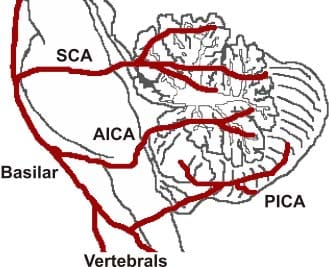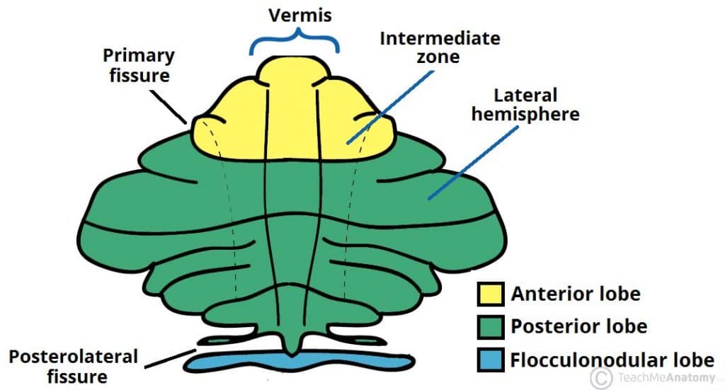 The Cerebellum - Podcast Version TeachMeAnatomy 0:00 / 0:00 1x 0.25x 0.5x 0.75x 1x 1.25x 1.5x 1.75x 2x The cerebellum, which stands for “little brain”, is a structure of the central nervous system. It has an important role in motor control, with cerebellar dysfunction often presenting with motor signs. In particular, it is active in the coordination, precision and timing of movements, as well as in motor learning. During embryonic development, the anterior portion of the neural tube forms three parts that give rise to the brain and associated structures: Forebrain (prosencephalon) Midbrain (mesencephalon) Hindbrain (rhombencephalon) The hindbrain subsequently divides into the metencephalon (superior) and the myelencephalon (inferior). The cerebellum develops from the metencephalon division. This article will focus on the anatomy of the cerebellum. It will provide a brief overview of its functions and development, and finally it will highlight the clinical relevance of cerebellar disorders. Pro Feature - 3D Model You've Discovered a Pro Feature Access our 3D Model Library Explore, cut, dissect, annotate and manipulate our 3D models to visualise anatomy in a dynamic, interactive way. Learn More Anatomical Location The cerebellum is located at the back of the brain, immediately inferior to the occipital and temporal lobes, and within the posterior cranial fossa. It is separated from these lobes by the tentorium cerebelli, a tough layer of dura mater. It lies at the same level of and posterior to the pons, from which it is separated by the fourth ventricle. By TeachMeSeries Ltd (2025) Fig 1Anatomical position of the cerebellum. It is inferior to the cerebrum, and posterior to the pons. Anatomical Structure and Divisions The cerebellum consists of two hemispheres which are connected by the vermis, a narrow midline area. Like other structures in the central nervous system, the cerebellum consists of grey matter and white matter: Grey matter – located on the surface of the cerebellum. It is tightly folded, forming the cerebellar cortex. White matter – located underneath the cerebellar cortex. Embedded in the white matter are the four cerebellar nuclei (the dentate, emboliform, globose, and fastigi nuclei). There are three ways that the cerebellum can be subdivided – anatomical lobes, zones and functional divisions Anatomical Lobes There are three anatomical lobes that can be distinguished in the cerebellum; the anterior lobe, the posterior lobe and the flocculonodular lobe. These lobes are divided by two fissures – the primary fissure and posterolateral fissure. By TeachMeSeries Ltd (2025) Fig 2Anatomical lobes of the cerebellum. Zones There are three cerebellar zones. In the midline of the cerebellum is the vermis. Either side of the vermis is the intermediate zone. Lateral to the intermediate zone are the lateral hemispheres. There is no difference in gross structure between the lateral hemispheres and intermediate zones By Nrets [CC-BY-SA-3.0], from Wikimedia Commons Fig 3Superior view of an “unrolled” cerebellum, placing the vermis in one plane. Functional Divisions The cerebellum can also be divided by function. There are three functional areas of the cerebellum – the cerebrocerebellum, the spinocerebellum and the vestibulocerebellum. Cerebrocerebellum – the largest division, formed by the lateral hemispheres. It is involved in planning movements and motor learning. It receives inputs from the cerebral cortex and pontine nuclei, and sends outputs to the thalamus and red nucleus. This area also regulates coordination of muscle activation and is important in visually guided movements. Spinocerebellum – comprised of the vermis and intermediate zone of the cerebellar hemispheres. It is involved in regulating body movements by allowing for error correction. It also receives proprioceptive information. Vestibulocerebellum – the functional equivalent to the flocculonodular lobe. It is involved in controlling balance and ocular reflexes, mainly fixation on a target. It receives inputs from the vestibular system, and sends outputs back to the vestibular nuclei. Vasculature The cerebellum receives its blood supply from three paired arteries: Superior cerebellar artery (SCA) Anterior inferior cerebellar artery (AICA) Posterior inferior cerebellar artery (PICA) The SCA and AICA are branches of the basilar artery, which wraps around the anterior aspect of the pons before reaching the cerebellum. The PICA is a branch of the vertebral artery. Venous drainage of the cerebellum is by the superior and inferior cerebellar veins. They drain into the superior petrosal, transverse and straight dural venous sinuses. By TeachMeSeries Ltd (2025) Fig 4Arterial supply to the cerebellum. Clinical Relevance Cerebellar Dysfunction Dysfunction of the cerebellum can produce a wide range of symptoms and signs. The aetiology is varied; causes include stroke, physical trauma, tumours and chronic alcohol excess. The clinical picture is dependent on the functional area of the cerebellum that is affected. Damage to the cerebrocerebellum and spinocerebellum presents with problems in carrying out skilled and planned movements and in motor learning. A wide variety of manifestations are possible. These can be remembered using the acronym ‘DANISH‘: Dysdiadochokinesia (difficulty in carrying out rapid, alternating movements) Ataxia Nystagmus (coarse) Intention tremor Scanning speech Hypotonia Damage to the vestibulocerebellum can manifest with loss of balance, abnormal gait with a wide stance. By James Heilman, MD (Own work) [CC BY-SA 3.0], via Wikimedia Commons Fig 5CT scan of a left sided cerebellar stroke. Do you think you’re ready? Take the quiz below Pro Feature - Quiz The Cerebellum Question 1 of 3 Submitting... Skip Next Rate question: You scored 0% Skipped: 0/3 1800 More Questions Available Upgrade to TeachMeAnatomy Pro Challenge yourself with over 1800 multiple-choice questions to reinforce lea