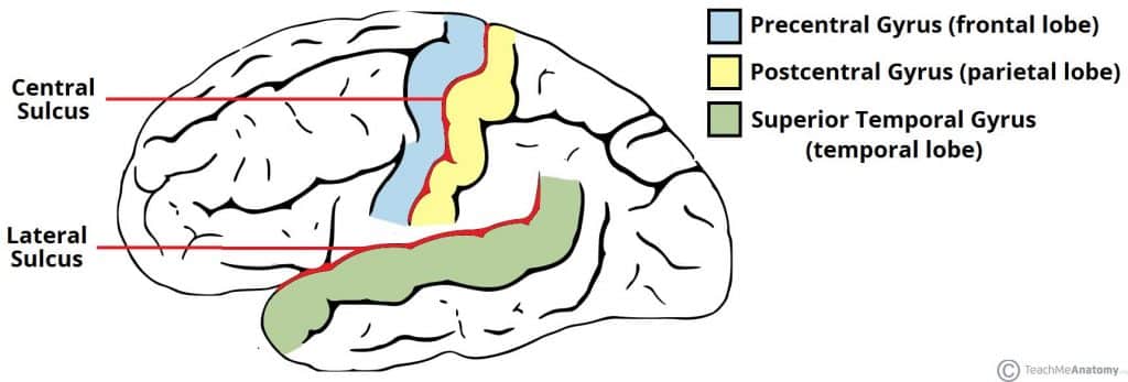 The Cerebrum - Podcast Version TeachMeAnatomy 0:00 / 0:00 1x 0.25x 0.5x 0.75x 1x 1.25x 1.5x 1.75x 2x The cerebrum is the largest part of the brain, located superiorly and anteriorly in relation to the brainstem. It consists of two cerebral hemispheres (left and right), separated by the falx cerebri of the dura mater. Embryologically, the cerebrum is derived from the prosencephalon. In this article, we will look at the anatomy of the cerebrum – its structure, function, blood supply and the clinical implications of cerebral lesions. Pro Feature - 3D Model You've Discovered a Pro Feature Access our 3D Model Library Explore, cut, dissect, annotate and manipulate our 3D models to visualise anatomy in a dynamic, interactive way. Learn More Anatomical Position and Structure Database Center for Life Science and BodyParts3D [CC BY-SA 2.1 jp], via Wikimedia Commons Fig 1Anatomical position of the cerebrum. The cerebrum is located within the bony cranium. It extends from the frontal bone anteriorly to the occipital bone posteriorly. Within the skull, the cerebrum fills the anterior and middle cranial fossae, and is located above the tentorium cerebelli inferoposteriorly. Internal Structure The cerebrum is comprised of two different types of tissue – grey matter and white matter: Grey matter forms the surface of each cerebral hemisphere (known as the cerebral cortex), and is associated with processing and cognition. White matter forms the bulk of the deeper parts of the brain. It consists of glial cells and myelinated axons that connect the various grey matter areas. External Structure Externally, the cerebrum has a highly convoluted appearance, consisting of sulci (grooves or depressions) and gyri (ridges or elevations). It is divided into two anatomically symmetrical hemispheres by the longitudinal fissure – a major sulcus that runs in the median sagittal plane. The falx cerebri (a fold of dura mater) descends vertically to fill this fissure. The two cerebral hemispheres are connected by a white matter structure, called the corpus callosum. The main sulci are: Central sulcus – groove separating the frontal and parietal lobes. Lateral sulcus – groove separating the frontal and parietal lobes from the temporal lobe. Lunate sulcus – groove located in the occipital cortex. The main gyri are: Precentral gyrus – ridge directly anterior to central sulcus, location of primary motor cortex. Postcentral gyrus – ridge directly posterior to central sulcus, location of primary somatosensory cortex. Superior temporal gyrus – ridge located inferior to lateral sulcus, responsible for the reception and processing of sound. By TeachMeSeries Ltd (2025) Fig 2The notable sulci and gyri of the cerebrum. Lobes of the Cerebrum The cerebral cortex is classified into four lobes, according to the name of the corresponding cranial bone that approximately overlies each part. Each lobe contains various cortical association areas – where information from different modalities are collated for processing. Together, these areas function to give us a meaningful perceptual interpretation and experience of our surrounding environment. Frontal Lobe The frontal lobe is located beneath the frontal bone of the calvaria and is the most anterior region of the cerebrum. It is separated from the parietal lobe posteriorly by the central sulcus and from the temporal lobe inferoposteriorly by the lateral sulcus. The association areas of the frontal lobe are responsible for: higher intellect, personality, mood, social conduct and language (dominant hemisphere side only). Parietal Lobe The parietal lobe is found below the parietal bone of the calvaria, between the frontal lobe anteriorly and the occipital lobe posteriorly, from which it is separated by the central sulcus and parieto-occipital sulcus, respectively. It sits superiorly in relation to the temporal lobe, being separated by the lateral sulcus. Its cortical association areas contribute to the control of: language and calculation on the dominant hemisphere side, and visuospatial functions (e.g. 2-point discrimination) on the non-dominant hemisphere side. Temporal Lobe The temporal lobe sits beneath the temporal bone of the calvaria, inferior to the frontal and parietal lobes, from which it is separated by the lateral sulcus. The cortical association areas of the temporal lobe are accountable for memory and language – this includes hearing as it is the location of the primary auditory cortex. Occipital Lobe The occipital lobe is the most posterior part of the cerebrum situated below the occipital bone of the calvaria. Its inferior aspect rests upon the tentorium cerebelli, which segregates the cerebrum from the cerebellum. The parieto-occipital sulcus separates the occipital lobe from the parietal and temporal lobes anteriorly. The primary visual cortex (V1) is located within the occipital lobe and hence its cortical association area is responsible for vision. By TeachMeSeries Ltd (2025) Fig 3The lobes of the cerebral cortex. Vasculature The blood supply to the cerebrum can be simply classified into 3 distinct paired arterial branches: Anterior Cerebral Arteries – branches of internal carotid arteries, supplying the anteromedial aspect of the cerebrum. Middle Cerebral Arteries – continuation of internal carotid arteries, supplying most of the lateral portions of the cerebrum. Posterior Cerebral Arteries – branches of the basilar arteries, supplying both the medial and lateral sides of the cerebrum posteriorly. Venous drainage of the cerebrum is via a network of small cerebral veins. These vessels empty into the dural venous sinuses – endothelial lined spaces between the outer and inner layers of dura mater. By Frank Gaillard and Patrick J. Lynch [CC-BY-SA-3.0], via Wikimedia Commons Fig 4Overview of the blood supply to the cerebrum. Clinical Relevance Cerebrovascular Accident A cerebrovascular accident (also known as a stroke) is defined clinically as “an a