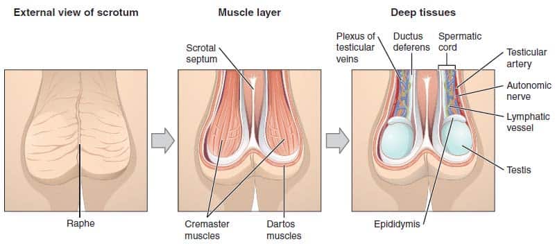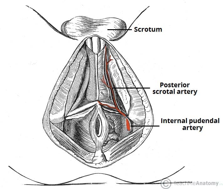 The Scrotum - Podcast Version TeachMeAnatomy 0:00 / 0:00 1x 0.25x 0.5x 0.75x 1x 1.25x 1.5x 1.75x 2x The scrotum is a fibromuscular cutaneous sac, located between the penis and anus. It is dual-chambered, forming an expansion of the perineum. Embryologically, the scrotum is derived from the paired genital swellings. During development, the genital swellings fuse in the midline – in the adult this fusion is marked by the scrotal raphe. The scrotum is biologically homologous to the labia majora. In this article, we shall look at the anatomy of the scrotum – its contents, blood supply and innervation. Pro Feature - 3D Model You've Discovered a Pro Feature Access our 3D Model Library Explore, cut, dissect, annotate and manipulate our 3D models to visualise anatomy in a dynamic, interactive way. Learn More Contents The scrotum contains three major (paired) structures: Testis – the site of sperm production. Epididymis – situated at the head of each testicle. It functions as a storage reservoir for sperm. Spermatic cord – a collection of muscle fibres, vessels, nerves and ducts that run to and from the testes. There are also muscle fibres located within the scrotum. The dartos muscle is a sheet of smooth muscle, situated immediately underneath the skin. It acts to help regulate the temperature of the scrotum, by wrinkling the skin – this decreases surface area, reducing heat loss. By OpenStax College [CC BY 3.0], via Wikimedia Commons Fig 1The scrotum, muscle layer and contents. Neurovascular Supply The scrotum receives neurovascular supply from the nearby vessels and nerves. This is in contrast to the testes – which carry their vessels, nerves and lymph drainage from the abdomen during their development. Blood Supply The scrotum receives arterial supply from the anterior and posterior scrotal arteries. The anterior scrotal artery arises from the external pudendal artery, while the posterior is derived from the internal pudendal artery. The scrotal veins follow the major arteries, draining into the external pudendal veins. Innervation The cutaneous innervation to the scrotum is supplied via several nerves, according to the topography: Anterior and anterolateral aspect – Anterior scrotal nerves derived from the genital branch of genitofemoral nerve and ilioinguinal nerve Posterior aspect – Posterior scrotal nerves derived from the perineal branches of the pudendal nerve and posterior femoral cutaneous nerve. By TeachMeSeries Ltd (2025) Fig 2The origin of the posterior scrotal artery. Lymphatics The lymphatic fluid from the scrotum drains to the nearby superficial inguinal nodes. Clinical Relevance Haematoma of the Scrotum A haematoma may develop in the scrotum as a result of scrotal surgery or trauma in the genital region (Figure 3). This results in swelling (oedema) and discolouration of the scrotal skin. Occasionally the origin of bleeding may not arise from the scrotal contents (i.e. spermatic cord and testis) but from the basal part of the penile urethra (the bulbar urethra) as in “straddle injuries” – direct perineal trauma like when falling onto a bicycle crossbar. Kostis Gyftopoulos MD, PhD Fig 3A scrotal haematoma. Do you think you’re ready? Take the quiz below Pro Feature - Quiz The Scrotum Question 1 of 3 Submitting... Skip Next Rate question: You scored 0% Skipped: 0/3 1800 More Questions Available Upgrade to TeachMeAnatomy Pro Challenge yourself with over 1800 multiple-choice questions to reinforce learning Learn More Rate This Article