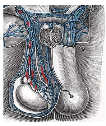 • Varicocoele – gross dilation of the veins draining the testes. The left testicle is more commonly affected, as the left testicular vein is longer and drains into the left renal vein at a perpendicular angle.