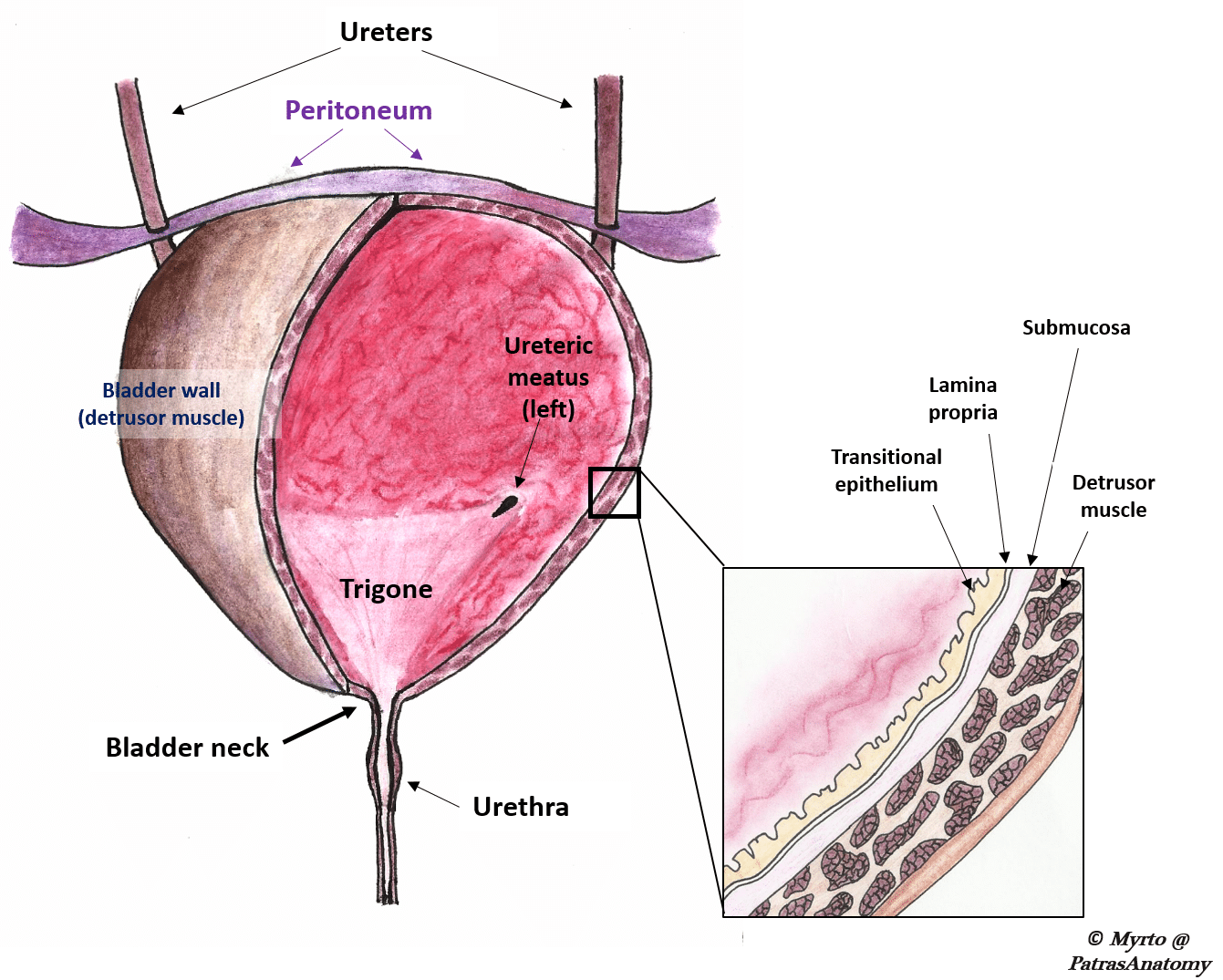 The urinary bladder sits centrally in the pelvis and stores urine before it is passed. It is a highly distensible organ, and can stretch superiorly to contain roughly half a litre of fluid. It has a muscular wall as well as two muscular sphincters, found inferiorly. These sphincters carry out the bladder’s second function, assisting in the expulsion of urine.