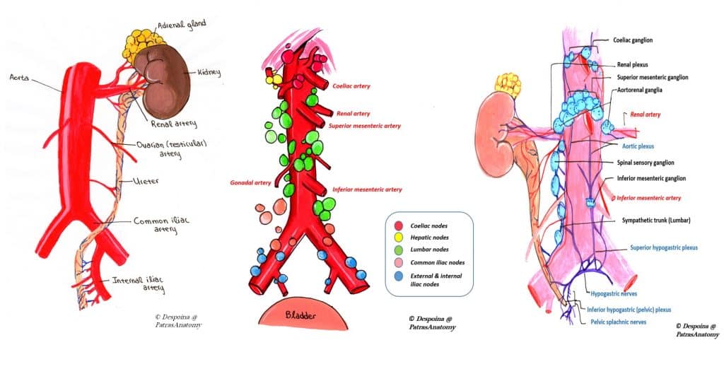 The Ureters - Podcast Version TeachMeAnatomy 0:00 / 0:00 1x 0.25x 0.5x 0.75x 1x 1.25x 1.5x 1.75x 2x The ureters are two thick tubes which act to transport urine from the kidney to the bladder. They are approximately 25cm long and are situated bilaterally, with each ureter draining one kidney. In this article, we shall look at the anatomy of the ureters – their anatomical course, neurovascular supply and clinical correlations. Pro Feature - 3D Model You've Discovered a Pro Feature Access our 3D Model Library Explore, cut, dissect, annotate and manipulate our 3D models to visualise anatomy in a dynamic, interactive way. Learn More Anatomical Course The ureters arise in the abdomen as a continuation of the renal pelvis, and terminate in the pelvic cavity – where they empty into the bladder. The anatomical course of the ureters can therefore be divided into abdominal and pelvic components. Abdominal Part The ureters arise from the renal pelvis – a funnel like structure located within the hilum of the kidney. The renal pelvis receives urine from the major calyces. The point at which the renal pelvis narrows to form the ureter is known as the ureteropelvic junction. After arising from the ureteropelvic junction, the ureters descend through the abdomen, along the anterior surface of the psoas major. Here, the ureters are a retroperitoneal structure (located behind the peritoneum). At the area of the sacroiliac joints, the ureters cross the pelvic brim, thus entering the pelvic cavity. At this point, they also cross the bifurcation of the common iliac arteries. By TeachMeSeries Ltd (2025) Fig 1The anatomical course of the ureters from the renal pelvis to the bladder. Pelvic Part Once within the pelvic cavity, the ureters travel down the lateral pelvic walls. At the level of the ischial spines, they turn anteromedially, moving in a transverse plane towards the bladder. Upon reaching the bladder wall, the ureters pierce its lateral aspect in an oblique manner. This creates a one way valve, where high intramural pressure collapses the ureters – preventing the back-flow of urine. Clinical Relevance Vascular Relations of the Ureters The anatomical course of the ureters is of surgical importance, as they travel close to other structures in the pelvis. They must be identified during pelvic surgery to ensure that they are not accidentally damaged. Female As they cross the pelvic brim, the ureters are in close proximity to the ovaries. Care must be taken not the damage the ureters during an oophorectomy, especially during the ligation of the ovarian arteries. Approximately 2cm superior to the ischial spine, the ureters run underneath the uterine artery. During a hysterectomy, where the uterus and uterine artery are removed, the ureter is in danger of being accidentally damaged. The relationship between the two can be remembered using the phrase ‘water under the bridge’. By TeachMeSeries Ltd (2025) Fig 2Relationship between the ureter and uterine artery. Male In men, instead of the uterine arteries, the vas deferens cross the ureters anteriorly. Neurovascular Supply The ureter is a structure that has developed via the ureteric bud from the mesonephric duct, and then followed the kidney during its ascend to the final lumbar position in the retroperitoneum. This long, ascending course has enabled the ureter to acquire vessels (arteries, veins and lymph vessels) of different origin during its route. The arterial supply to the ureters can be divided into abdominal and pelvic supply: Abdominal – renal artery, testicular/ovarian artery, and ureteral branches directly from the abdominal aorta Pelvic – superior and inferior vesical arteries. Venous drainage is carried out by vessels that correspond to the aforementioned arteries. Nervous supply to the ureters is delivered via the renal, testicular/ovarian and hypogastric plexuses. Sensory fibres from the ureters enter the spinal cord at T11-L2, with ureteric pain referred to those dermatomal areas. Despoina @ PatrasAnatomy Fig 3The neurovascular and lymphatic supply to the ureters. Clinical Relevance Ureteric Calculus A ureteric calculus (or kidney stone), is the presence of a solid stone in the urinary tract, formed from minerals within the urine. These can obstruct urinary flow, causing renal colic (an acute and severe loin pain) and haematuria (blood in the urine). There are three locations where the ureters are at their narrowest – this is where a stone is more likely to become stuck: Uretopelvic junction Pelvic brim Where the ureter enters the bladder The gold standard investigation for suspected ureteric calculus is CT scan of the kidneys, ureters and bladder (CT-KUB). By James Heilman, MD [CC BY-SA 3.0] Fig 4A ureteric stone on CT KUB Do you think you’re ready? Take the quiz below Pro Feature - Quiz The Ureters Question 1 of 2 Submitting... Skip Next Rate question: You scored 0% Skipped: 0/2 1800 More Questions Available Upgrade to TeachMeAnatomy Pro Challenge yourself with over 1800 multiple-choice questions to reinforce learning Learn More Rate This Article