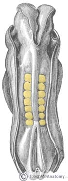Dermatomes - Podcast Version TeachMeAnatomy 0:00 / 0:00 1x 0.25x 0.5x 0.75x 1x 1.25x 1.5x 1.75x 2x A dermatome is defined as ‘a strip of skin that is innervated by a single spinal nerve‘. They are of great diagnostic importance, as they allow the clinician to determine whether there is damage to the spinal cord, and to estimate the extent of a spinal injury if there is one present. In this article, we shall look at the embryonic origins of dermatomes, and explore their clinical uses. Pro Feature - 3D Model You've Discovered a Pro Feature Access our 3D Model Library Explore, cut, dissect, annotate and manipulate our 3D models to visualise anatomy in a dynamic, interactive way. Learn More Origins of Dermatomes By TeachMeSeries Ltd (2025) Fig 1Somites adjacent to the neural tube. We can trace back the origins of dermatomes to the 3rd week of embryogenesis. At around day 20, the tri-laminar disc has been established and the middle layer (mesoderm) has differentiated into its different types. The portion that is directly adjacent to the neural tube is called paraxial mesoderm. From day 20 onwards the paraxial mesoderm differentiates into segments called somites. 44 pairs of somites are formed, but 13 of these break down leaving 31 somites. This corresponds to the 31 sets of spinal nerves in the body. The somites themselves are comprised of a ventral and a dorsal portion. The ventral portion consists of sclerotome, the precursor to the ribs and vertebral column. The dorsal portion consists of dermomyotome. Over time, the myotome proliferates and the dermatome disperses to form dermis. As the limbs grow, the dermis associated with the precursor of the limbs is stretched and moved down the limb, creating the segmental innervation that is associated with the Keegan and Garrett dermatome map of 1948. Dermatome Maps There are two main maps that are accepted by the medical profession. The first is the Keegan and Garret map of 1948. This depicts dermatomes in a way that correlates with the segmental progression of limb development. The second is the Foerster map of 1933 which depicts the medial part of the upper limb as being innervated by T1-T3 which follows the distribution of pain from angina or an MI. This is the most commonly used map, and features in the ASIA scale of assessing spinal injury. Both maps depict progression of limb growth around an axial line. Across this line there is no overlap between dermatomes, but often those adjacent each other have a slight overlap. By TeachMeSeries Ltd (2025) Fig 2The Keegan and Garrett dermatomal distribution. Clinical Relevance Assessing Spinal Cord Lesions Following a traumatic injury that may involve the spinal cord, the clinician can test dermatomes to determine the presence and the extent of a spinal cord lesion. Firstly, the clinician uses cotton wool to test for light touch sensation along the limbs and torso, touching areas which correspond to the different dermatomes. Secondly the clinician uses a small pin to test for responsiveness to pain. The patient is instructed to close their eyes and say when they feel contact with their skin (Light touch and pain are tested separately as their fibres travel in different parts of the spinal cord – see here). By using their knowledge of dermatomal and peripheral cutaneous innervation, and noting any regions of paresthesia, the clinician is able to ascertain whether there is any nerve involvement. Also, they can determine whether this is at the spinal root or peripheral nerve level. By TeachMeSeries Ltd (2025) Fig 3The ASIA scale. It used to assess patients with a potential spinal nerve lesion. Do you think you’re ready? Take the quiz below Pro Feature - Quiz Dermatomes Question 1 of 2 Submitting... Skip Next Rate question: You scored 0% Skipped: 0/2 1800 More Questions Available Upgrade to TeachMeAnatomy Pro Challenge yourself with over 1800 multiple-choice questions to reinforce learning Learn More Rate This Article