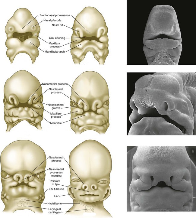 Development of the Face and Palate - Podcast Version TeachMeAnatomy 0:00 / 0:00 1x 0.25x 0.5x 0.75x 1x 1.25x 1.5x 1.75x 2x The external human face develops between the 4th and 6th week of embryonic development. The development of the face is completed by the 6th week. Between the 6th and 8th week, the palate begins to develop. Consequently, this causes a distinction between the nasal and oral cavities. This development is completed by the 12th week. In this article, we will outline the processes involved in the development of the face and palate. We will discuss the conditions associated with the complex development of these structures. Pro Feature - 3D Model You've Discovered a Pro Feature Access our 3D Model Library Explore, cut, dissect, annotate and manipulate our 3D models to visualise anatomy in a dynamic, interactive way. Learn More Background There are two important tissue structures involved in development of the nose and face – the pharyngeal arches and neural crest cells. In the developing embryo, there are six pharyngeal arches. They arise in the fourth week of development as out-pocketings of mesoderm on both sides of the pharynx. Each pharyngeal arch has a branch of the aorta, a cranial nerve and a cartilage bar associated with it. Neural crest cells are a specialised cell lineage which originate from neuroectoderm. As the neural tube forms, cells from the lateral border of the neuroectoderm are displaced into mesoderm, and from there they migrate throughout the body to form various structures. Of relevance to the head and neck, these cells enter the pharyngeal arches to help contribute to their derivatives. By Ruksana Begum, TeachMeAnatomy Fig 1The pharyngeal arches, clefts and pouches of the head and neck. Development of the Face During week 3 of embryonic development, an oropharyngeal membrane initially appears at the site of the future face. It is comprised of ectoderm and endoderm – externally and internally, respectively. During the 4th week, the oropharyngeal membrane begins to break down in order to become the future oral cavity, and sits at the beginning of the digestive tract. The structures of the external face are derived from two sources: Frontonasal prominence – formed by the proliferation of mesenchymal neural crest cells ventral to the forebrain. Mandibular and maxillary prominences – parts of the 1st pharyngeal arch. A space lies between the maxillary prominences, covered by the oropharyngeal membrane; this is known as the stomatodeum, the precursor to the mouth and pituitary gland. Nasal development is instigated by the appearance of raised bumps called nasal placodes on both sides of the frontonasal prominence. These then invaginate to form nasal pits, with medial and lateral nasal prominences on either side. As the maxillary prominences expand medially, the nasal prominences are ‘pushed’ closer to the midline. The maxillary prominences then fuse with the nasal prominences – and soon after fuse in the midline to form a continuous central structure. By Kicko26 [CC BY-SA 4.0], via Wikimedia Commons Fig 2Development of the Nose and Face. Prominence Derivatives Frontonasal Forehead, bridge of nose, medial and lateral nasal prominences Medial nasal Philtrum, primary palate, upper 4 incisors and associated jaw Lateral nasal Sides of the nose Maxillary (1st pharyngeal arch) Cheeks, lateral upper lip, secondary palate, lateral upper jaw Mandibular (1st pharyngeal arch) Lower lip and jaw Development of the Palate Initially, the nasal cavity is continuous with the oral cavity. A series of steps lead to their separation, and the establishment of the palate. As the nose forms, the fusion of the medial nasal prominence with its contralateral counterpart creates the intermaxillary segment – which forms the primary palate (becomes the anterior 1/3 of the definitive palate). The intermaxillary segment also contributes to the labial component of the philtrum and the upper four incisors. The maxillary prominences expand medially to give rise to the palatal shelves. These continue to advance medially, fusing superior to the tongue. Simultaneously, the developing mandible expands to increase the size of the oral cavity; this allows the tongue to drop out of the way of the growing palatal shelves. The palatal shelves then fuse with each other in the horizontal plane, and the nasal septum in the vertical plane, forming the secondary palate. By TeachMeSeries Ltd (2025) Fig 3Development of the palate from the intermaxillary segment and maxillary prominences Clinical Relevance Cleft Lip and Cleft Palate A cleft refers to a gap/split in the upper lip or palate. It results from a defect during development of face and palate: Cleft lip – occurs when the medial nasal prominence and maxillary prominence fail to fuse. Cleft palate – can occur in isolation when the palatal shelves fail to fuse in the midline, or in combination with cleft lip. Cleft lip and cleft palate are relatively common, occurring in approximately 1/1000 births. In Native Americans, the rate is around 4 times that. In addition to the cosmetic and psychosocial implications, severe cleft lip/palate can be a cause of death if a baby is unable to feed. Other complications include recurrent ear infections and speech impediment. By TeachMeSeries Ltd (2025) Fig 4Cleft palate and cleft lip. Do you think you’re ready? Take the quiz below Pro Feature - Quiz Development of the Face and Palate Question 1 of 3 Submitting... Skip Next Rate question: You scored 0% Skipped: 0/3 1800 More Questions Available Upgrade to TeachMeAnatomy Pro Challenge yourself with over 1800 multiple-choice questions to reinforce learning Learn More Rate This Article