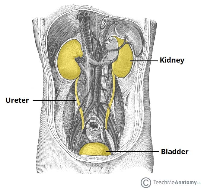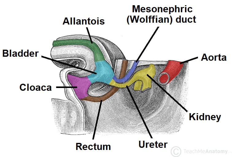 The main functions of the urinary system include: Removal of metabolic waste products such as uric acid, urea and creatinine. Maintain electrolyte, water and pH balance. Regulation of blood pressure, blood volume and erythropoiesis, and vitamin D production. Development of the urinary system is closely related to the development of the reproductive system; particularly during the earlier stages – where they develop from the same origin. However, the urinary system develops ahead of the reproductive system. The urinary system consists of the kidneys, ureters, bladder and urethra. A region of intermediate mesoderm, known as the urogenital ridge, gives rise to these structures. In this article, we will look at the embryology of the urinary system and its clinical correlations. By TeachMeSeries Ltd (2025) Fig 1Overview of the developed urinary system in adults (urethra not depicted). Pro Feature - 3D Model You've Discovered a Pro Feature Access our 3D Model Library Explore, cut, dissect, annotate and manipulate our 3D models to visualise anatomy in a dynamic, interactive way. Learn More Development of the Kidneys In the embryo, the kidneys develop from three overlapping sequential systems; the pronephros, the mesonephros, and the metanephros. They are all derived from the urogenital ridge. Pronephros The pronephros appears in the 4th week of development. Its development begins in the cervical region of the embryo. Segmented divisions of intermediate mesoderm form tubules, known as nephrotomes. In total, 6-10 pairs of nephrotomes are formed. These tubules join into the pronephric duct, which is a duct that extends from the cervical region to the cloaca (distal end) of the embryo. This early system is non-functional and regresses completely by the end of week 4. Mesonephros The mesonephros develops caudally (inferiorly) to the pronephros. First, the presence of the pronephric duct induces nearby intermediate mesoderm in the thoracolumbar region to form mesonephric tubules. These tubules receive a tuft of capillaries from the dorsal aorta – allowing for the filtration of blood – and they drain into the mesonephric duct (a continuation of the pronephric duct). They act as a primitive excretory system in the embryo, with most tubules regressing by the end of the 2nd month. Additionally, the mesonephric duct sprouts the ureteric bud caudally, which induces the development of the definitive kidney. Metanephros The metanephros forms the definitive kidney. It appears in the 5th week of development and becomes functional around the 12th week. The ureteric bud from the mesonephric duct makes contact with a caudal region of intermediate mesoderm – the metanephric blastema (Fig 2). Collectively, these blastema form the metanephric system, which has two components: Collecting system – derived from the ureteric bud. It dilates to create the ureter, renal pelvis, major and minor calyces and collecting tubules – terminating at the distal convoluted tubule. If the uretic bud splits too early, two ureters, or two renal pelvices connecting to one ureter may result. Excretory system – derived from the metanephric blastema. Each collecting tubule from the collecting system is covered by a metanephric tissue cap which gives rise to the excretory tubules. These excretory tubules (along with the developing glomeruli) form the kidney’s functional units – the nephron. The proximal end of the excretory tubule forms the Bowman’s capsule around a glomerulus, while the distal end elongates to form the proximal convoluted tubule, loop of Henle and distal convoluted tubule The definitive kidney initially develops in the pelvic region before ascending into the abdomen. In the pelvis, the kidney receives its blood supply from a pelvic branch of the abdominal aorta and as it ascends, new arteries from the abdominal aorta supply the kidney. The pelvic vessels usually regress, but can persist as accessory renal arteries. Adapted from work by Ashley Sawle [CC BY-SA 3.0], via Wikimedia Commons Fig 2The sequential development and degeneration of the pronephros and mesonephros, and the induction of the ureteric bud and metanephric blastema during kidney development Clinical Relevance Horseshoe Kidney A horseshoe kidney (also known as a cake kidney or fused kidney) is where the two developing kidneys fuse into a single horseshoe-shaped structure. This occurs if the kidneys become too close together during their ascent from the pelvis to the abdomen – they become fused and consequently ‘stuck’ underneath the inferior mesenteric artery. This type of kidney is still drained by two ureters, and is usually asymptomatic, although it can be prone to obstruction. Development of the Bladder and Urethra The bladder and urethra of the urinary system are ultimately derived from the cloaca – a hindgut structure that is a common chamber for gastrointestinal and urinary waste. By TeachMeSeries Ltd (2025) Fig 3Model of an embryo at 32-33 days old. In the 4th-7th weeks of development, the cloaca is divided into two parts by the uro-rectal septum: Urogenital sinus (anterior) – divided into three parts: The upper part of the urogenital sinus forms the bladder. The pelvic part forms the entire urethra and some of the reproductive tract in females, and the prostatic and membranous urethra in males. The phallic/caudal part forms part of the female reproductive tract, and the spongy urethra in males. Anal canal (posterior) The urinary bladder is initially drained by the allantois. However, this is obliterated during fetal development and becomes a fibrous cord – the urachus. A remnant of the urachus can be found in adults; the median umbilical ligament, which connects the apex of the bladder to the umbilicus. As the bladder develops from the urogenital sinus, it absorbs the caudal parts of the mesonephric ducts (also known as the Wolffian ducts), becoming the trigone of the bladder. The ureters, which have formed as outgrowt