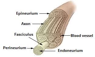 The nervous system allows us to perceive, understand, and respond to our environment. It comprises two different types of cells: Nerve cells (neurones) – these form the functional basis of the nervous system, responsible for transmitting signals as electrical or chemical signals. Glial cells – these provide functional and structural support for the neurones. One example is a Schwann cell, which produces the lipid sheath of peripheral neurones. In this article, we will focus on the ultrastructure of nerves. We will look at the general structure of nerves, their layers of connective tissue and finish by considering some conditions that arise when the normal structure is lost. Pro Feature - 3D Model You've Discovered a Pro Feature Access our 3D Model Library Explore, cut, dissect, annotate and manipulate our 3D models to visualise anatomy in a dynamic, interactive way. Learn More Neuronal Structure There are several different types of neurones found in the nervous system. They all contain the same key structural components – the cell body, dendrites, the axon and the axon terminals. Cell Body The cell body holds the nucleus. It is the site of protein synthesis, which occurs on small granules of rough endoplasmic reticulum called nissl substance. In the nervous system, many neuronal cell bodies can group together to form a distinct structure. In the CNS, this is known as a nucleus, and in the PNS as a ganglion. Dendrites The dendrites are elongated portions of the cell body. They extend outwards, receiving input from the environment and from other neurones. Axons The axon is a long, thin structure down which action potentials (the nerve impulse) are conducted. Whilst neurones have many dendrites, most cells only have one axon. Each axon is coated in myelin – a layer of insulating lipid. Myelin is formed by cells wrapping themselves around the nerve axon. In the CNS, this is performed by oligodendrocyte cells. In the PNS, Schwann cells are responsible for this action. There are gaps between the myelin sheaths formed by different cells. These gaps are known as nodes of Ranvier. They allow for saltatory conduction of impulses. Axon Terminals The axon terminal is the most distal part of the axon. It is from here that the neurone sends chemical signals to other cells – usually via neurotransmitter release. To facilitate the secretion of neurotransmitters, the axon terminals contain a large number of mitochondria. By Quasar Jarosz [CC-BY-SA-3.0], via Wikimedia Commons Fig 1The components of a typical neurone. Coverings In the peripheral nervous system, the axons of neurons are grouped together to form nerves. The axons are enclosed by several connective tissue layers: Endoneurium – Surrounds the axon of an individual neurone. Perineurium – Surrounds a fascicle, which is a collection of neurones. Epineurium – Surrounds the entire nerve, which is formed by a collection of fascicles. It contains numerous small blood vessels, which supply the nerve fibres. By TeachMeSeries Ltd (2025) Fig 2Connective tissue layers of a nerve cell. Classification Neurones can be classified by structure or by function. Neurones with different functions have differing structures, which is visible histologically. Structural Classification Neurones can be either unipolar, pseudounipolar, bipolar or multipolar. Unipolar – Here the cell body is at one end of a single unbranched axon, and there are no dendrites. These can be found in the cochlear nucleus of the brain. Pseudounipolar – They have one axon which is divided into two branches by the presence of the cell body. Sensory neurones are all pseudounipolar. Bipolar – These neurones have two processes arising from a central cell body – typically one axon and one dendrite. These cells are found in the retina. Multipolar – They have one axon and many dendrites, with a cell body displaced to one side of the axon. Motor neurones are a prime example of this. By Juoj8 [CC-BY-SA-3.0], via Wikimedia Commons Fig 3Structural classification of neurones. Functional Classification There are three broad functional classifications of nerves – sensory (afferent), intermediate and motor (efferent). There are key structural differences between these three types: Sensory nerves – small axons and psuedounipolar structure. Motor nerves – larger axons and multipolar structure. Intermediate neurones – central cell body and many dendrites. Sensory and motor nerves are located within the PNS, whereas intermediate nerves are found in the CNS. Clinical Relevance Disorders of Nerve Tissue Multiple Sclerosis In multiple sclerosis, the myelin covering of neurones in the central nervous system is lost. This means that the relay of action potentials between sensory and motor neurones is affected. This can lead to visual, motor and auditory problems. The etiology of Multiple Sclerosis (MS) is still uncertain. However, the causes are thought to either be as a result of autoimmune destruction of myelin, or the failure of oligodendrocytes to myelinate the interneurons. Motor Neurone Disease Motor Neurone Disease describes a group of conditions that include Amyotrophic lateral sclerosis, better known as ALS. In these diseases, motor neurones become damaged for reasons that are not entirely clear, but are thought to include dysfunctional mitochondria. The damage to the motor neurones is progressive, making this a degenerative disease. It often begins with damage to peripheral nerves, and works its way up through the limbs until the central nervous system is compromised. This disease is fatal, with a median survival length of 3-5 years post diagnosis. By Marvin 101 (Own work) [CC-BY-SA-3.0], via Wikimedia Commons Fig 4Photomicrograph of a demyelinating MS-Lesion. Do you think you’re ready? Take the quiz below Pro Feature - Quiz Ultrastructure of Nerves Question 1 of 3 Submitting... Skip Next Rate question: You scored 0% Skipped: 0/3 1800 More Questions Available Upgrade to Tea