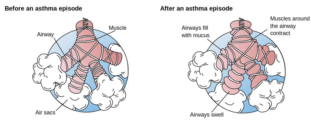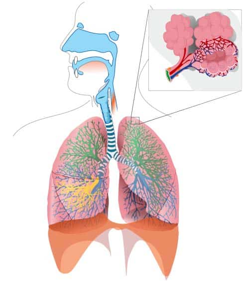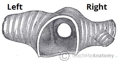 The Tracheobronchial Tree - Podcast Version TeachMeAnatomy 0:00 / 0:00 1x 0.25x 0.5x 0.75x 1x 1.25x 1.5x 1.75x 2x The trachea, bronchi and bronchioles form the tracheobronchial tree – a system of airways that allow passage of air into the lungs, where gas exchange occurs. These airways are located in the neck and thorax. In this article we will look at the anatomical position, structure and neurovascular supply of the airways; as well as considering their clinical relevance. Pro Feature - 3D Model You've Discovered a Pro Feature Access our 3D Model Library Explore, cut, dissect, annotate and manipulate our 3D models to visualise anatomy in a dynamic, interactive way. Learn More The Trachea Anatomical Position The trachea marks the beginning of the tracheobronchial tree. It arises at the lower border of cricoid cartilage in the neck, as a continuation of the larynx. It travels inferiorly into the superior mediastinum, bifurcating at the level of the sternal angle (forming the right and left main bronchi). As it descends, the trachea is located anteriorly to the oesophagus, and inclines slightly to the right. By Bibi Saint-Pol [CC BY-SA 3.0], via Wikimedia Commons Fig 1Overview of the tracheobronchial tree. Key: Green – upper lobe, yellow – middle lobe, blue – lower lobe Structure The trachea, like all of the larger respiratory airways, is held open by cartilage – here in C-shaped rings. The free ends of these rings are supported by the trachealis muscle. The trachea and bronchi are lined by ciliated pseudostratified columnar epithelium, interspersed by goblet cells, which produce mucus. The combination of sweeping movements by the cilia and mucus from the goblet cells forms the functional mucociliary escalator. This acts to trap inhaled particles and pathogens, moving them up out of the airways to be swallowed and destroyed. At the bifurcation of the primary bronchi, a ridge of cartilage called the carina runs anteroposteriorly between the openings of the two bronchi. This is the most sensitive area of the trachea for triggering the cough reflex, and can be seen on bronchoscopy. Neurovascular Supply The trachea receives sensory innervation from the recurrent laryngeal nerve. Arterial supply comes from the tracheal branches of the inferior thyroid artery, while venous drainage is via the brachiocephalic, azygos and accessory hemiazygos veins. Pro Feature - Dissection Atlas Contents of the superior mediastinum. Contents of the superior mediastinum. You've Discovered a Pro Feature Access our Dissection Image Library Enhance your understanding with high-resolution dissection images showcasing real-life anatomy. Learn More Bronchi At the level of the sternal angle, the trachea bifurcates into the right and left main bronchi. They undergo further branching to produce the secondary bronchi. Each secondary bronchi supplies a lobe of the lung, and gives rise to several segmental bronchi. Along with branches of the pulmonary artery and veins, the main bronchi make up the roots of the lungs. Structure Right main bronchus – wider, shorter, and descends more vertically than its left-sided counterpart. Clinically, this results in a higher incidence of foreign body inhalation. The right superior lobar bronchus arises before the right main bronchus enters the hilum. Left main bronchus – passes inferiorly to the arch of the aorta, and anteriorly to the thoracic aorta and oesophagus in order to reach the hilum of the left lung. Within the lungs, the main (primary) bronchi branch into lobar (secondary) bronchi. Each secondary bronchi supplies a lobe of the lung, thus there are 3 right lobar bronchi and 2 left. The lobar bronchi then bifurcate into several segmental (tertiary) bronchi, each of which supplies a bronchopulmonary segment. Bronchopulmonary segments are subdivisions of the lung lobes, and act as the functional unit of the lungs. The structure of bronchi are very similar to that of the trachea, though differences are seen in the shape of their cartilage. In the main bronchi, cartilage rings completely encircle the lumen. However in the smaller lobar and segmental bronchi cartilage is found only in crescent shapes. Neurovascular Supply The bronchi derive innervation from pulmonary branches of the vagus nerve (CN X). Blood supply to the bronchi is from branches of the bronchial arteries, while venous drainage is into the bronchial veins. By TeachMeSeries Ltd (2025) Fig 2Transverse section of the trachea, showing its bifurcation. By TeachMeSeries Ltd (2025) Fig 3The trachea and bronchi. Bronchioles The segmental bronchi undergo further branching to form numerous smaller airways – the bronchioles. Structure The smallest airways, bronchioles do not contain any cartilage or mucus-secreting goblet cells. Instead, club cells produce a surfactant lipoprotein which is instrumental in preventing the walls of the small airways sticking together during expiration. Initially there are many generations of conducting bronchioles, which transport air but lack glands and are not involved in gas exchange. Conducting bronchioles then eventually end as terminal bronchioles. These terminal bronchioles branch even further into respiratory bronchioles, which are distinguishable by the presence of alveoli extending from their lumens. Alveoli are tiny air-filled pockets with thin walls (simple squamous epithelium), and are the sites of gaseous exchange in the lungs. Altogether there are around 300 million alveoli in adult lungs, providing a large surface area for adequate gas exchange. Clinical Correlations: Asthma Asthma is a chronic inflammatory disorder of the airways, characterised by hypersensitivity, reversible outflow obstruction and bronchospasm. There is remodelling of the small airways, causing increased smooth muscle thickness around the bronchioles, damaged epithelium and a thickened basement membrane. “Asthma attacks” are acute exacerbations of the condition whereby a trigger (e.g. allergen