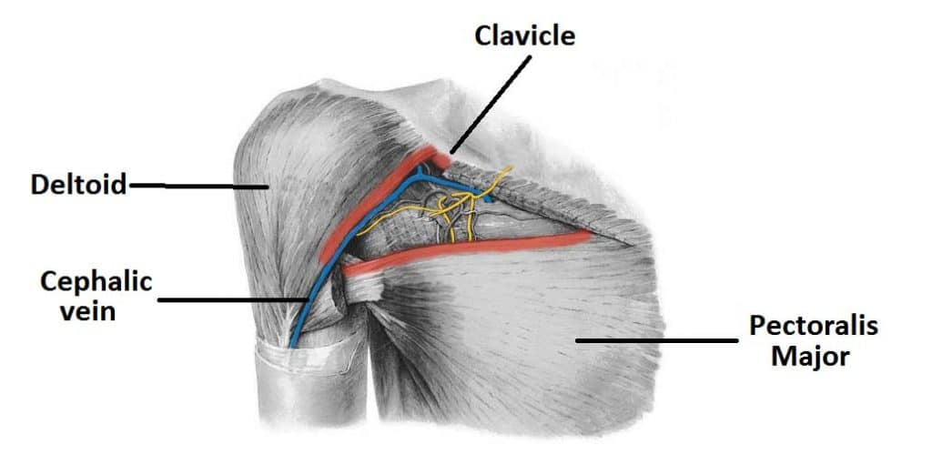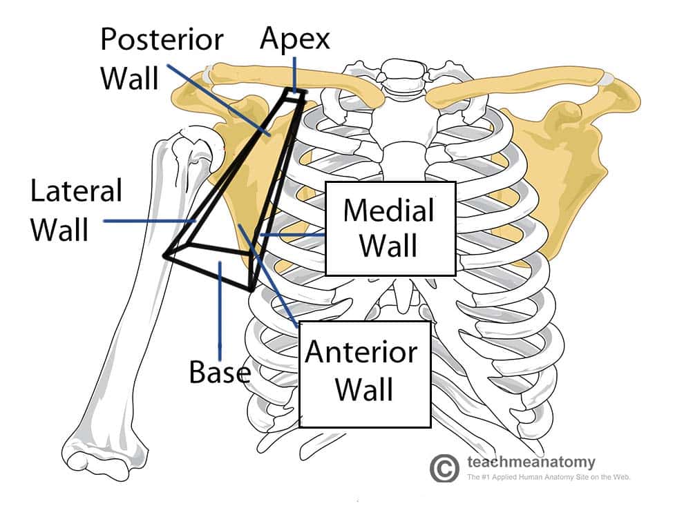 The Axilla Region - Podcast Version TeachMeAnatomy 0:00 / 0:00 1x 0.25x 0.5x 0.75x 1x 1.25x 1.5x 1.75x 2x The axilla is the name given to an area that lies underneath the glenohumeral joint, at the junction of the upper limb and the thorax. It is a passageway by which neurovascular and muscular structures can enter and leave the upper limb. In this article, we shall examine the anatomy of the axilla – the borders, contents, and any clinical correlations. By TeachMeSeries Ltd (2025) Fig 1Anterior view of the right axilla region. Note the pyramidal shape, with 6 borders (or sides). Pro Feature - 3D Model You've Discovered a Pro Feature Access our 3D Model Library Explore, cut, dissect, annotate and manipulate our 3D models to visualise anatomy in a dynamic, interactive way. Learn More Borders The overall 3D shape of the axilla looks slightly like a pyramid. It consists of four sides, an open apex and base: Apex – also known as the axillary inlet, it is formed by lateral border of the first rib, superior border of scapula, and the posterior border of the clavicle. Lateral wall – formed by intertubercular groove of the humerus. Medial wall – consists of the serratus anterior and the thoracic wall (ribs and intercostal muscles). Anterior wall – contains the pectoralis major and the underlying pectoralis minor and the subclavius muscles. Posterior wall – formed by the subscapularis, teres major and latissimus dorsi. The size and shape of the axilla region varies with arm abduction. The apex decreases in size most markedly when the arm is fully abducted – leaving the contents of the axilla at risk of compression. By TeachMeSeries Ltd (2025) Fig 2Transverse section of the axilla region. Contents The contents of the axilla region include muscles, nerves, vessels, and lymphatics: Axillary artery (and branches) – the main artery supplying the upper limb. It is commonly referred as having three parts; one medial to the pectoralis minor, one posterior to pectoralis minor, and one lateral to pectoralis minor. The medial and posterior parts travel in the axilla. Axillary vein (and tributaries) – the main vein draining the upper limb, its two largest tributaries are the cephalic and basilic veins. Brachial plexus (and branches) – a collection of spinal nerves that form the peripheral nerves of the upper limb. Axillary lymph nodes – they filter lymphatic fluid that has drained from the upper limb and pectoral region. Axillary lymph node enlargement is a non-specific indicator of breast cancer. Biceps brachii (short head) and coracobrachialis – these muscle tendons move through the axilla, where they attach to the coracoid process of the scapula. By TeachMeSeries Ltd (2025) Fig 3Contents of the axilla region. Passageways Exiting the Axilla There are three main routes by which structures leave the axilla. The main route of exit is immediately inferiorly and laterally, into the upper limb. The majority of contents of the axilla region leave by this method. Another pathway is via the quadrangular space. This is a gap in the posterior wall of the axilla, allowing access to the posterior arm and shoulder area. Structures passing through include the axillary nerve and posterior circumflex humeral artery (a branch of the axillary artery. The last passageway is the clavipectoral triangle, which is an opening in the anterior wall of the axilla. It is bounded by the pectoralis major, deltoid, and clavicle. The cephalic vein enters the axilla via this triangle, while the medial and lateral pectoral nerves leave. By TeachMeSeries Ltd (2025) Fig 4Boundaries and contents of the clavipectoral triangle By TeachMeSeries Ltd (2025) Fig 5Posterior view of the shoulder region, showing the quadrangular space. The subscapularis muscle lies anteriorly, and so cannot be seen. Clinical Relevance Thoracic Outlet Syndrome The apex of the axilla region is an opening between the clavicle, first rib and the scapula. In this apex, the vessels and nerves may become compressed between the bones – this is called thoracic outlet syndrome. Common causes of thoracic outlet syndrome include: Trauma – e.g. fractured clavicle. Repetitive movements – seen commonly in occupations that require lifting of the arms. Cervical rib – an extra rib which arises from the seventh cervical vertebra. It often presents with pain in the affected limb (the distribution of pain is dependent on which nerve is compressed), tingling, muscle weakness and discolouration. Lymph Node Biopsy Approximately 75% of lymph from the breast drains into the axilla lymph nodes, so can be biopsied if breast cancer is suspected. If breast cancer is confirmed, the axillary nodes may need to be removed to prevent the cancer spreading. This is known as axillary clearance. During this procedure, the long thoracic nerve may become damaged, resulting in winged scapula. Do you think you’re ready? Take the quiz below Pro Feature - Quiz The Axilla Region Question 1 of 3 Submitting... Skip Next Rate question: You scored 0% Skipped: 0/3 1800 More Questions Available Upgrade to TeachMeAnatomy Pro Challenge yourself with over 1800 multiple-choice questions to reinforce learning Learn More Rate This Article