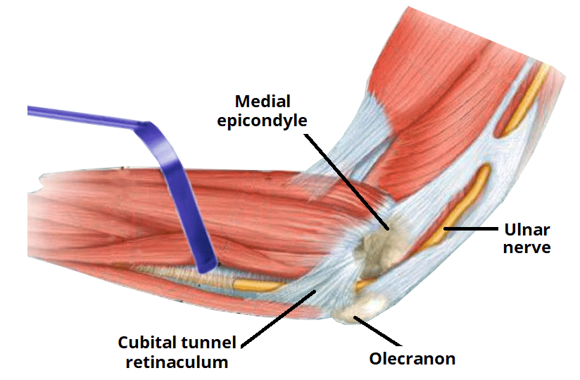 The Ulnar Tunnel - Podcast Version TeachMeAnatomy 0:00 / 0:00 1x 0.25x 0.5x 0.75x 1x 1.25x 1.5x 1.75x 2x The ulnar (cubital) tunnel is a fibro-osseous space located on the posteromedial aspect of the elbow. It transmits the ulnar nerve from the arm into the forearm. In this article, we shall look at the anatomy of the ulnar tunnel – its borders, contents and clinical correlations. Adapted from work by S Bhimji MD [CC BY 4.0] via Wikimedia Commons Fig 1The right ulnar tunnel. lt is a small space located on the posterior aspect of the elbow. Pro Feature - 3D Model You've Discovered a Pro Feature Access our 3D Model Library Explore, cut, dissect, annotate and manipulate our 3D models to visualise anatomy in a dynamic, interactive way. Learn More Borders The ulnar tunnel is oval shaped with medial and lateral walls, a floor, and a roof: Medial wall – medial epicondyle of the humerus. Lateral wall – olecranon of the ulna. Floor – elbow joint capsule and medial collateral ligament of the elbow. Roof – ligament spanning between the medial epicondyle and olecranon The ligament forming the roof of the cubital tunnel is also known as the cubital tunnel retinaculum or the arcuate ligament of Osbourne. It is a band of fascia which runs between the ulnar and humeral heads of the flexor carpi ulnaris. Contents The ulnar tunnel transmits the ulnar nerve – a major peripheral nerve of the upper limb. After passing through this space, the ulnar nerve travels between the two heads of the flexor carpi ulnaris and continues into the forearm and hand. Clinical Relevance Cubital Tunnel Syndrome Cubital tunnel syndrome refers to compression of the ulnar nerve within the ulnar tunnel. It is the second most common peripheral neuropathy of the upper limb (after carpel tunnel syndrome). Patients may experience altered sensation in the sensory distribution of the ulnar nerve – the medial one and half fingers and the associated palm area. The motor function of the nerve can also be affected in severe disease, causing weakness and wasting of the intrinsic hand muscles (lumbricals, interossei, hypothenar eminence, adductor pollicis). During elbow flexion, the shape of the cubital tunnel changes from oval to elliptical and the pressure increases. Therefore, this position tends to exacerbate the patient’s symptoms. Adobe Stock, Licensed to TeachMeSeries Ltd Fig 2Cubital tunnel syndrome results from the compression of the ulnar nerve within the ulnar/cubital tunnel. Do you think you’re ready? Take the quiz below Pro Feature - Quiz The Ulnar Tunnel Question 1 of 3 Submitting... Skip Next Rate question: You scored 0% Skipped: 0/3 1800 More Questions Available Upgrade to TeachMeAnatomy Pro Challenge yourself with over 1800 multiple-choice questions to reinforce learning Learn More Rate This Article