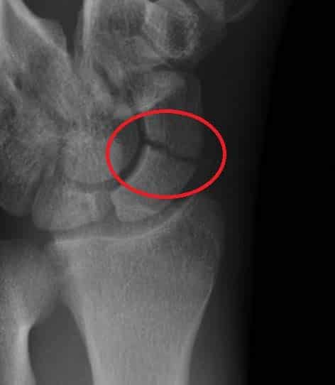 The scaphoid is at particular risk of avascular necrosis after fracture because of its so-called ‘retrograde blood supply’ which enters at its distal end. This means that a fracture to the middle (or ‘waist’) of the scaphoid may interrupt the blood supply to the proximal part of the scaphoid bone rendering it avascular.