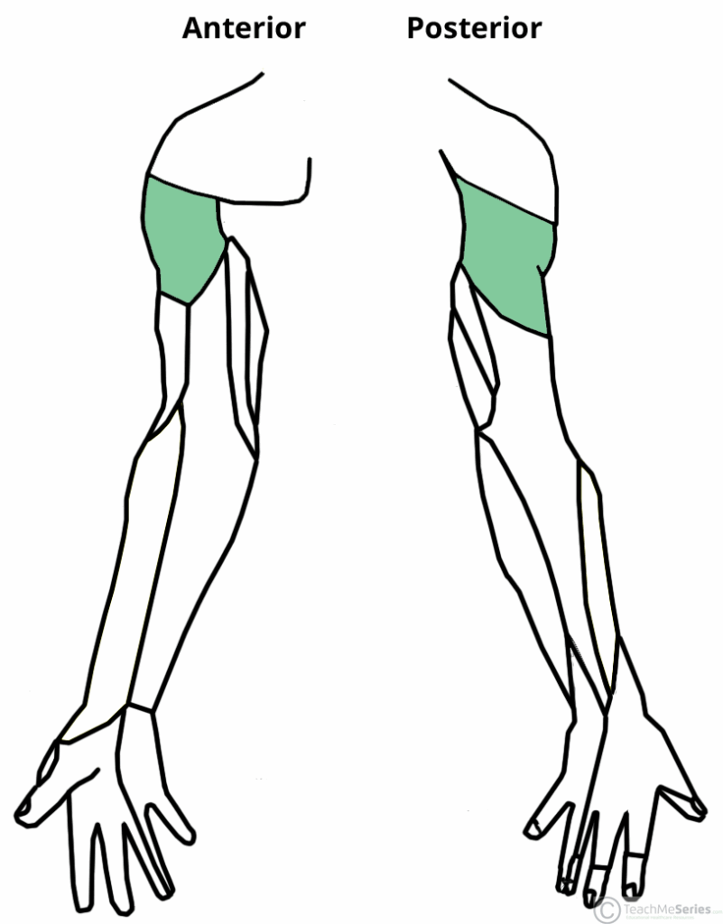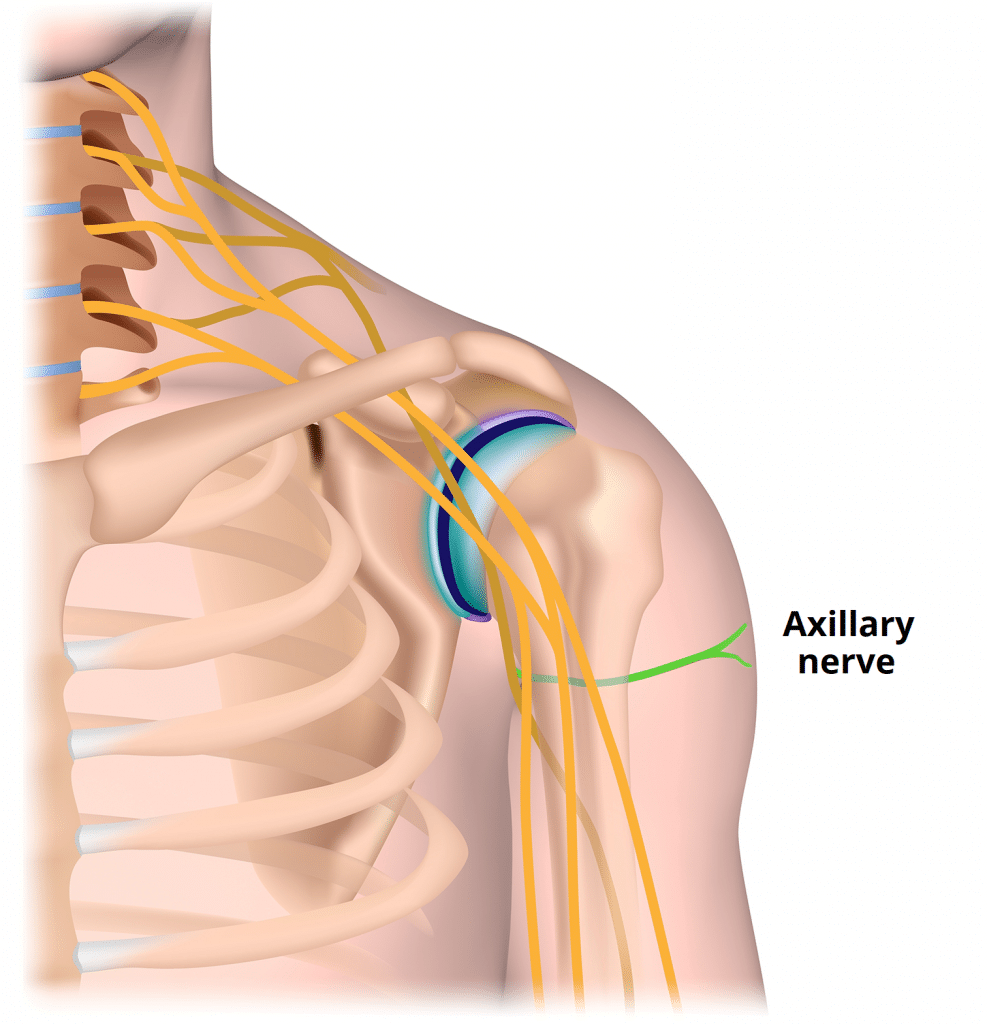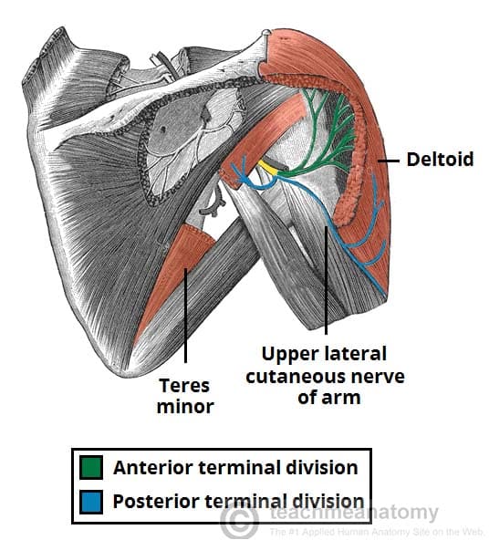 The Axillary Nerve - Podcast Version TeachMeAnatomy 0:00 / 0:00 1x 0.25x 0.5x 0.75x 1x 1.25x 1.5x 1.75x 2x The axillary nerve is a major peripheral nerve of the upper limb. In this article, we shall look at the anatomy of the axillary nerve – its anatomical course, motor and sensory functions, and any clinical correlations. Pro Feature - 3D Model You've Discovered a Pro Feature Access our 3D Model Library Explore, cut, dissect, annotate and manipulate our 3D models to visualise anatomy in a dynamic, interactive way. Learn More Overview Spinal roots: C5 and C6. Sensory functions: Gives rise to the upper lateral cutaneous nerve of arm, which innervates the skin over the lower deltoid (‘regimental badge area’). Motor functions: Innervates the teres minor and deltoid muscles. Adobe Stock, Licensed to TeachMeSeries Ltd Fig 1Overview of the course of the axillary nerve. Pro Feature - Dissection Atlas Prosection of the brachial plexus, demonstrating the posterior cord and its branches (medial and lateral cords retracted) Prosection of the brachial plexus, demonstrating the posterior cord and its branches (medial and lateral cords retracted) You've Discovered a Pro Feature Access our Dissection Image Library Enhance your understanding with high-resolution dissection images showcasing real-life anatomy. Learn More Anatomical Course The axillary nerve is formed within the axilla area of the upper limb. It is a direct continuation of the posterior cord from the brachial plexus – and therefore contains fibres from the C5 and C6 nerve roots. In the axilla, the axillary nerve is located posterior to the axillary artery and anterior to the subscapularis muscle. It exits the axilla at the inferior border of subscapularis via the quadrangular space, often accompanied by the posterior circumflex humeral artery and vein. The axillary nerve then passes medially to the surgical neck of the humerus, where it divides into three terminal branches: Posterior terminal branch – provides motor innervation to the posterior aspect of the deltoid muscle and teres minor. It also innervates the skin over the inferior part of the deltoid as the upper lateral cutaneous nerve of the arm. Anterior terminal branch – winds around the surgical neck of the humerus and provides motor innervation to the anterior aspect of the deltoid muscle. It terminates with cutaneous branches to the anterior and anterolateral shoulder. Articular branch – supplies the glenohumeral joint By TeachMeSeries Ltd (2025) Fig 2The anterior and posterior divisions of the axillary nerve The Quadrangular Space The quadrangular space is a gap in the muscles of the posterior scapular region. It is a pathway for neurovascular structures to move from the axilla anteriorly to the posterior shoulder and arm. It is bounded by: Superior – inferior aspect of teres minor Inferior – superior aspect of teres major Lateral – surgical neck of humerus. Medial – long head of triceps brachii Anterior – subscapularis The axillary nerve and posterior circumflex humeral artery and vein pass through the quadrangular space. These structures can be compressed as a result of trauma, muscle hypertrophy or space occupying lesion; resulting in weakness of the deltoid and teres minor. This is particularly common in athletes who perform overhead activities. By TeachMeSeries Ltd (2025) Fig 3Posterior view of the shoulder region, showing the quadrangular space. The subscapularis muscle lies anteriorly, and so cannot be seen. Motor Functions The axillary nerve innervates teres minor and deltoid muscles. Teres minor – part of the rotator cuff muscles which act to stabilise the glenohumeral joint. It acts to externally rotate the shoulder joint and is innervated by the posterior terminal branch of the axillary nerve. Deltoid – situated at the superior aspect of the shoulder. It performs abduction of the upper limb at the glenohumeral joint and is innervated by the anterior terminal branch of the axillary nerve. NB: There is some evidence from research on cadavers that the axillary nerve can also innervate the lateral head of triceps brachii muscle. Sensory Functions The sensory component of the axillary nerve is delivered via its posterior terminal branch. After the posterior terminal branch of the axillary nerve has innervated the teres minor, it continues as the upper lateral cutaneous nerve of the arm. It innervates the skin over the inferior portion of the deltoid (the ‘regimental badge area’). In a patient with axillary nerve damage, sensation at the regimental badge area may be impaired or absent. The patient may also report paraesthesia (pins and needles) in the distribution of the axillary nerve. By TeachMeSeries Ltd (2025) Fig 4The sensory innervation of the axillary nerve – known as the regimental badge area. Clinical Relevance Injury to the Axillary Nerve The axillary nerve can be damaged through trauma to the proximal humerus or shoulder girdle. It often presents with other brachial plexus injuries. Common mechanisms of injury include fracture of the humeral surgical neck, shoulder dislocation or iatrogenic injury during shoulder surgery. Motor functions – the deltoid and teres minor muscles will be affected, rendering the patient unable to abduct the affected limb beyond 15 degrees. Sensory functions – the upper lateral cutaneous nerve of arm will be affected, resulting in loss of sensation over the inferior deltoid (‘regimental badge area’). Clinical tests include deltoid extension lag and external rotation lag. Chronic lesions of the axillary nerve can result in permanent numbness at the lateral shoulder region, muscle atrophy, and neuropathic pain. Clinical Relevance Erb’s Palsy Erb’s palsy is a condition resulting from damage to the C5 and C6 roots of the brachial plexus. The axillary nerve is therefore affected, and the individual is usually unable to abduct or externally rotate at the shoulder. It commonly occurs where there